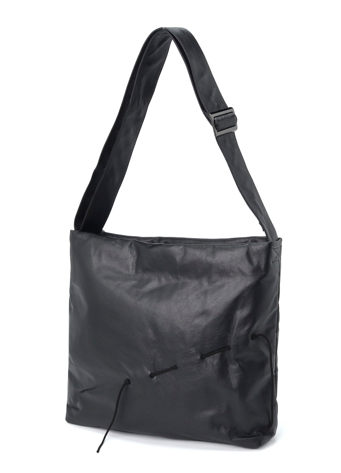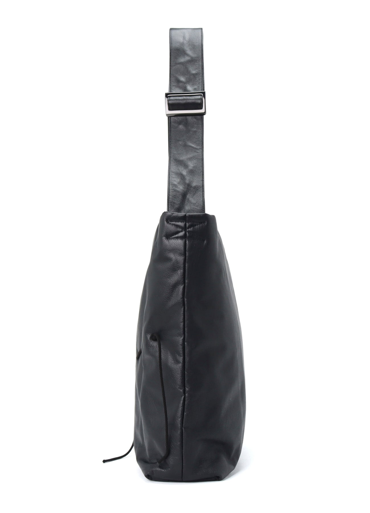 This shoulder bag, crafted from incredibly soft leather, allows for a drapery effect similar to fabric by adjusting the spindle (cord). Additionally, the padded body can be accentuated for a fuller appearance.