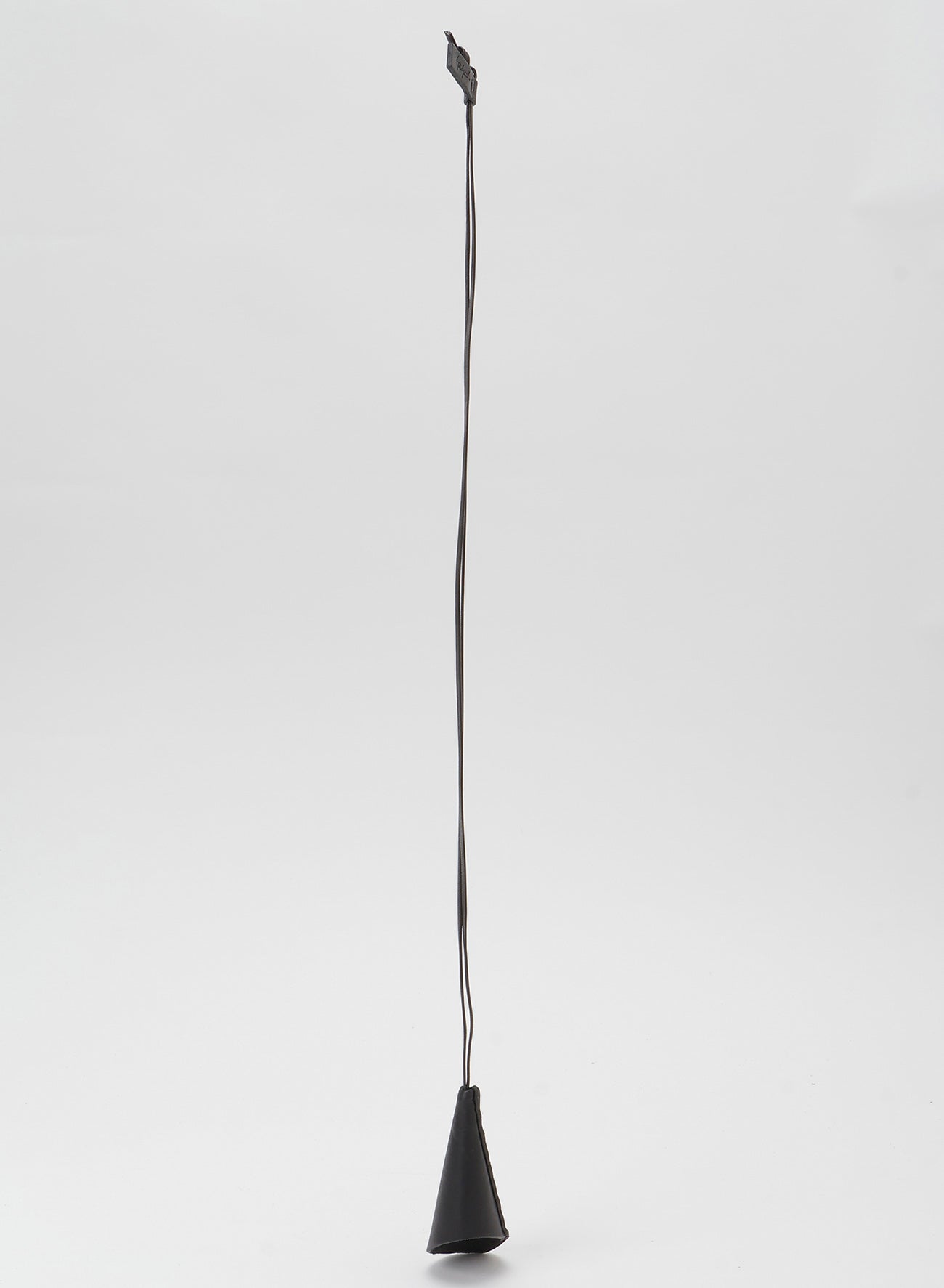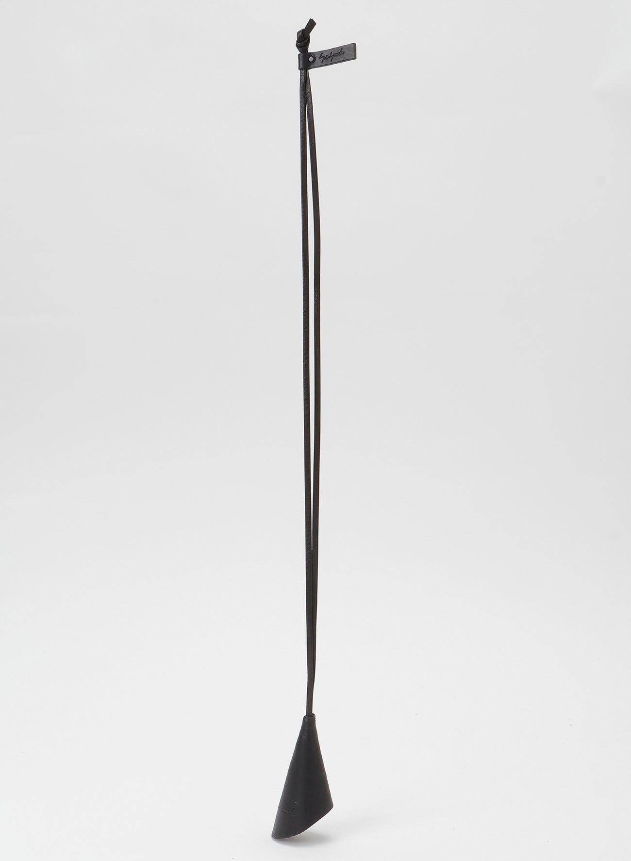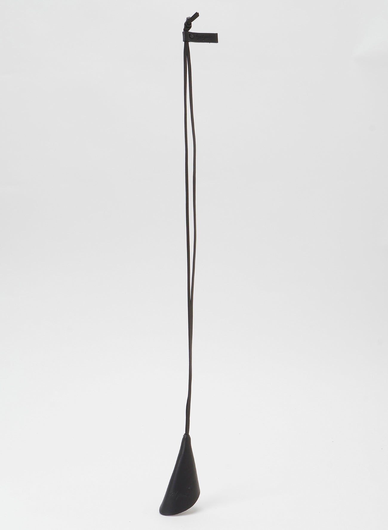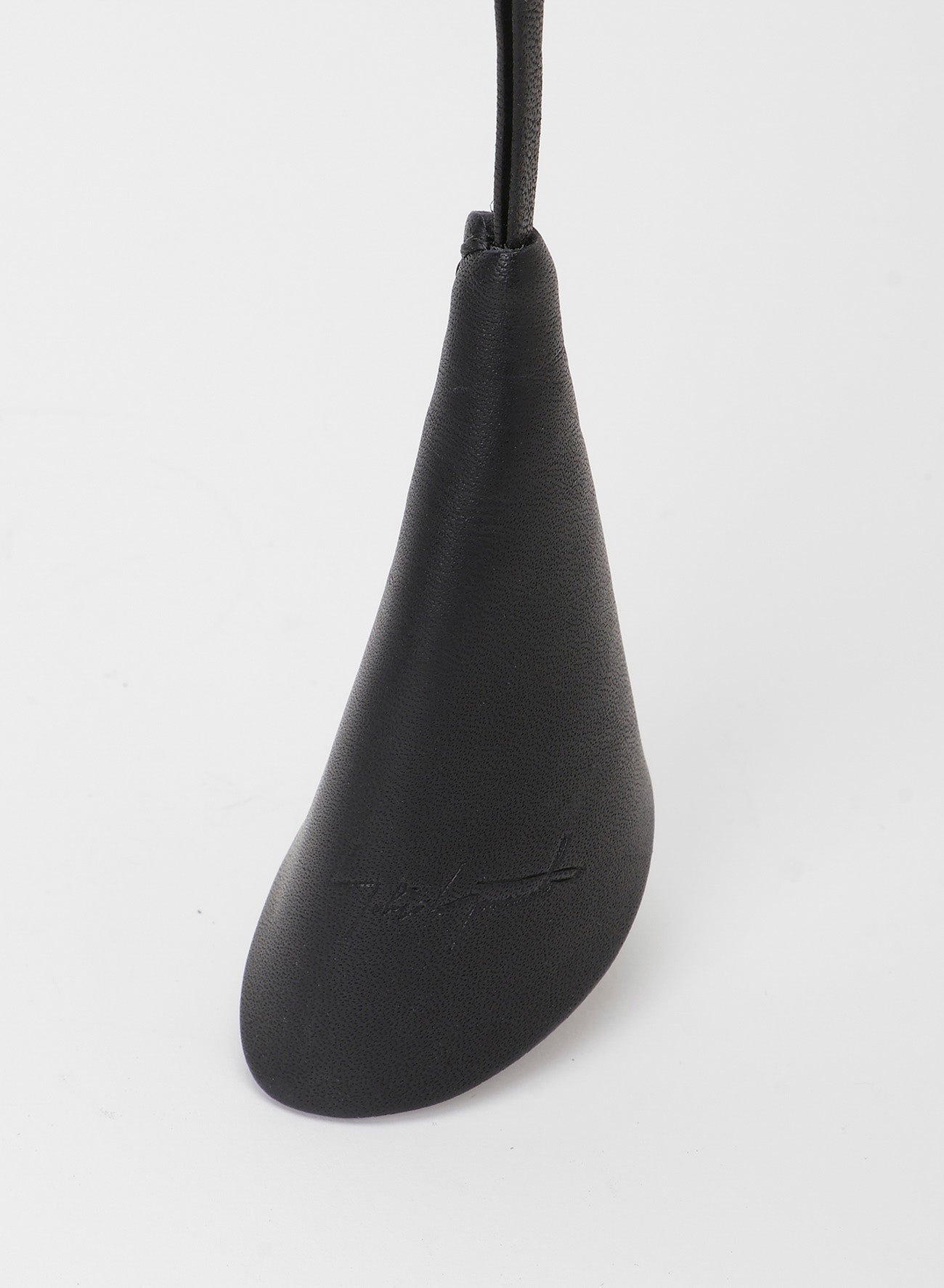 Hand-sewn by artisans, this asymmetric cowbell-shaped key necklace features a snap hook inside for key attachment. Pulling the key slides the leather strap, making it easy to retrieve. The signature tab allows for strap length adjustment. Crafted from vegetable tanned leather with a sophisticated shine.