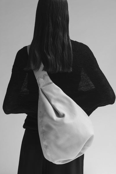 This medium-sized crossbody bag features a distinctive rounded shape with bold pleats at the top. The clasp can be repositioned for use on either shoulder. The zipper on the back enhances security. Made from vibrant Italian shrink leather, the bag offers both style and functionality.