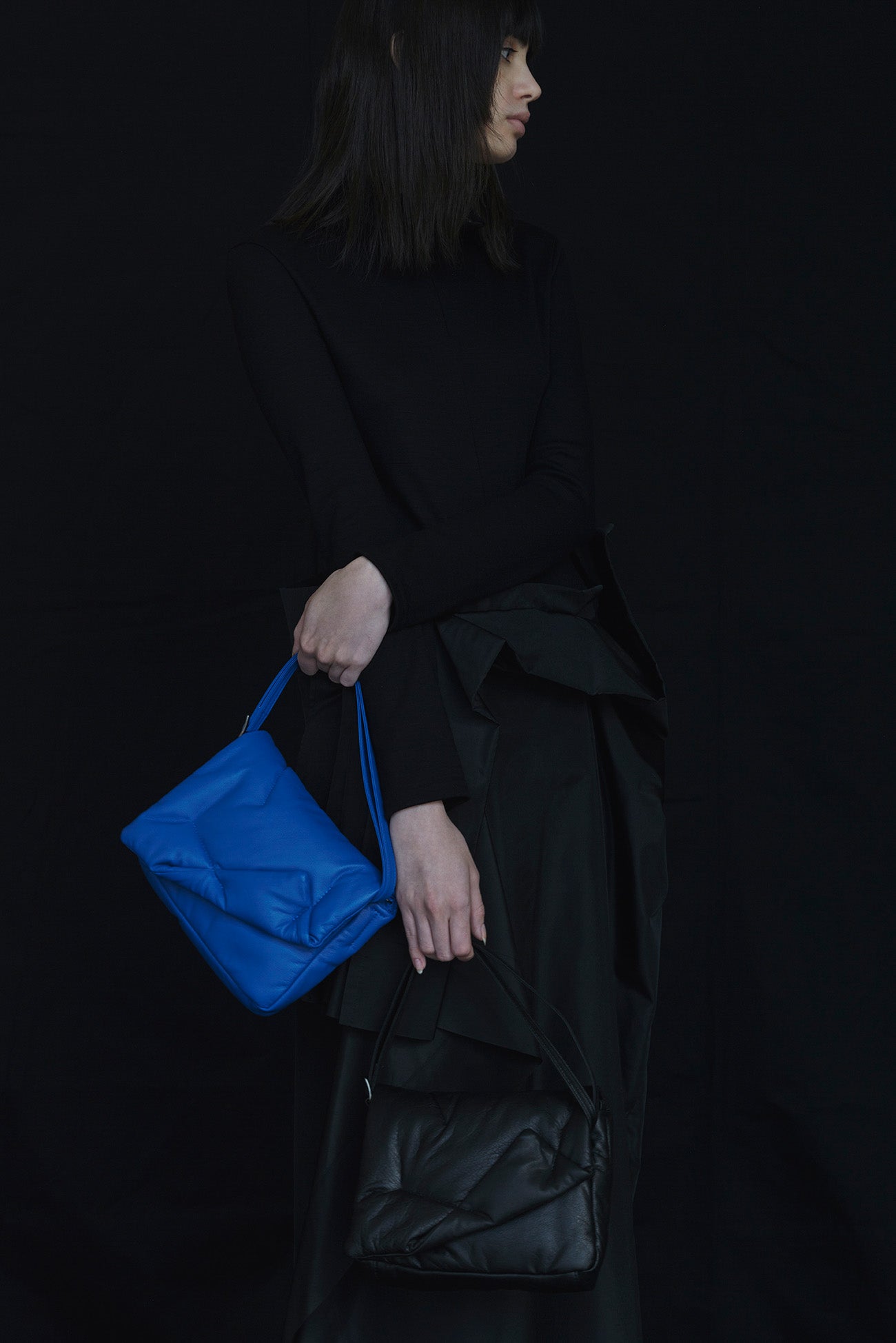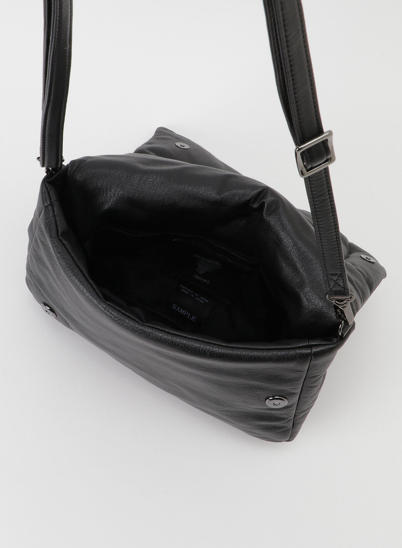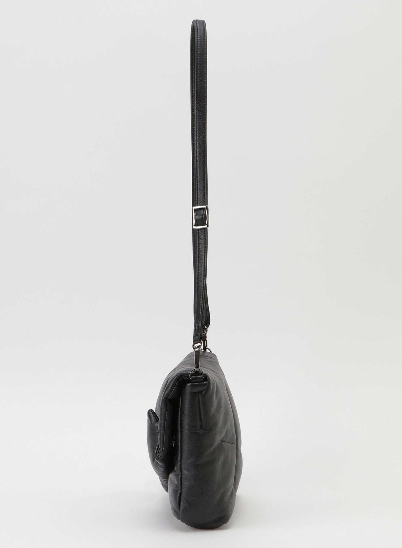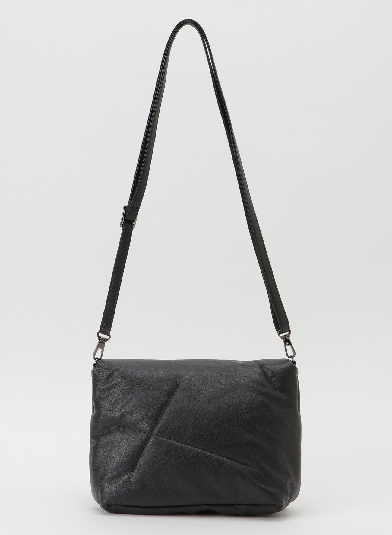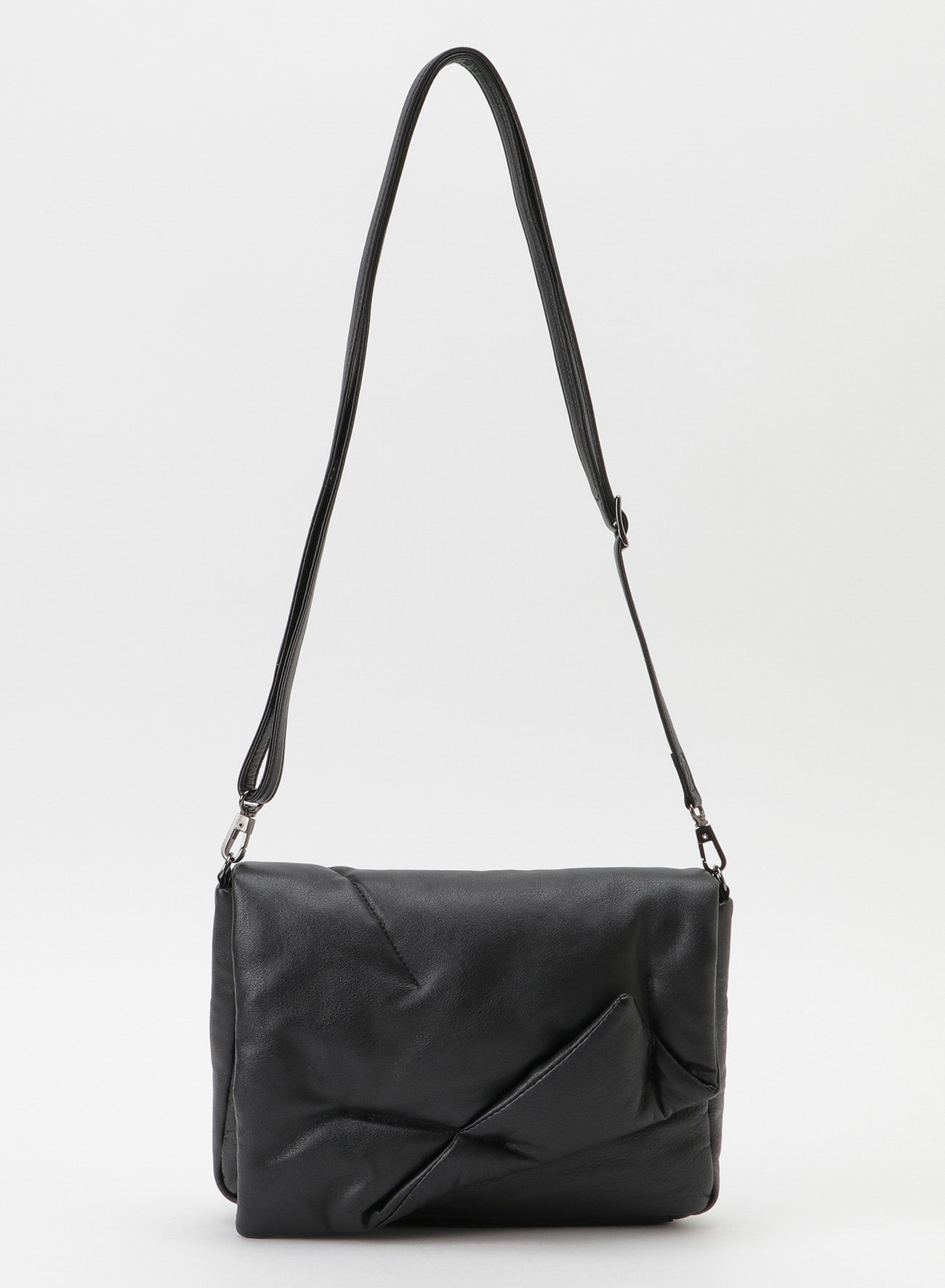 The "FLUFFY" flap, characterized by irregular stitching that encases the cotton, opens and closes via a central magnet. The body of the bag is made with a simple design. It features a detachable shoulder strap, allowing it to be used as a clutch bag.