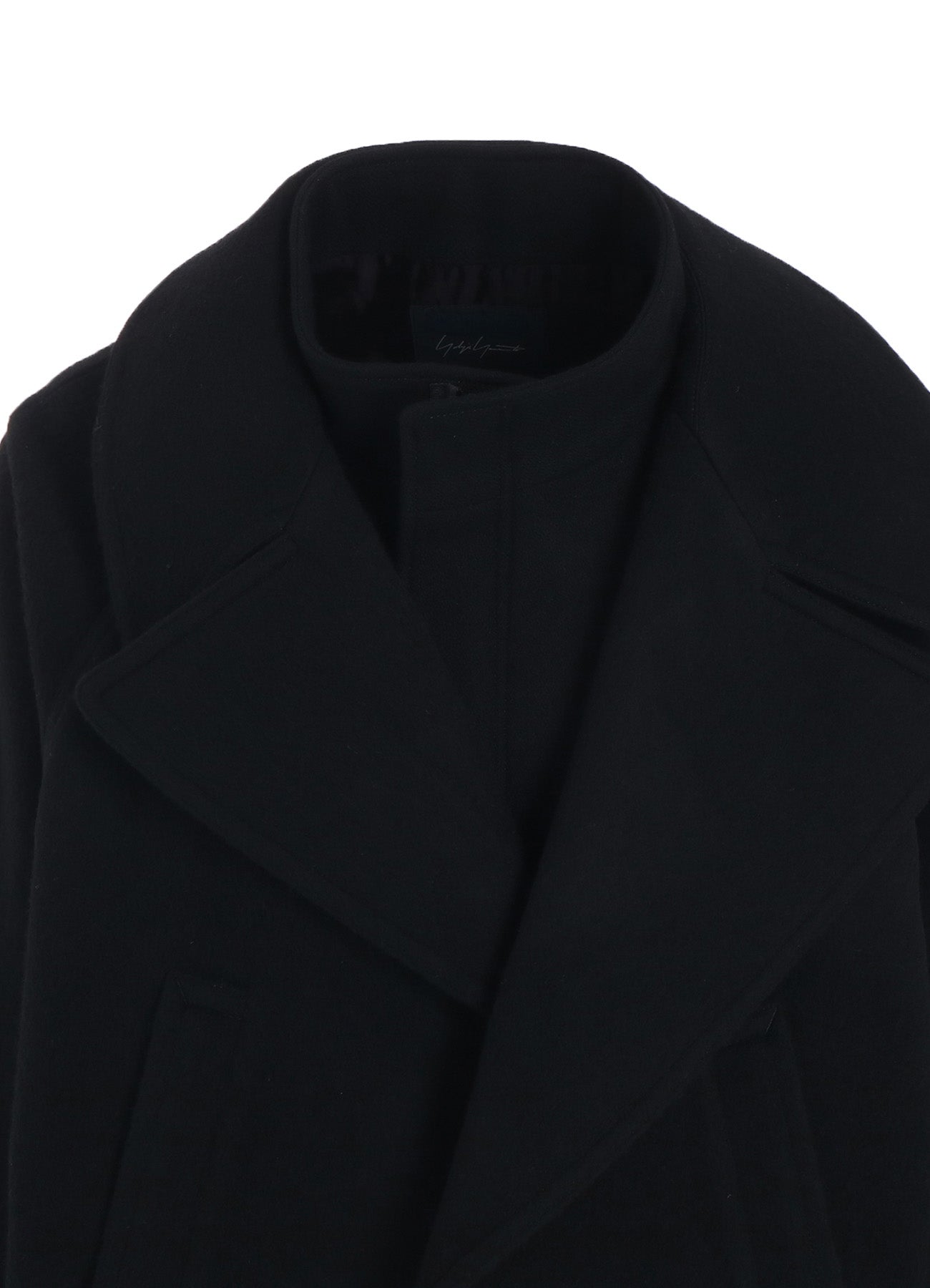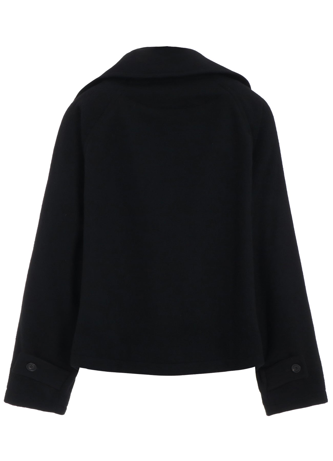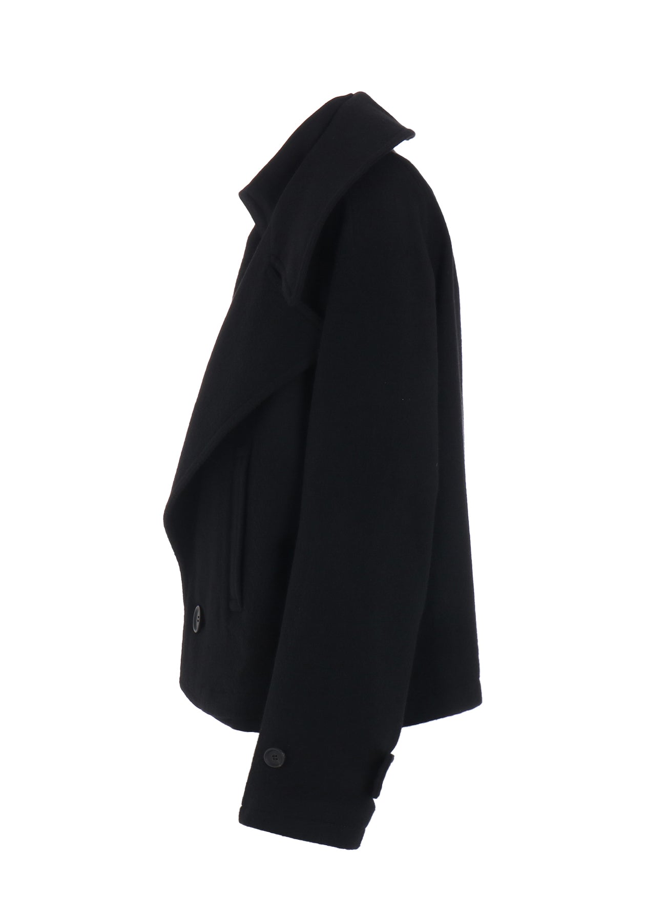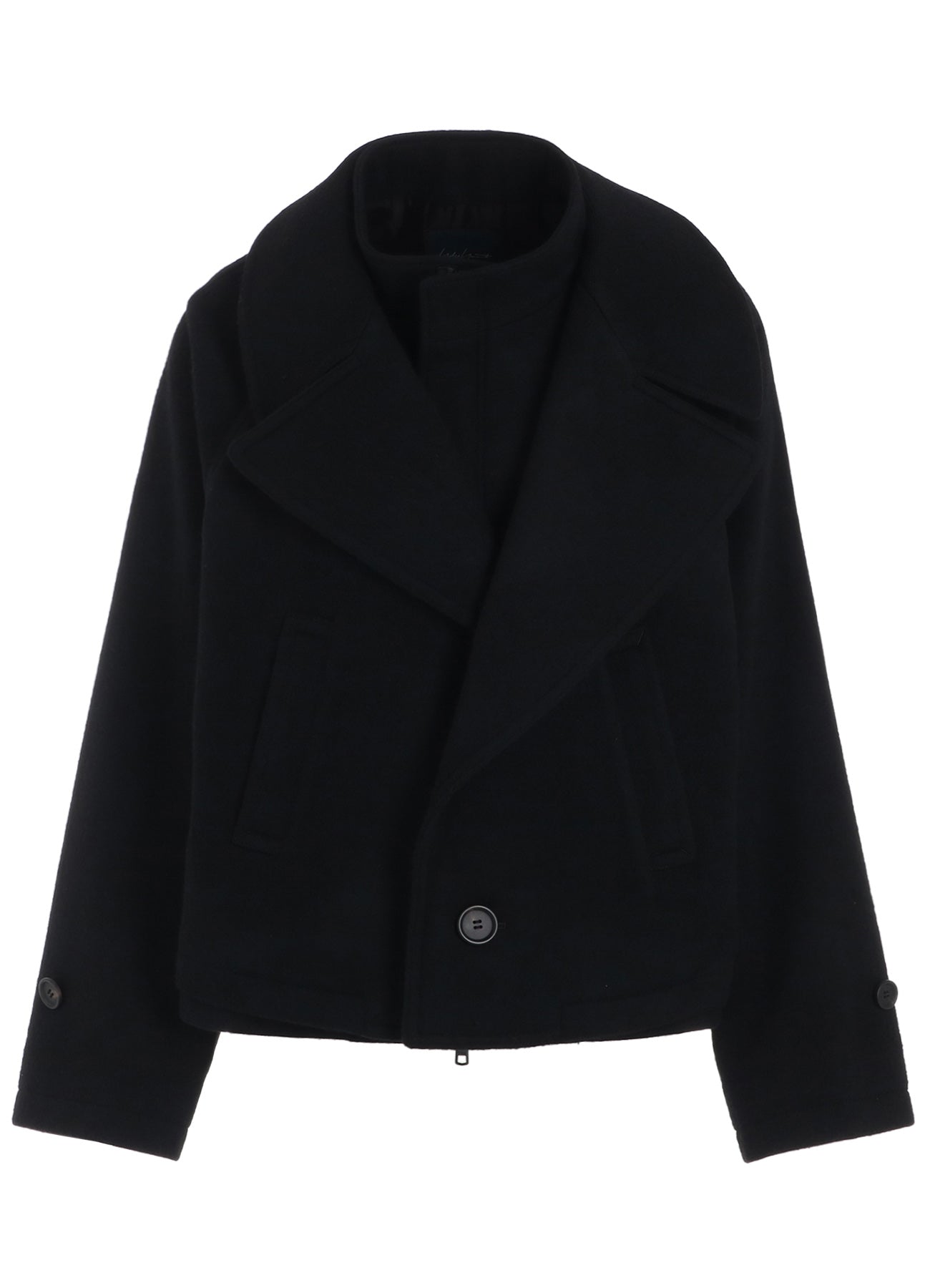 This short jacket features a soft melton wool fabric and a double collar design. The separate impression of the turtleneck and outer components attached at the side seams offers a refined look.