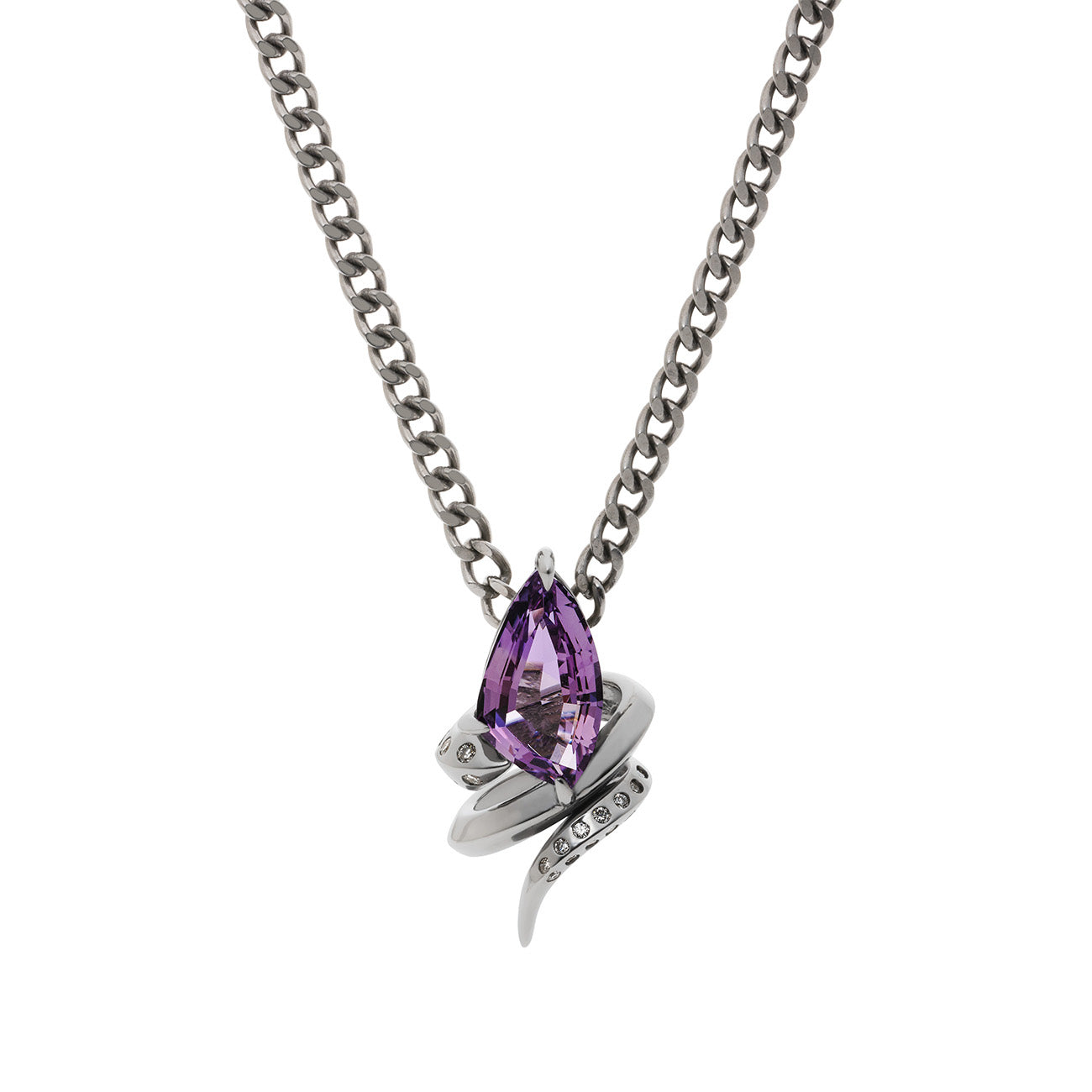 Inspired by the elegant curves and organic world created by nature, this jewelry collection features bold amethyst accents imagined as snake heads. The pieces beautifully embody this inspiration, resulting in stunning pendants.