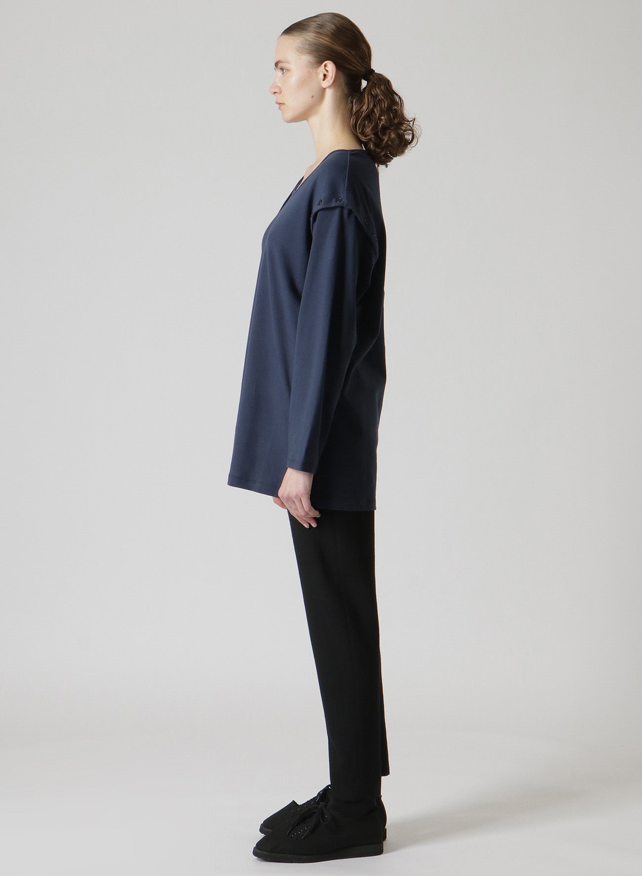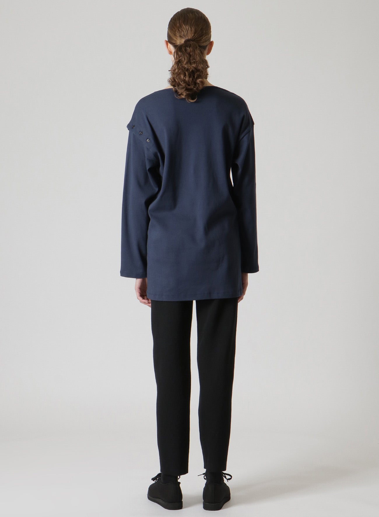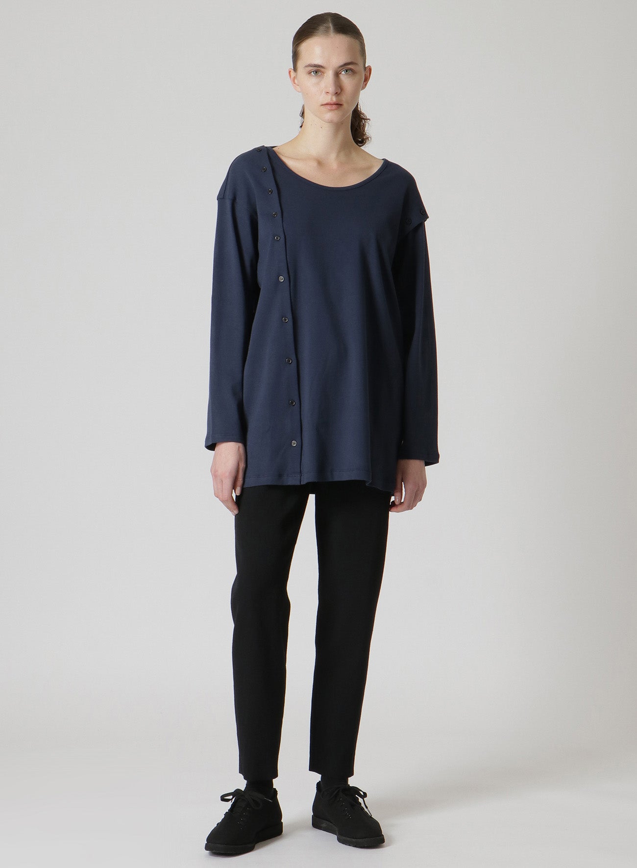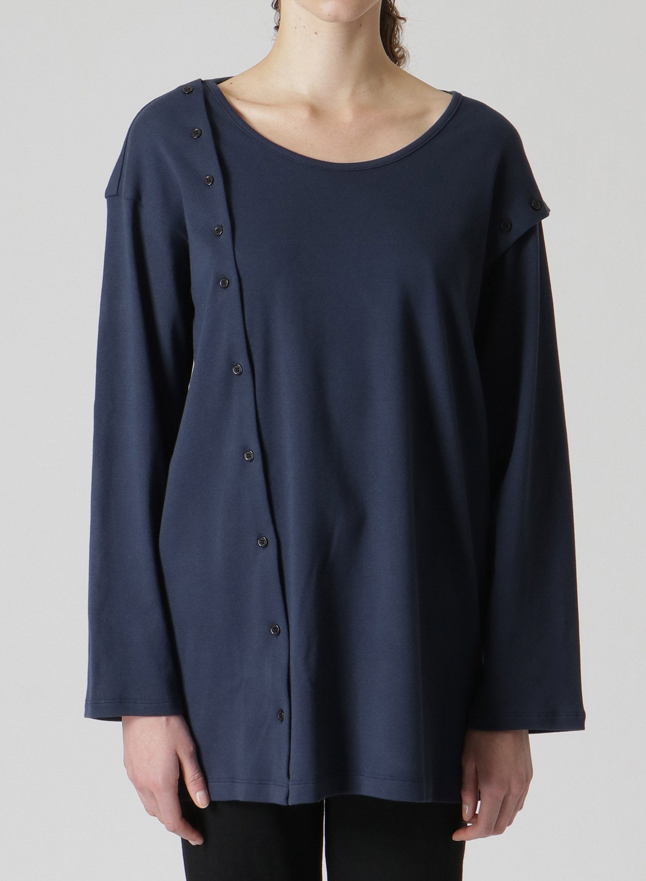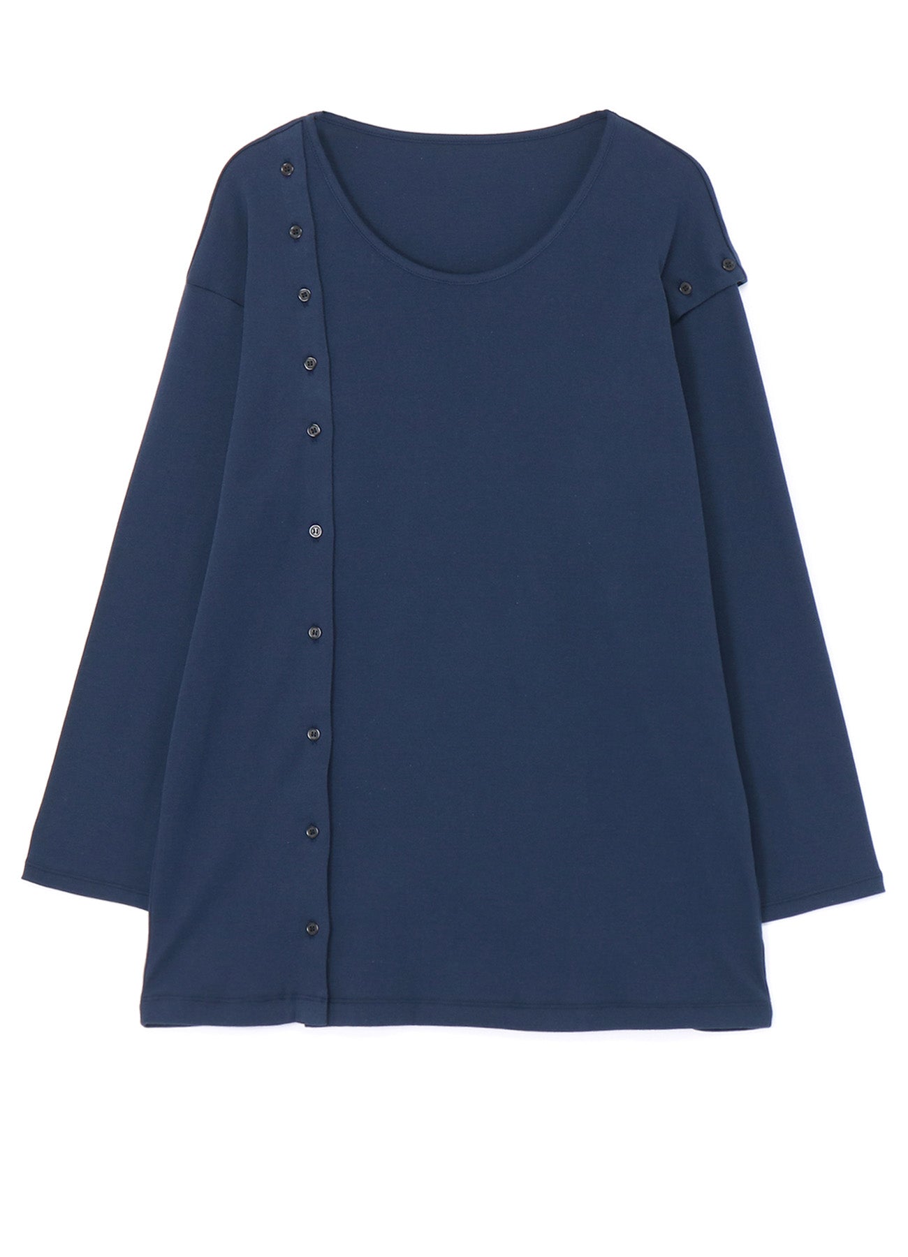 A stylish long-sleeve pullover featuring a striking use of buttons. Made from a soft, stretchy material, this item allows you to adjust the silhouette by opening or closing the buttons. It offers a relaxed fit and comfortable wear.