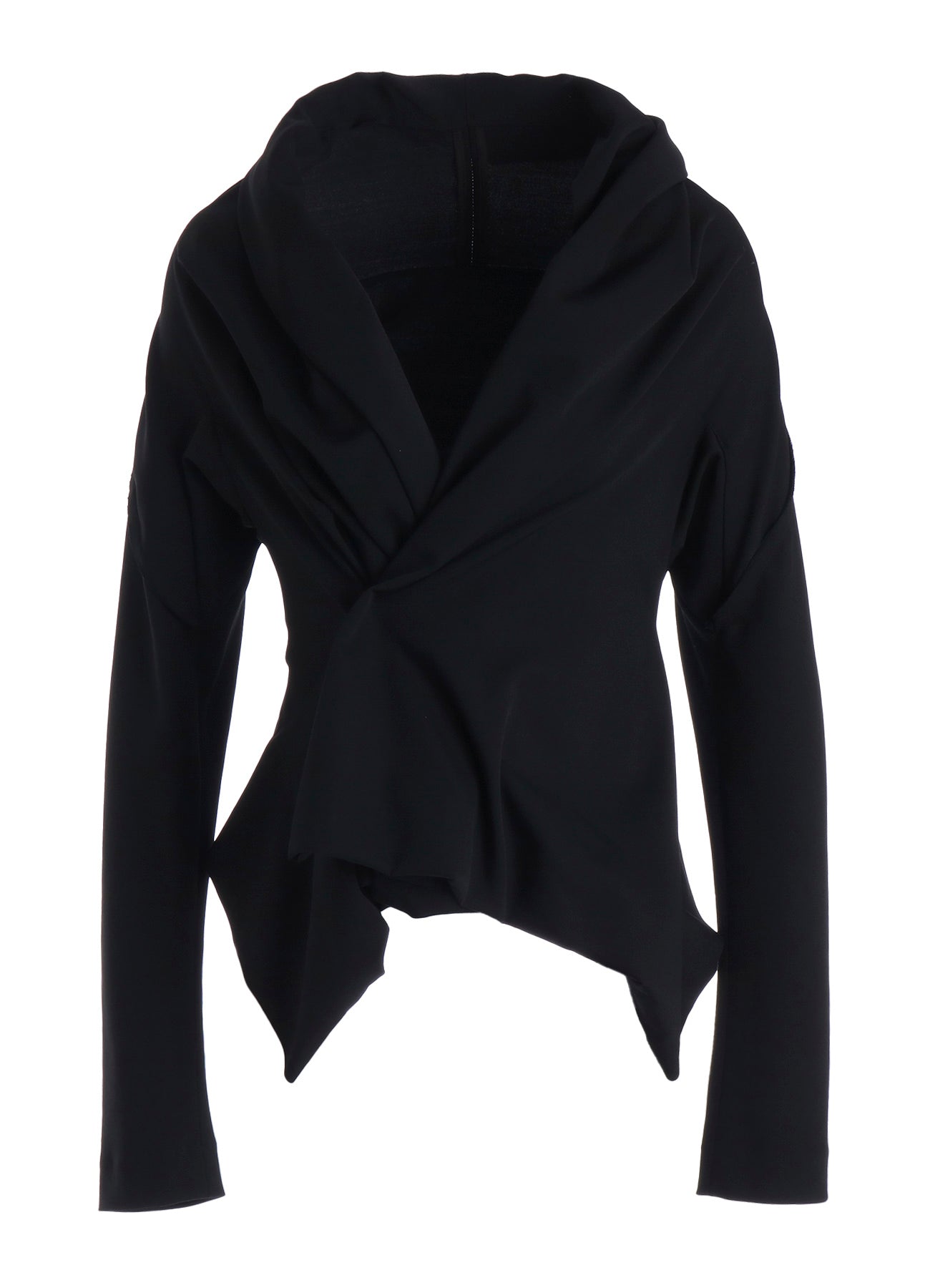 This thin wool gabardine shawl wrap jacket features dropped shoulders for a relaxed feel and a beautifully fitted waistline for graceful elegance. Pairing it with pants made from the same material offers a versatile outfit suitable for various occasions.
