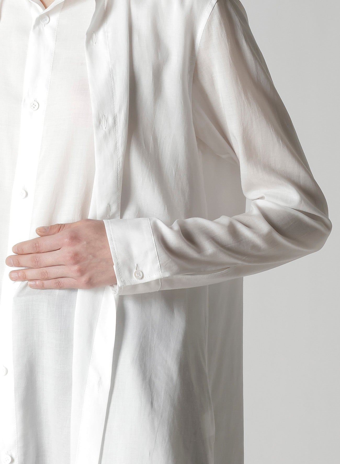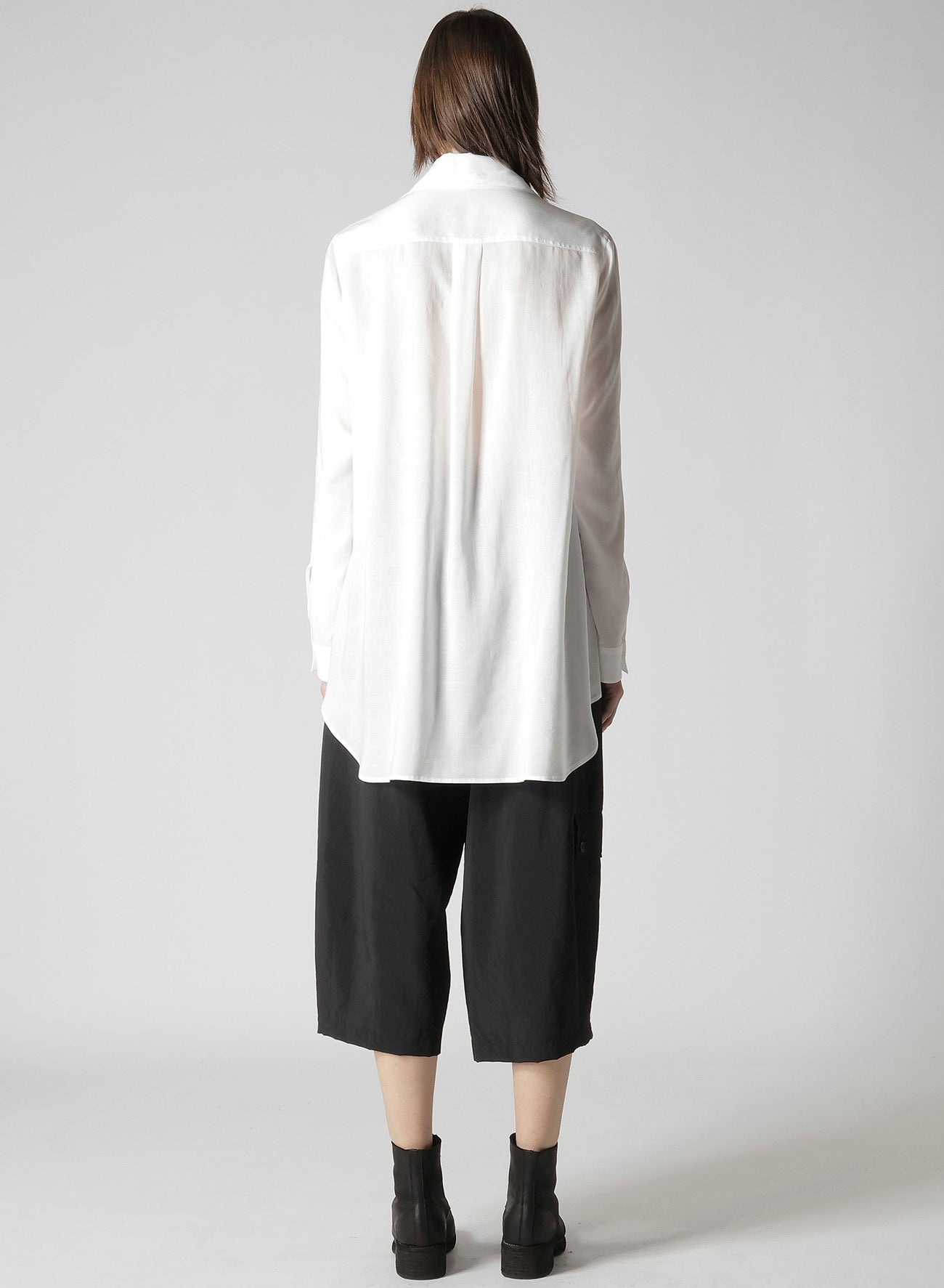 This blouse has a stunning drape and a double Front Placket. You can change its silhouette with the way you button it. The blouse boasts beautiful drapery and a puff, creating a lightweight and comfortable feel. Note that model images are sample items and actual goods may vary in size and texture.