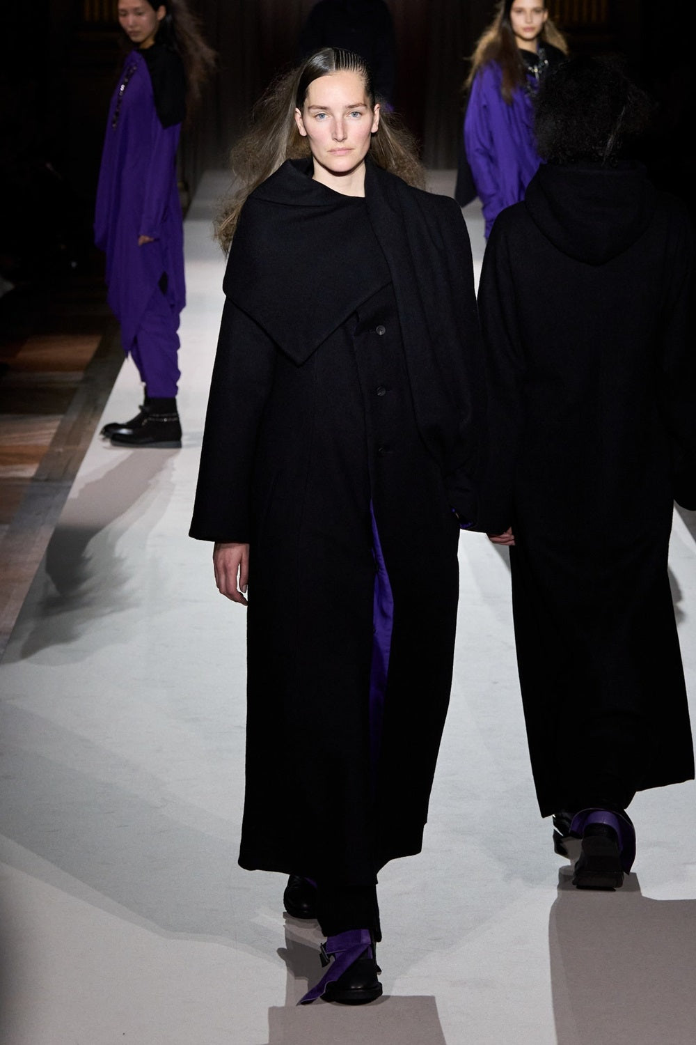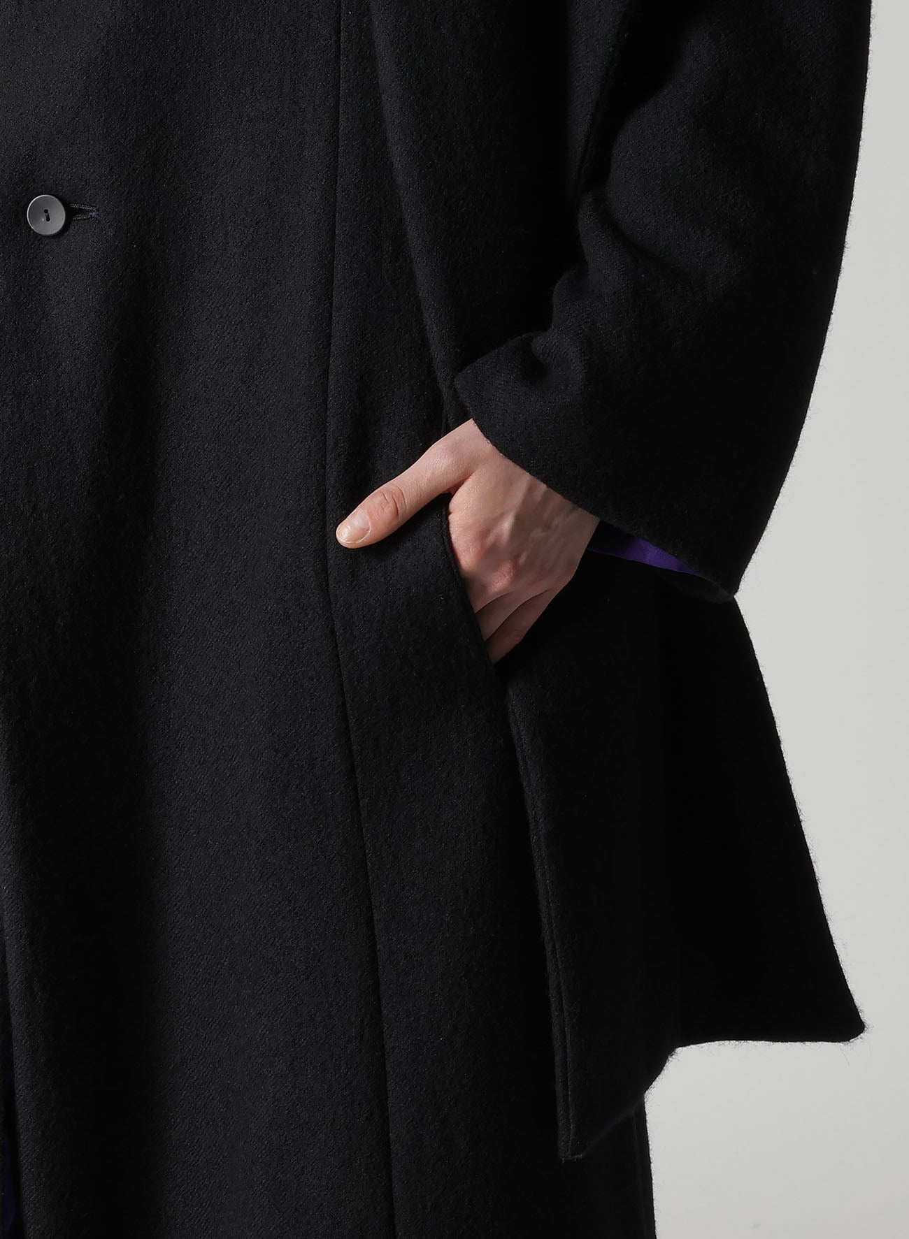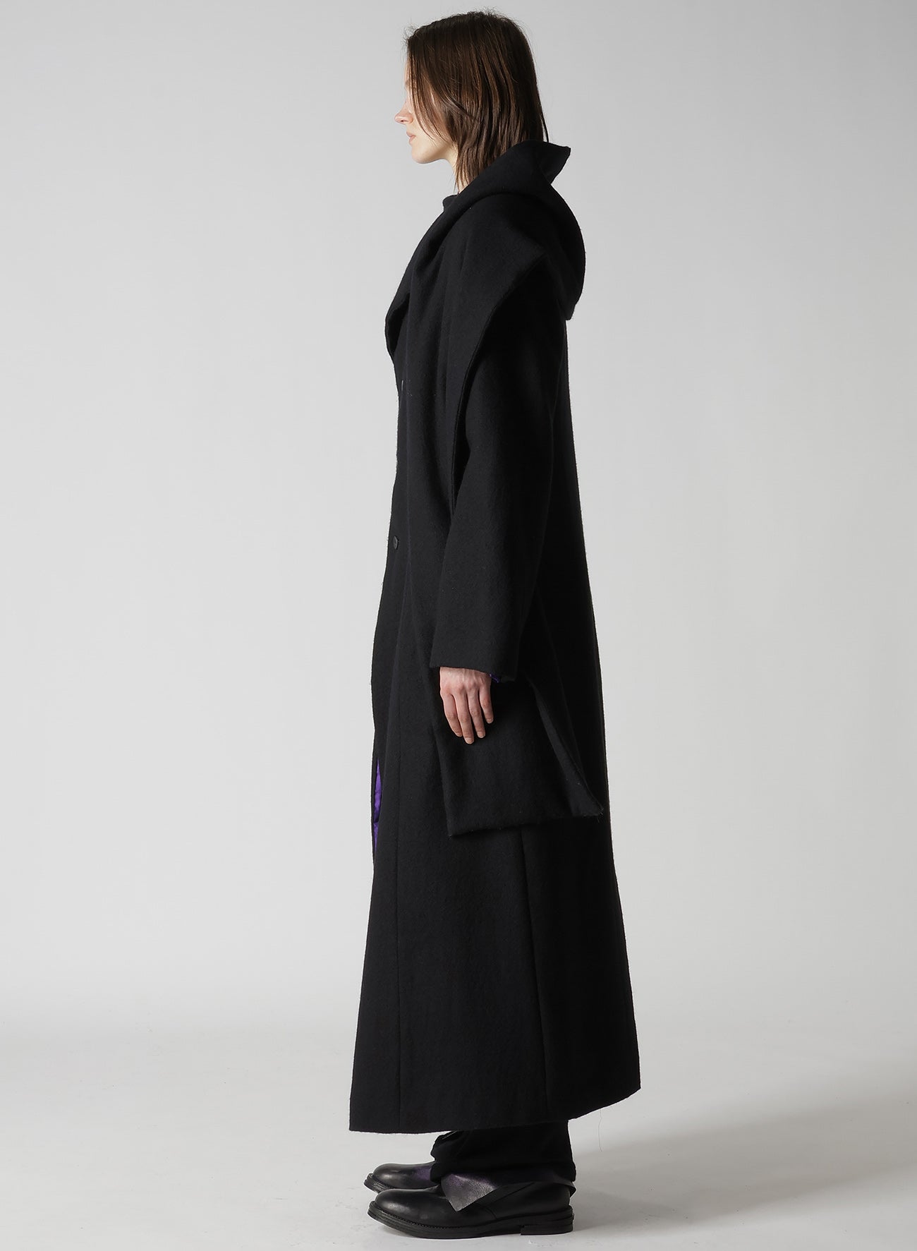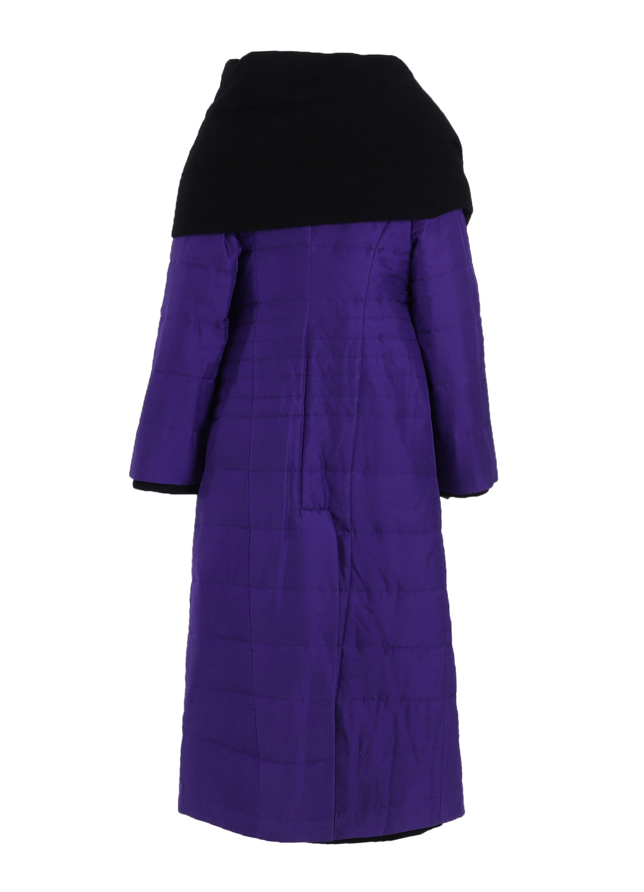 This elegant coat features a lightweight, reversible padded shawl collar and a silk purple finish that enhances its beauty. Despite its voluminous silhouette, the material ensures a light and graceful wear. Note: Model imagery uses samples; actual goods may differ slightly.