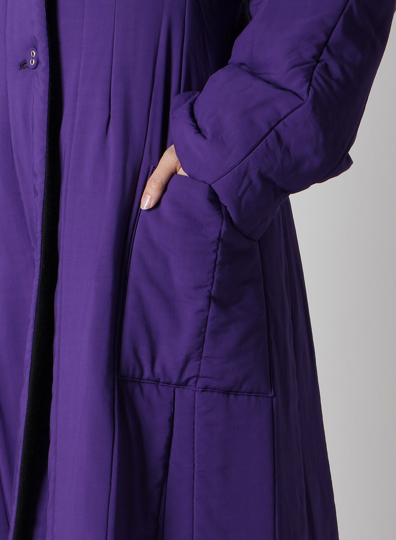 This reversible, padded no-collar coat graced the finale of a Paris collection. The elegant silk fabric in purple enhances its beauty and adds to its opulence. Despite its voluminous silhouette, the coat remains lightweight and easy to wear. Note that models wear sample items, which may differ slightly from the final product.