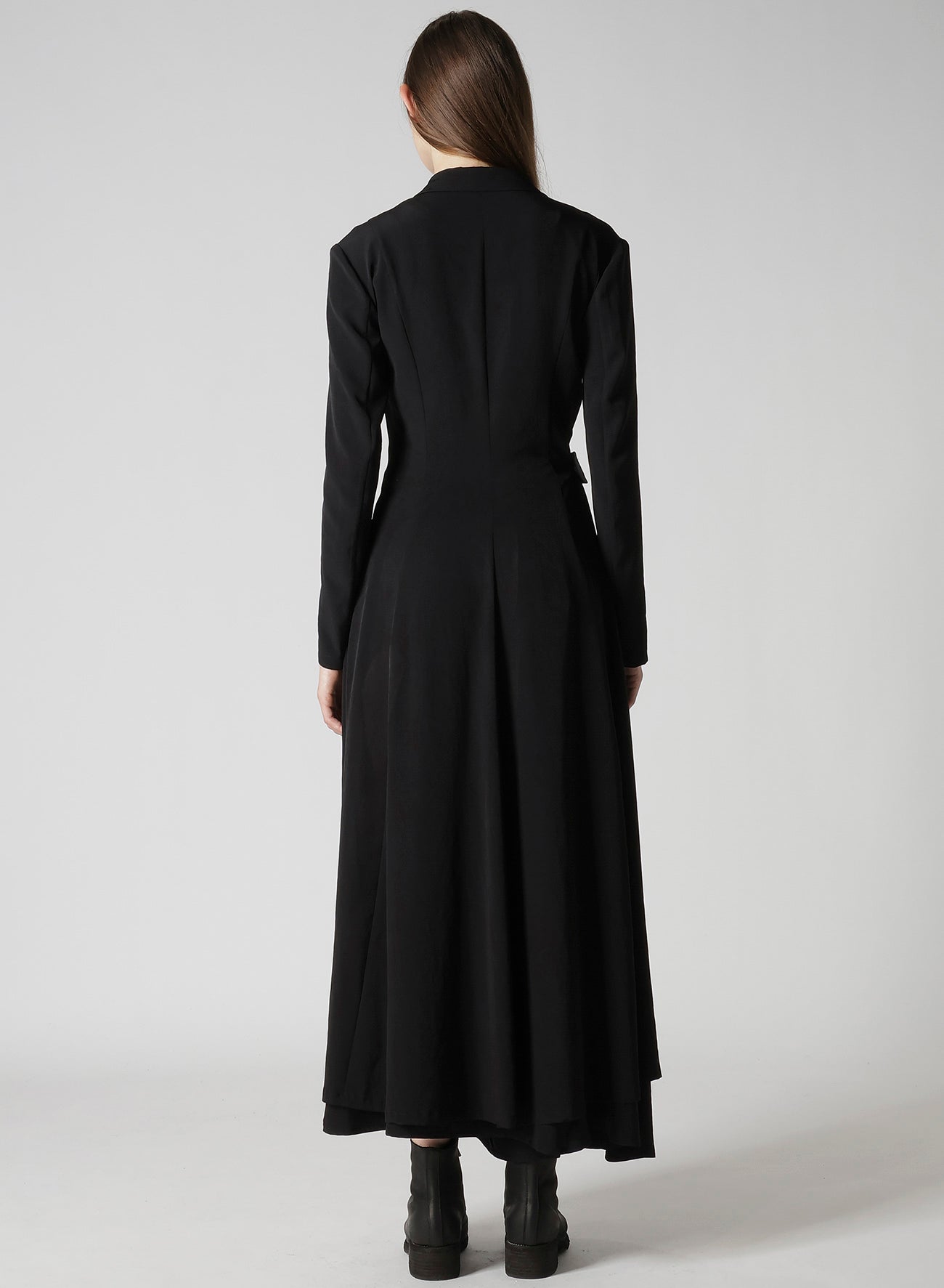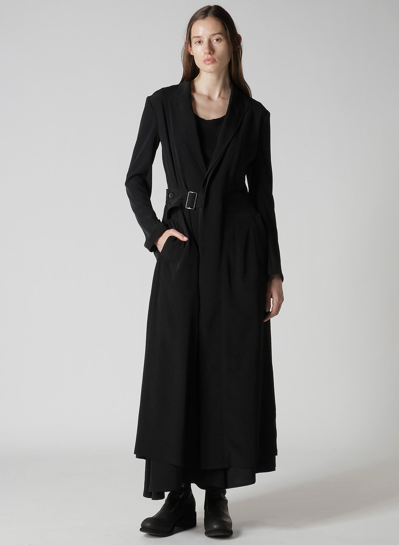 This elegant coat, made with the luxurious crepe de Chine, features a soft luster and sophisticated drapery. Paired with the waist belt, it creates a refined silhouette suitable for various occasions. Note: The model is wearing a sample item; for exact sizing, please refer to SIZE INFO.