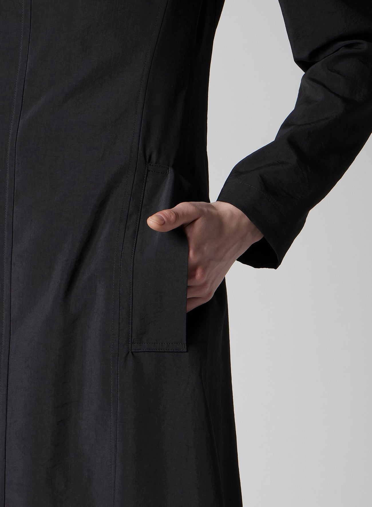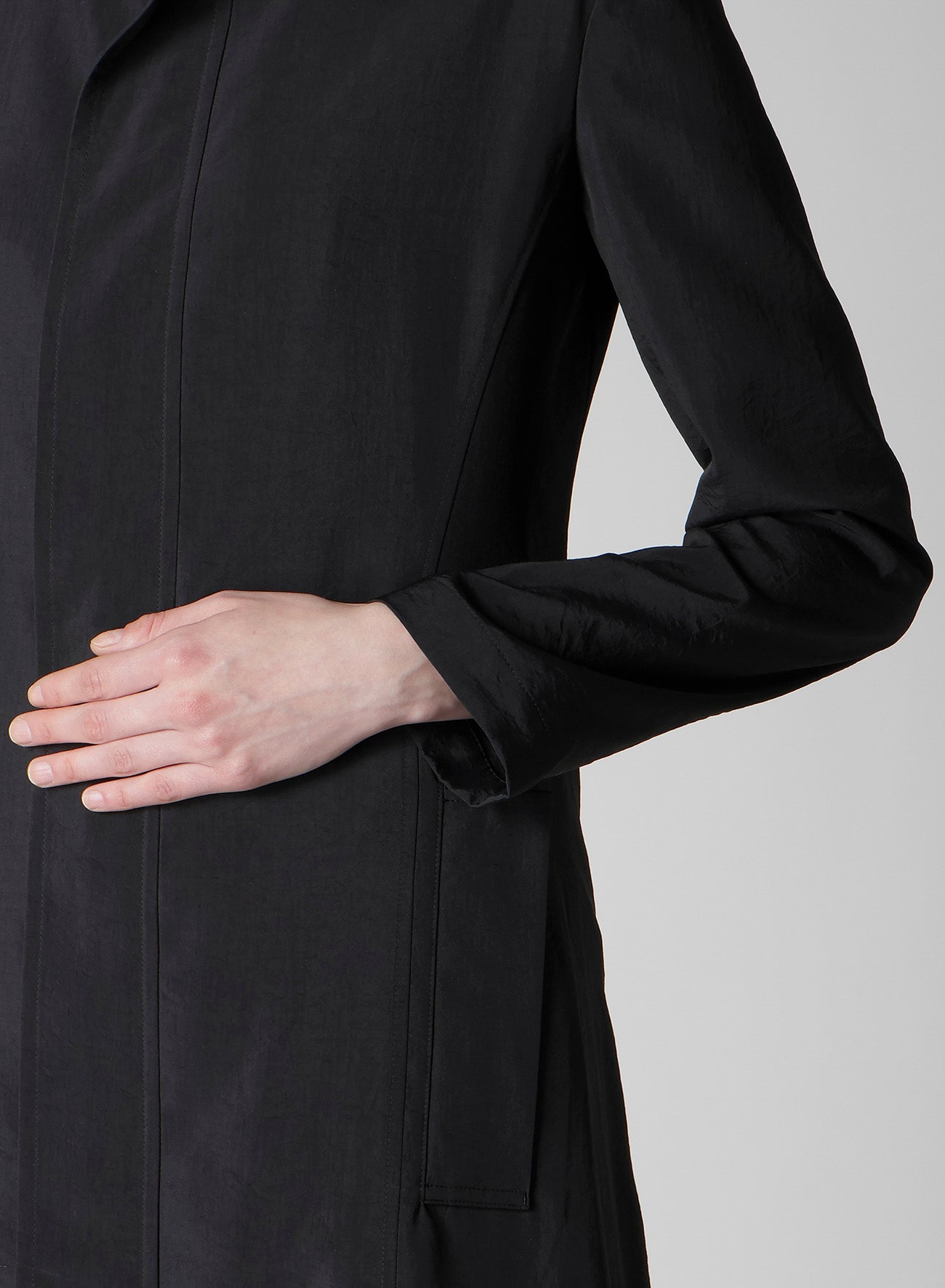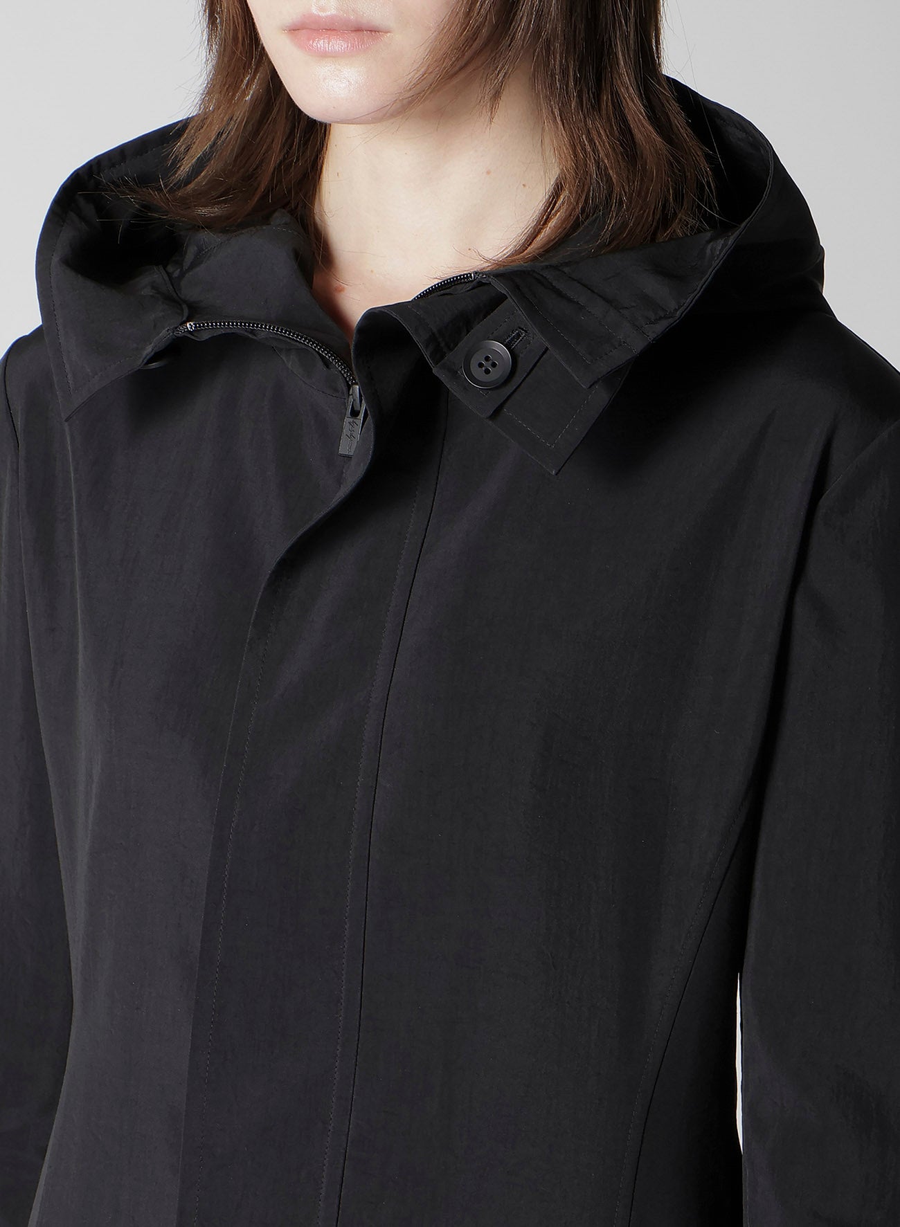 A hooded coat crafted from nylon with a firm texture and shiny silk, enhancing its elegant silhouette. Its lightweight feel makes it a versatile piece throughout the season. Please note that model images are samples, and actual products may vary. Check the size info for details.