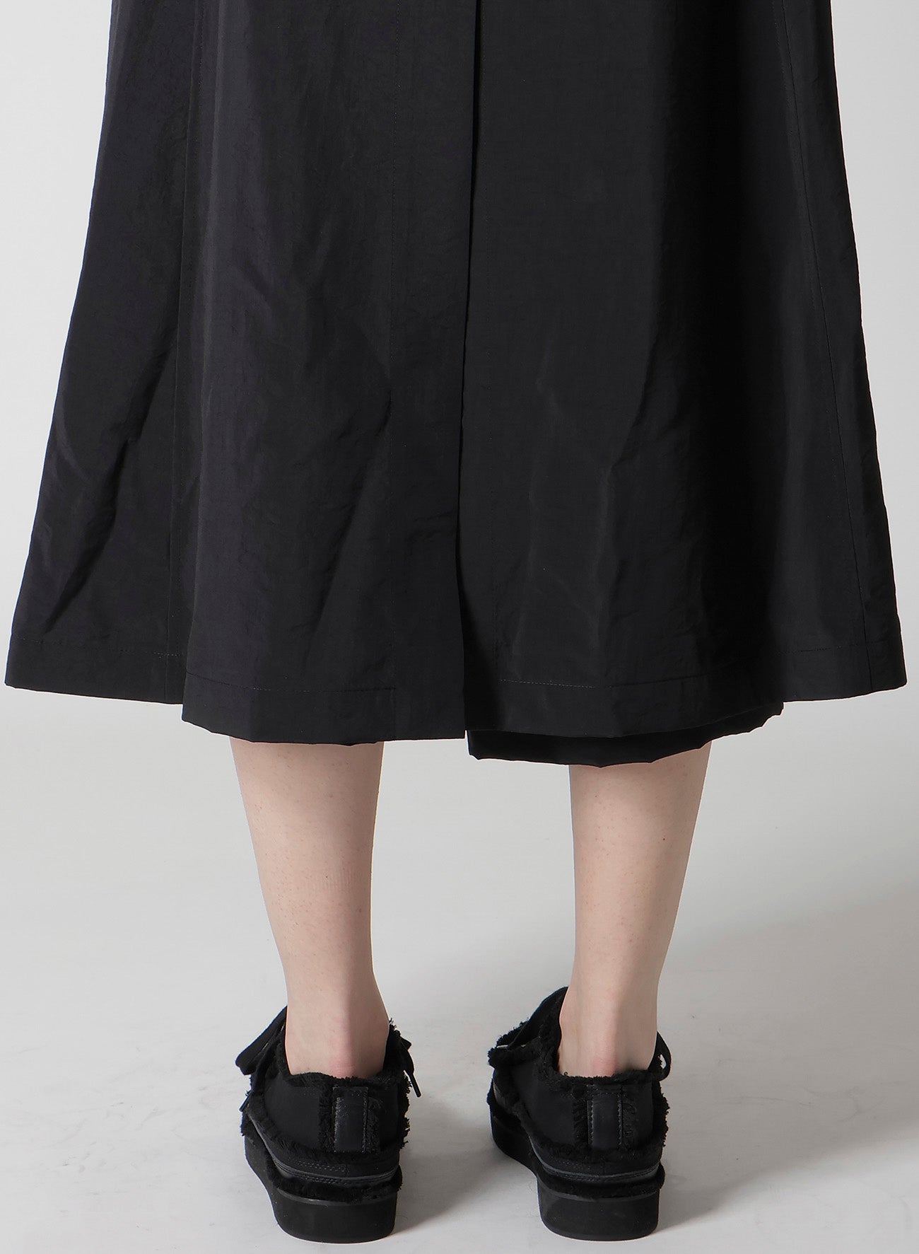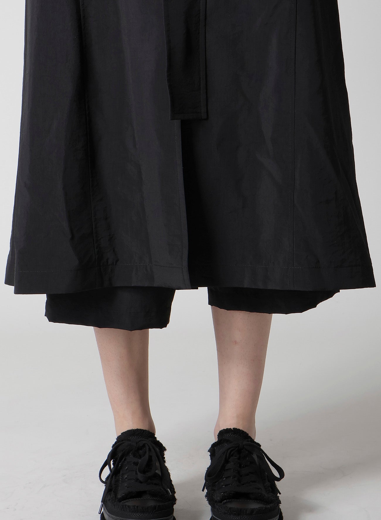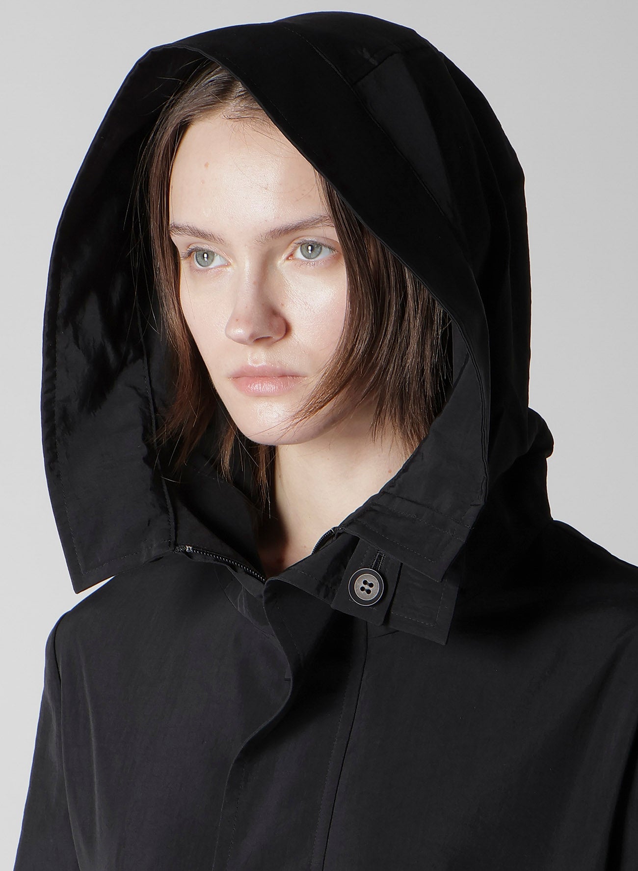 A hooded coat crafted from nylon with a firm texture and shiny silk, enhancing its elegant silhouette. Its lightweight feel makes it a versatile piece throughout the season. Please note that model images are samples, and actual products may vary. Check the size info for details.