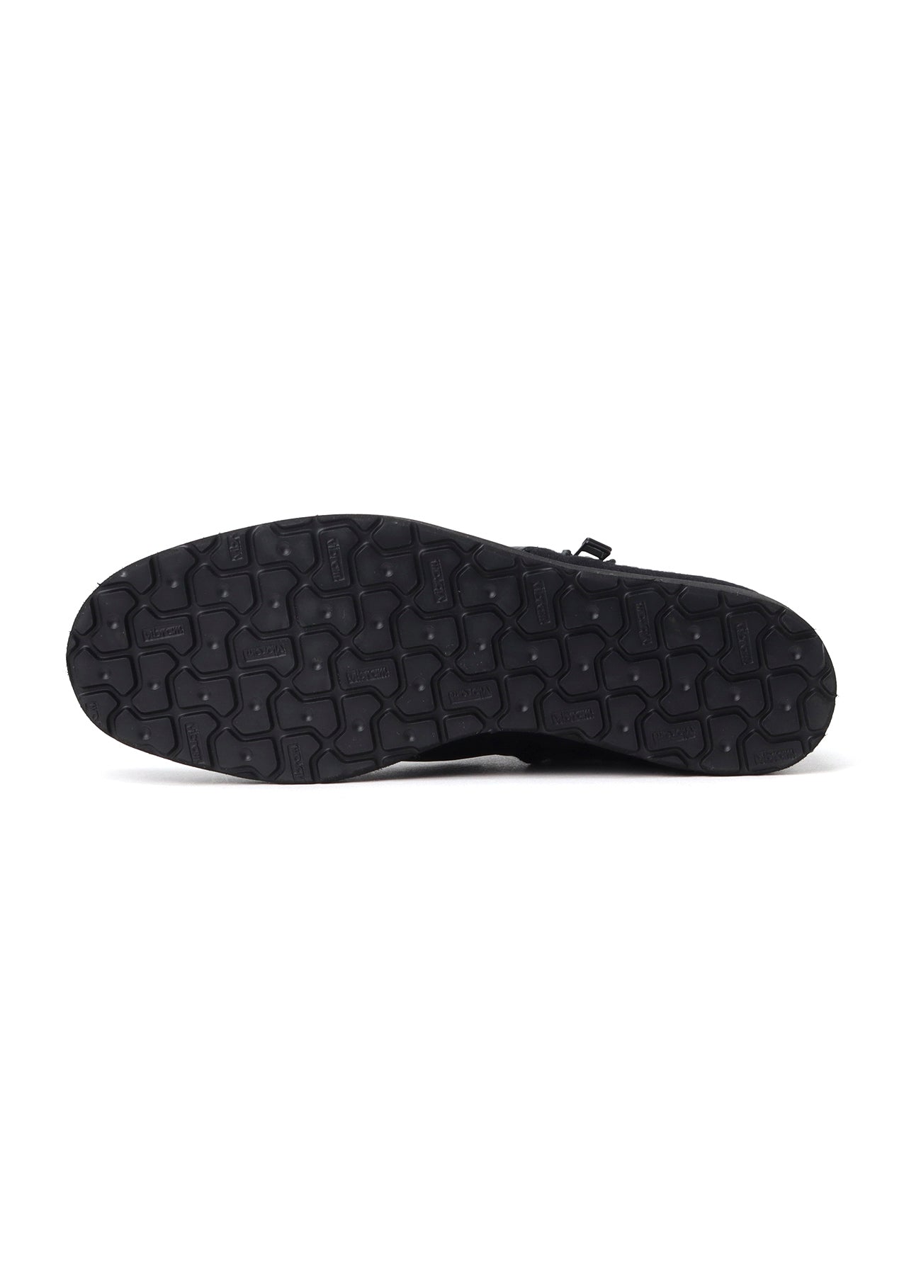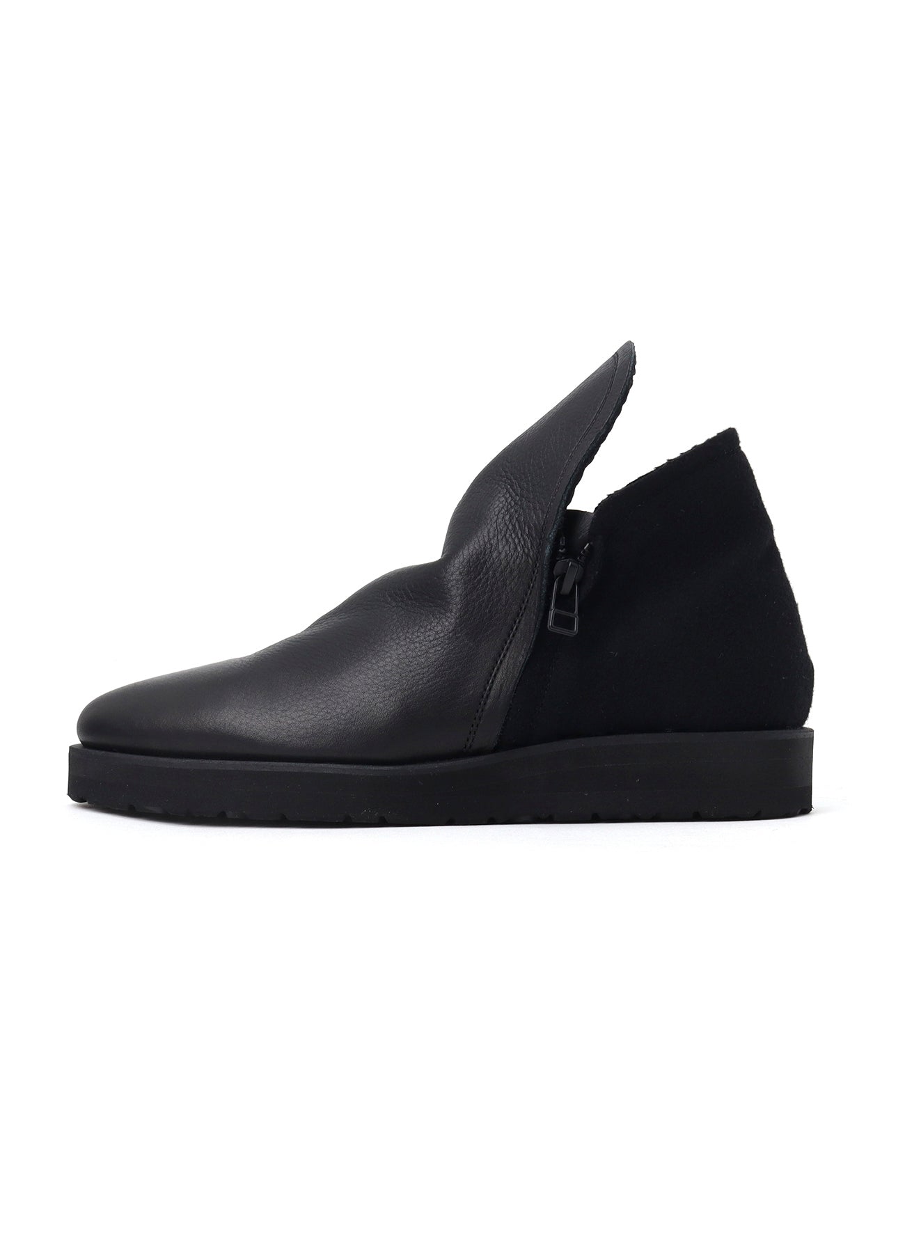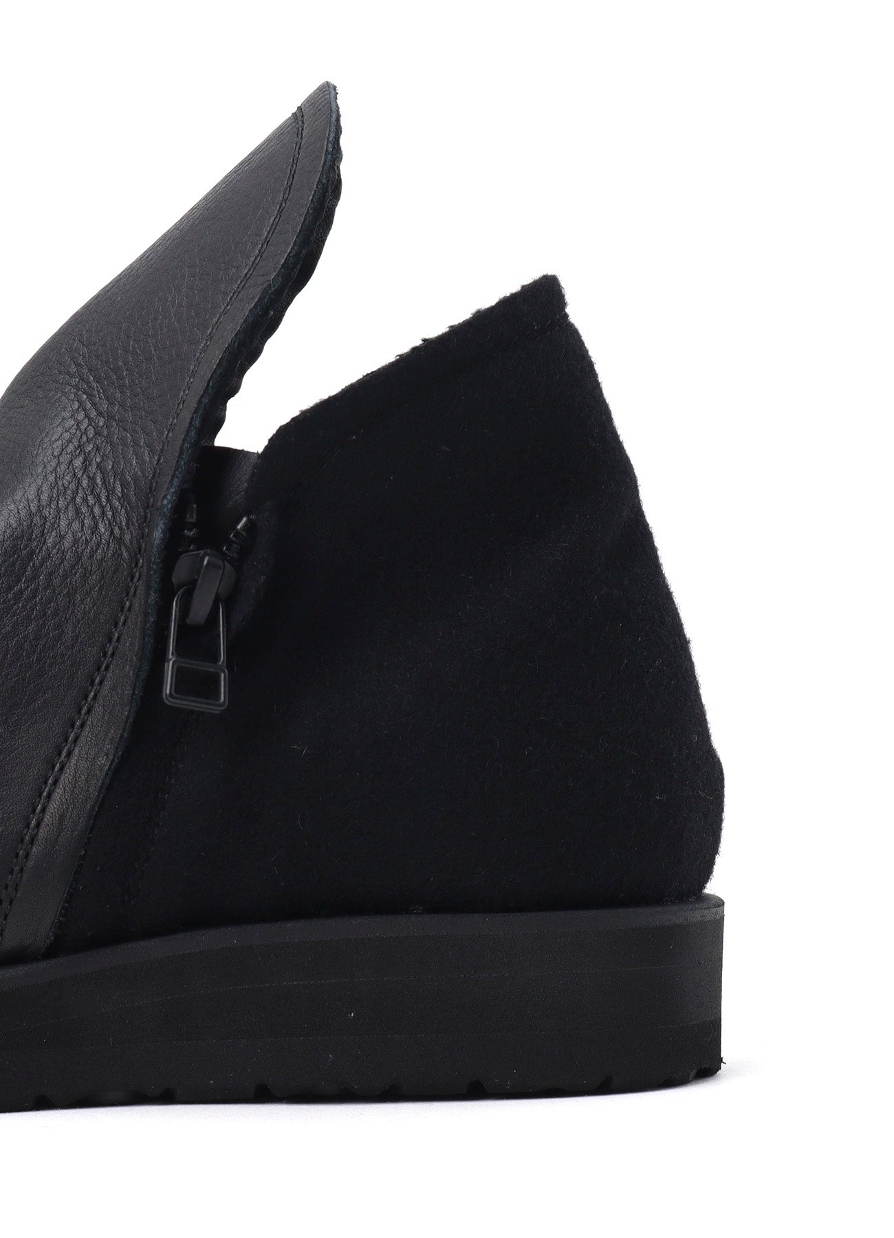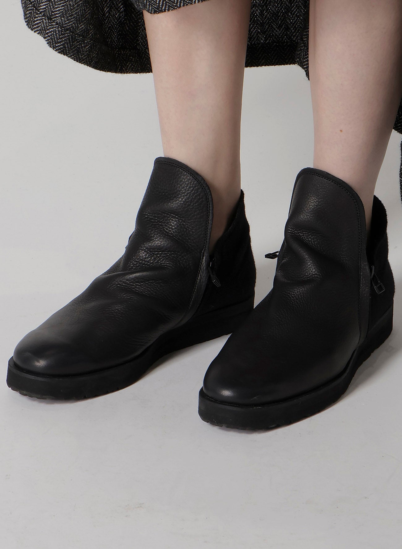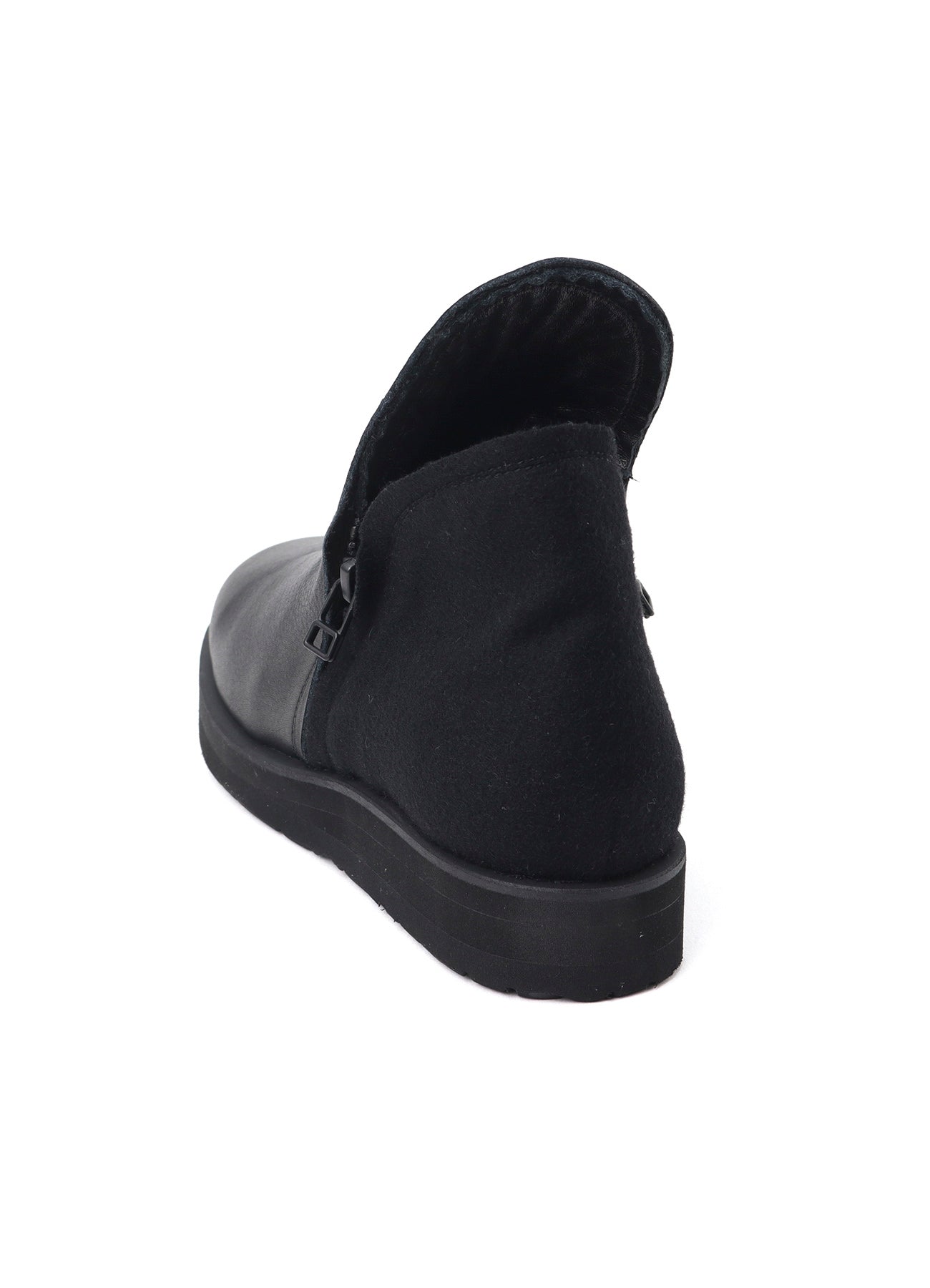 This product is a pair of ankle boots with a zipper on both sides, combining Shrink leather and Melton wool. The long vamp design reaches the ankle, and it has matching leather inside that can be folded over for a versatile style.