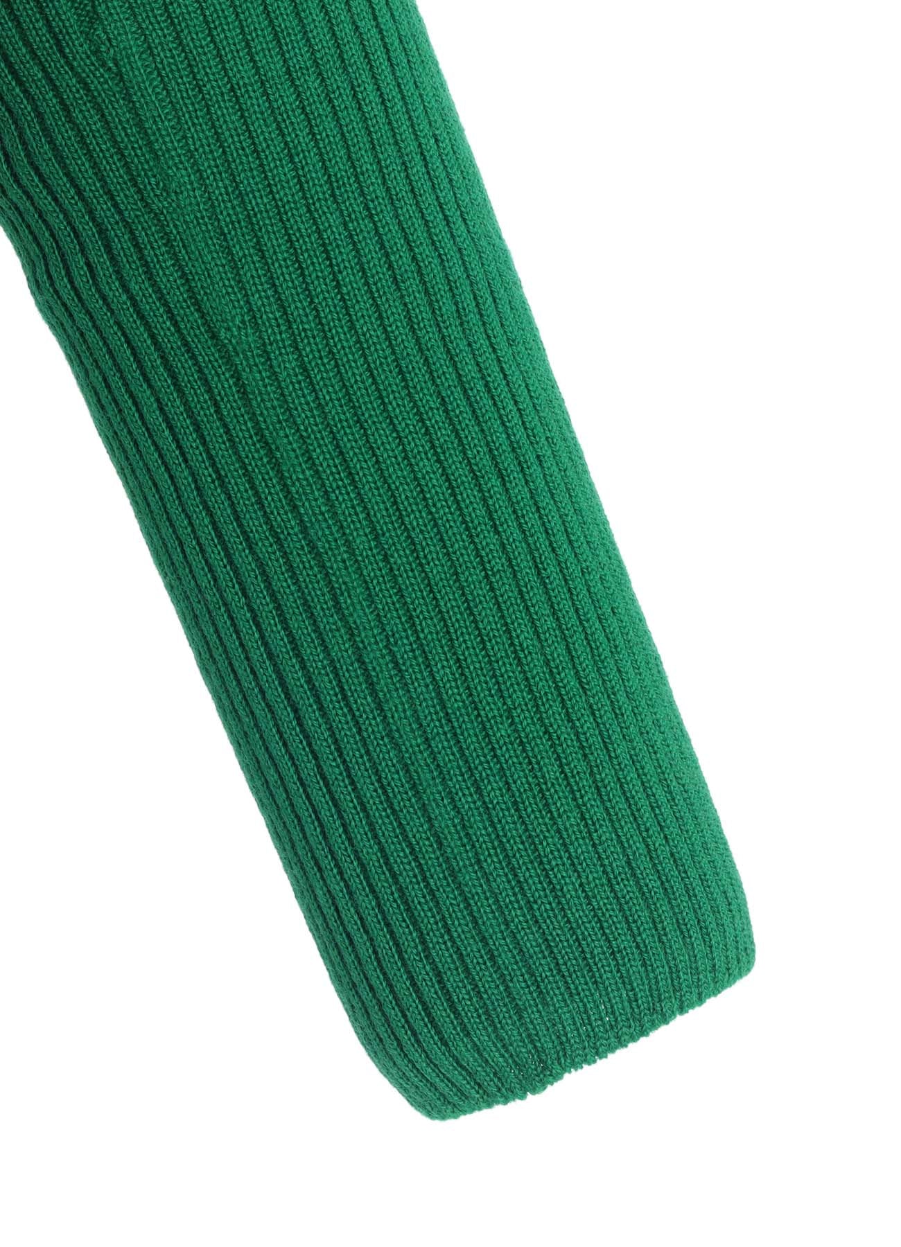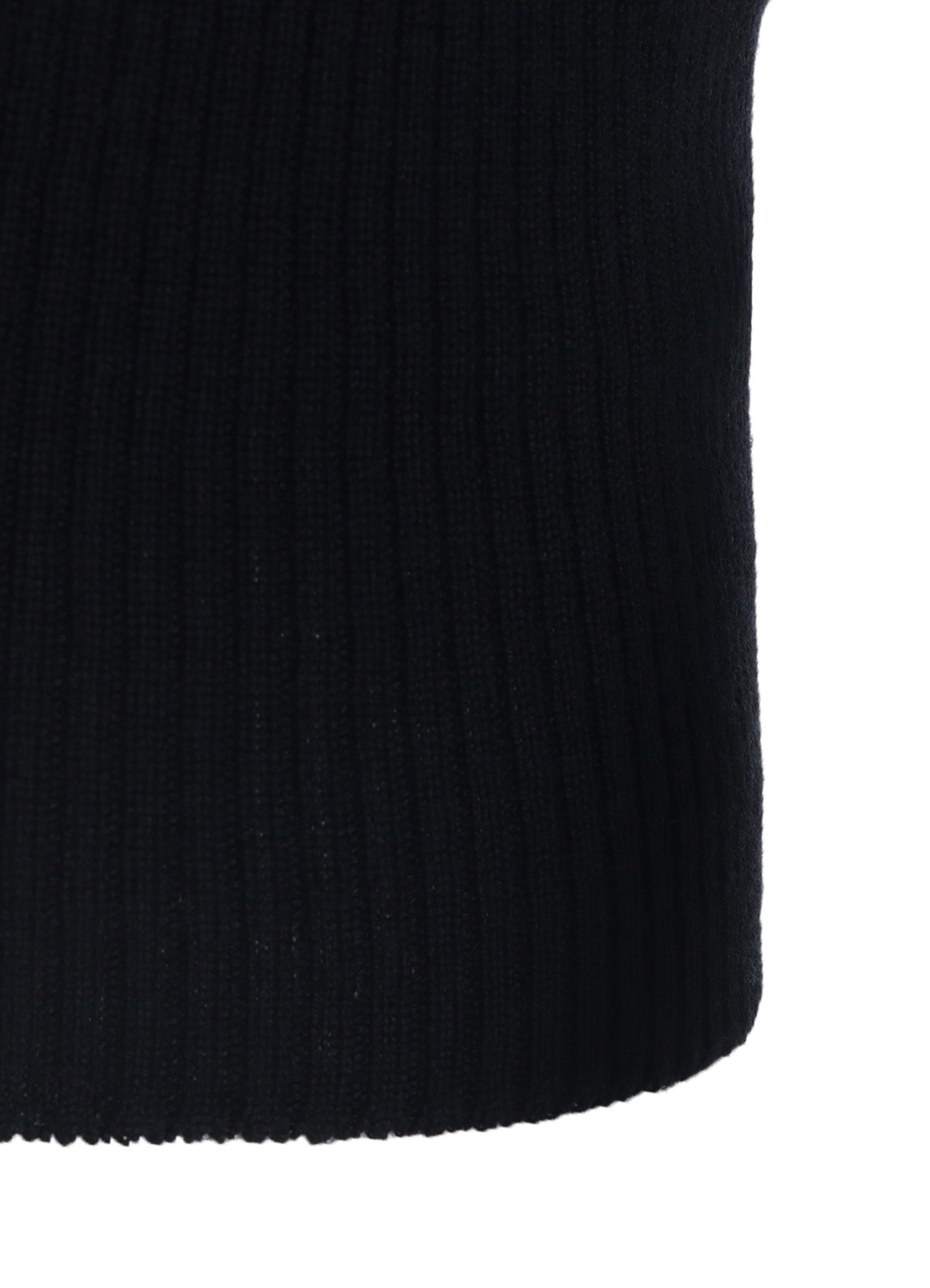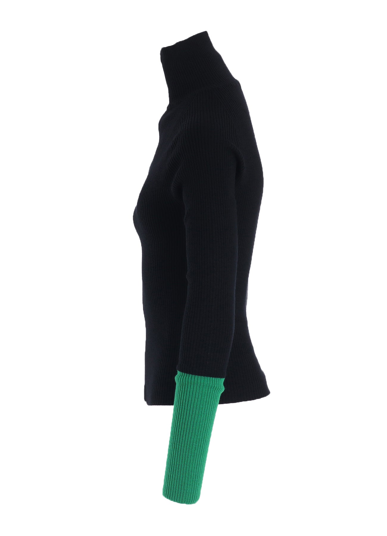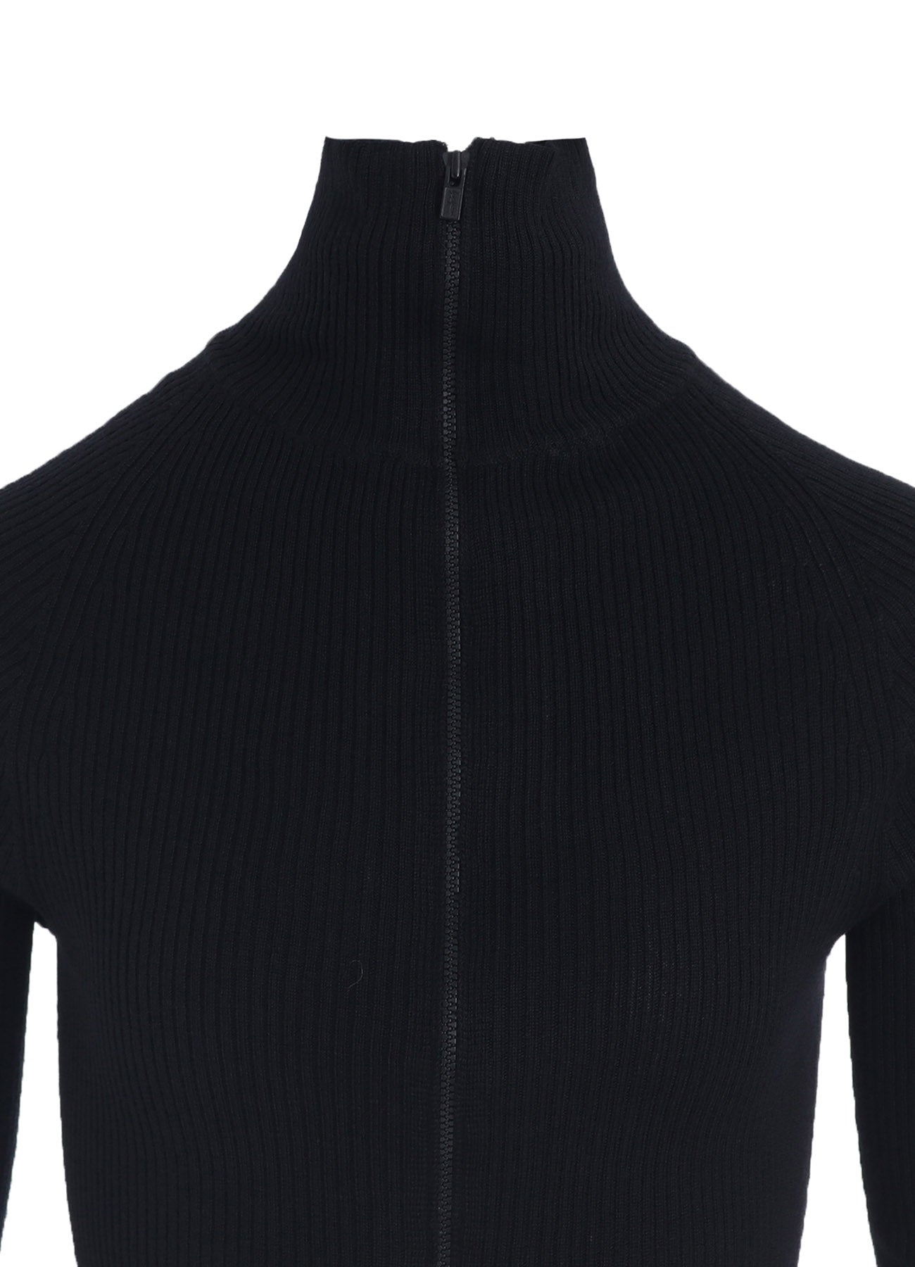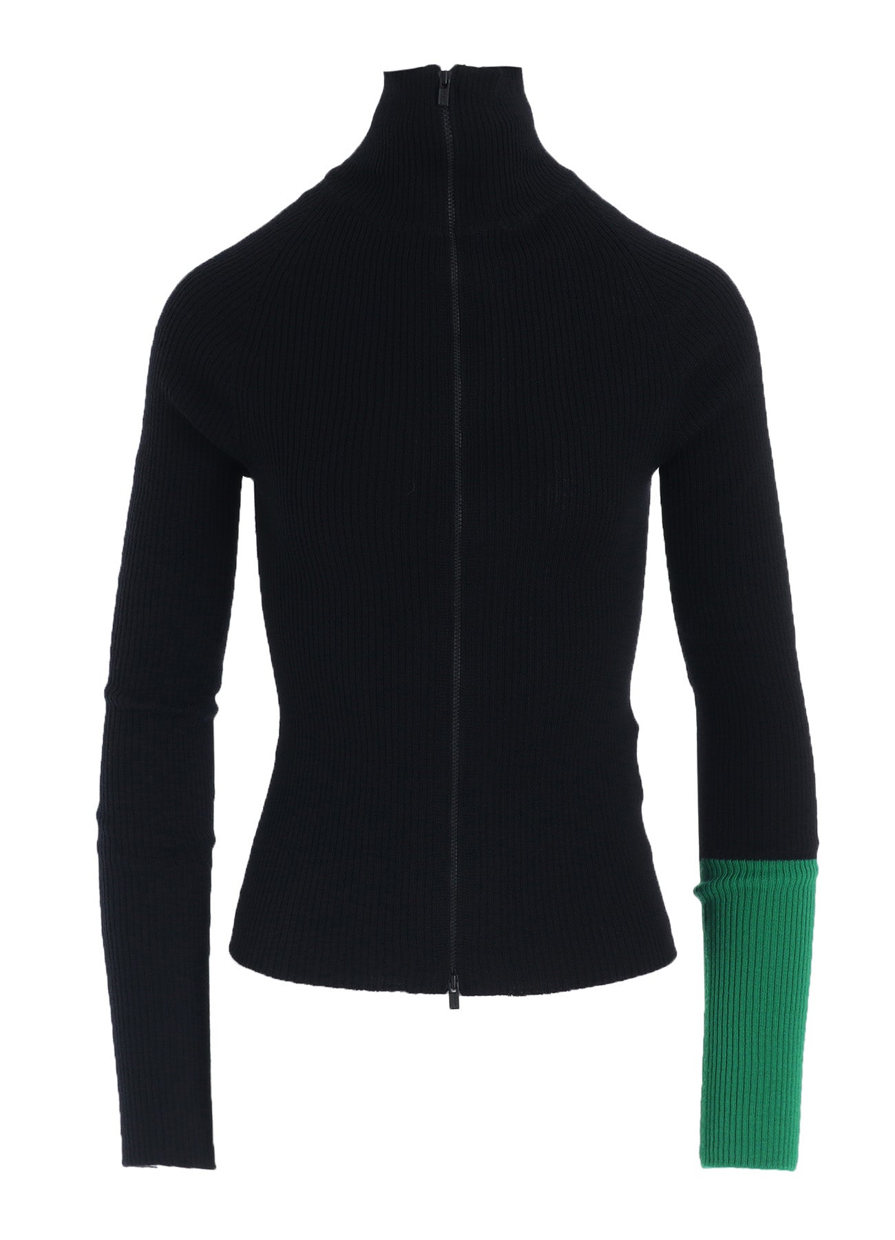 This front-open turtleneck sweater features innovative color accents on the sleeves. Made from carefully selected fine and long wool, it is crafted in a ribbed knit. The double zipper adds versatility, allowing it to transition between a high-neck and collared knit. The clean silhouette is accentuated by opening it to the waist.