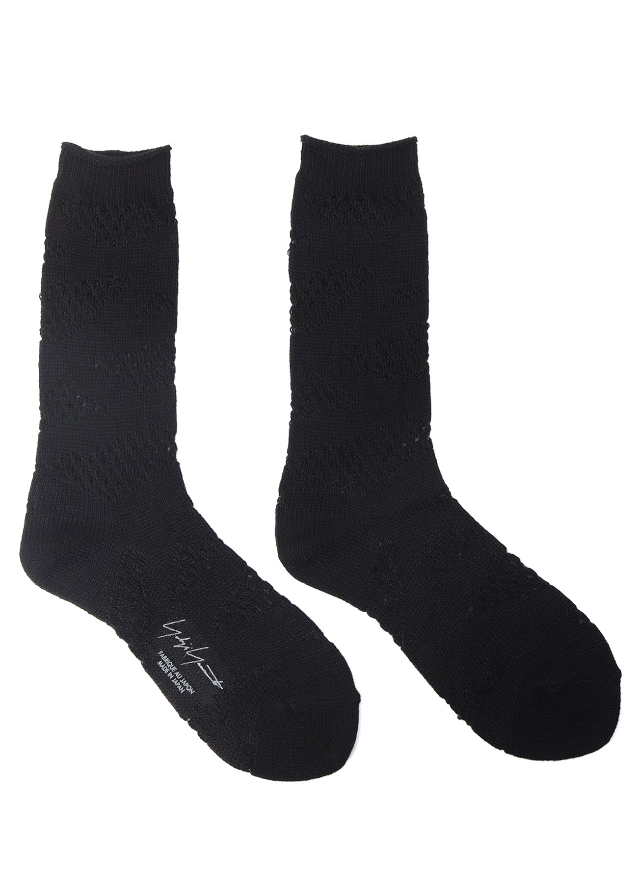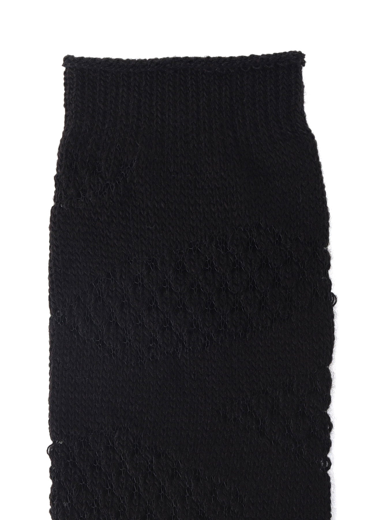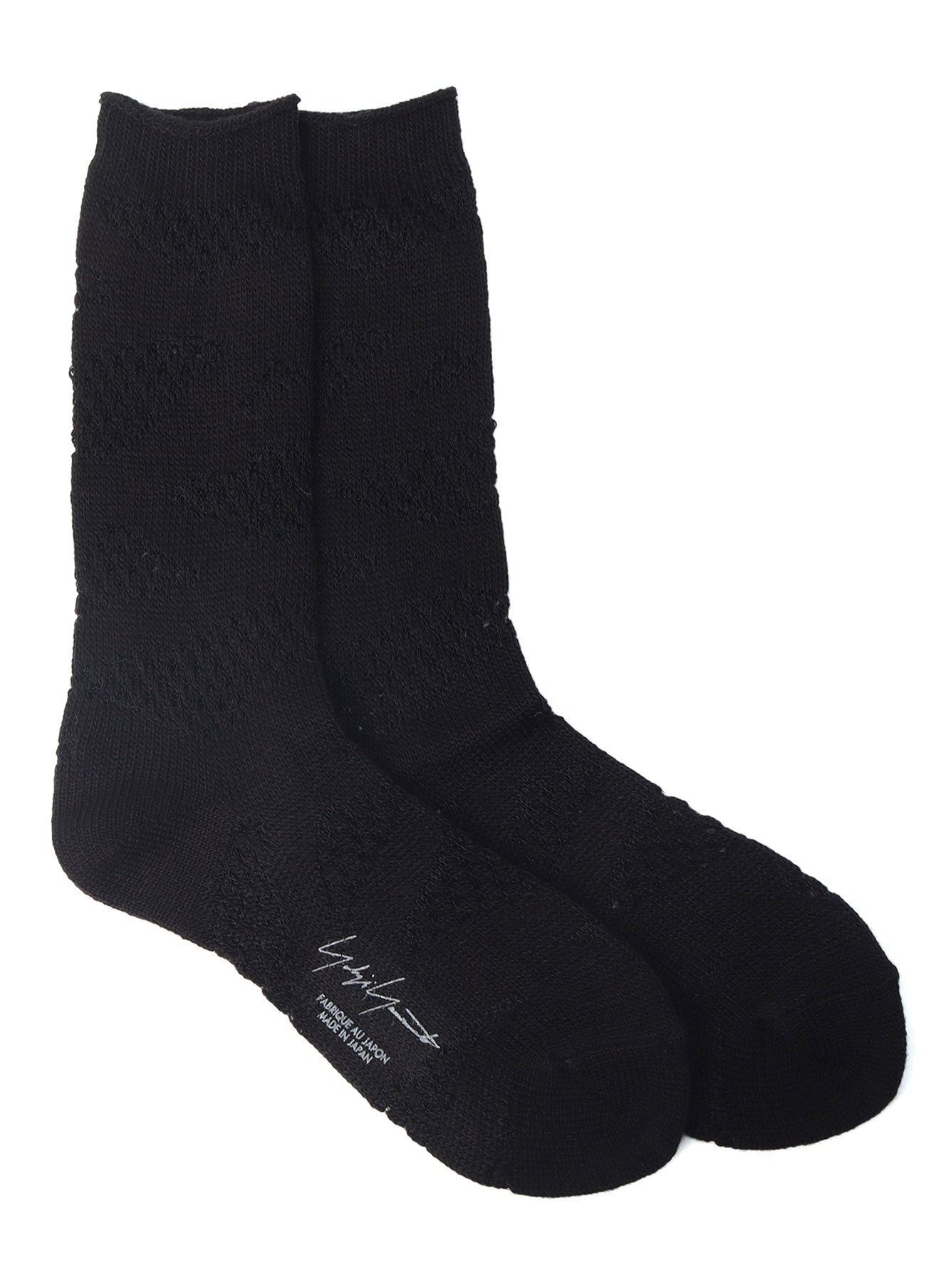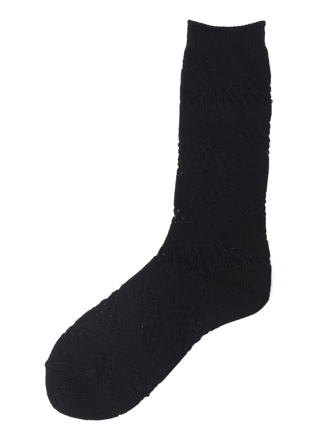 These socks, characterized by line design, blend thick wool yarn with sheer tegu for a unique texture. The socks capture a stylish and subtle look suitable for various outfits. They provide warmth and a touch of elegance to any ensemble, perfect for all-season wear.