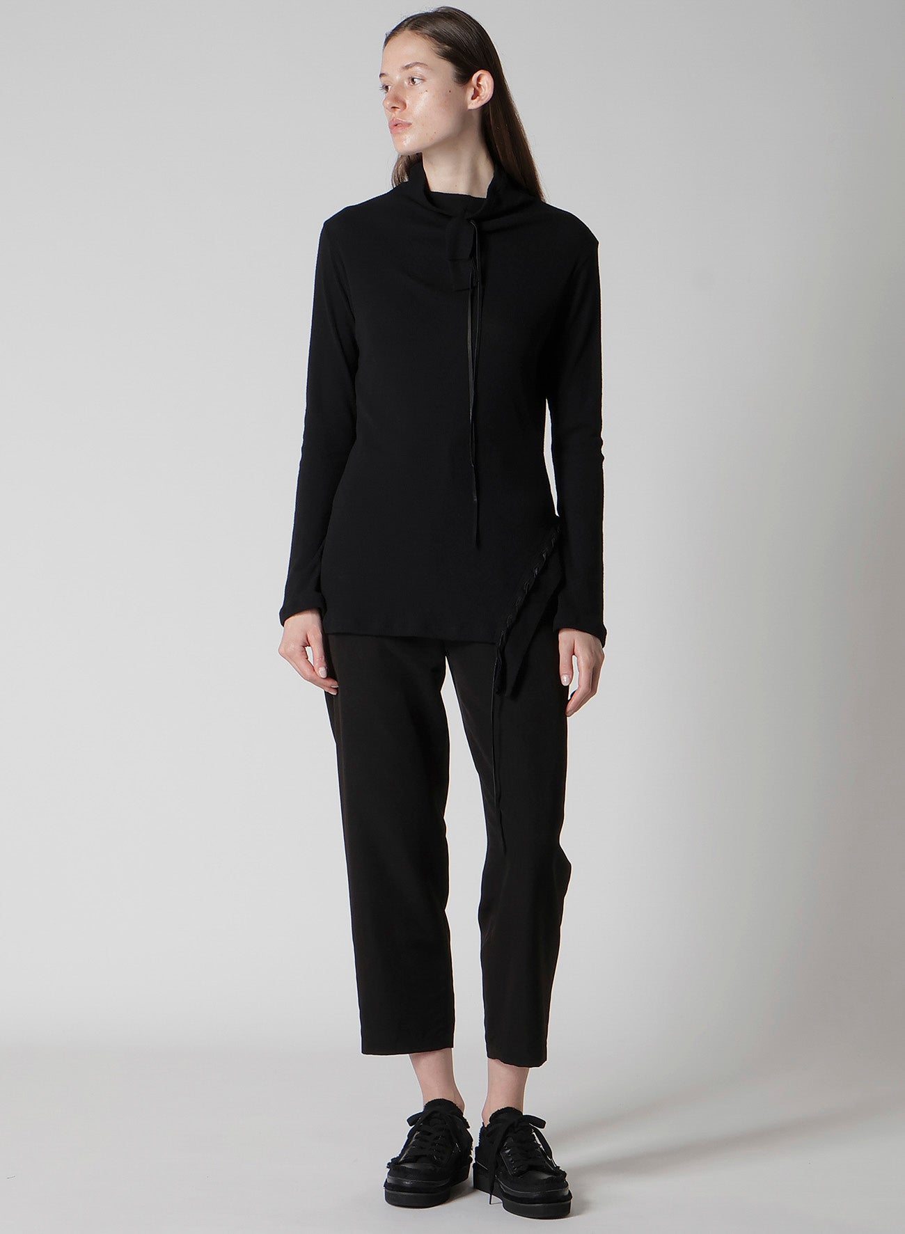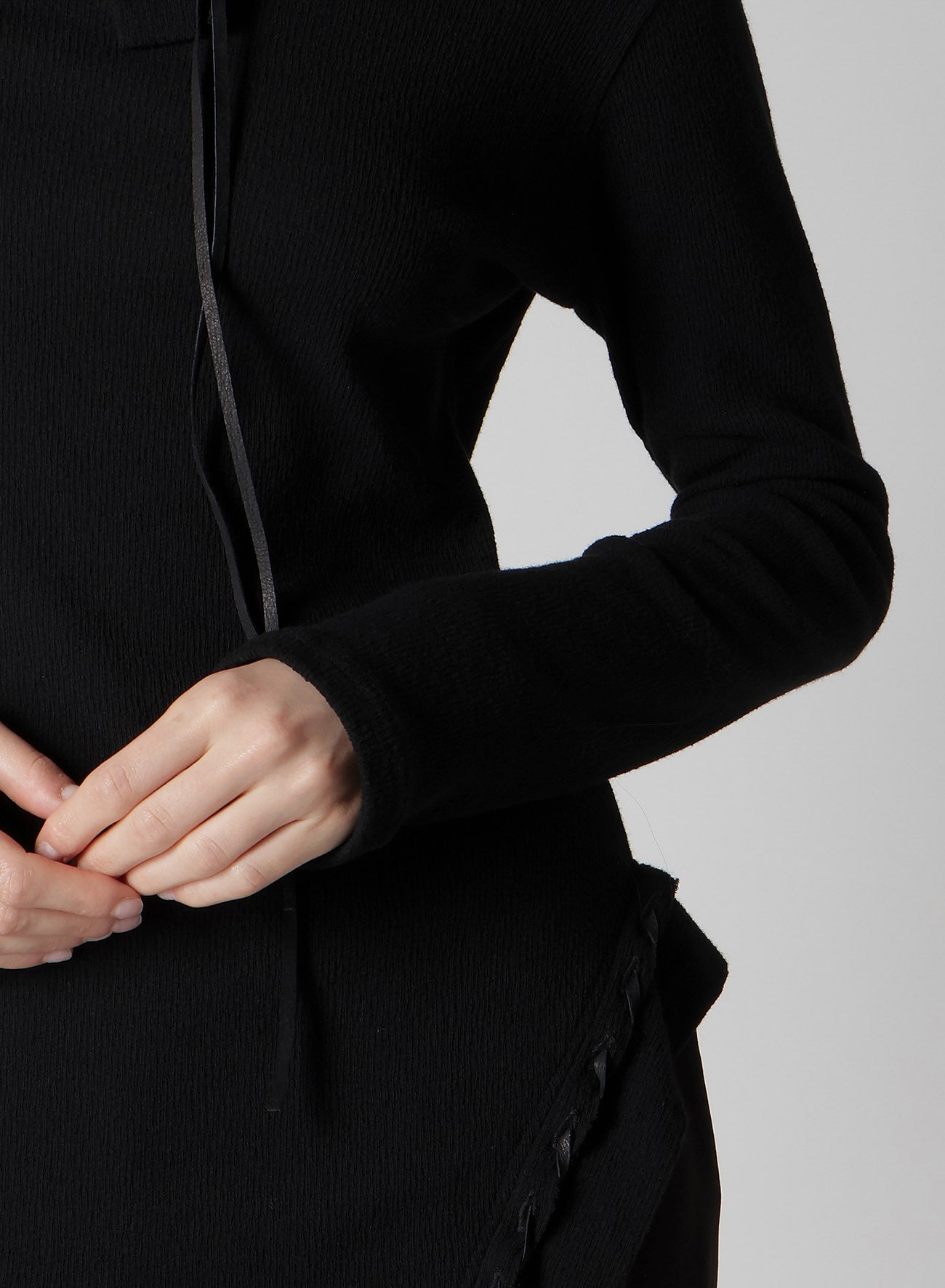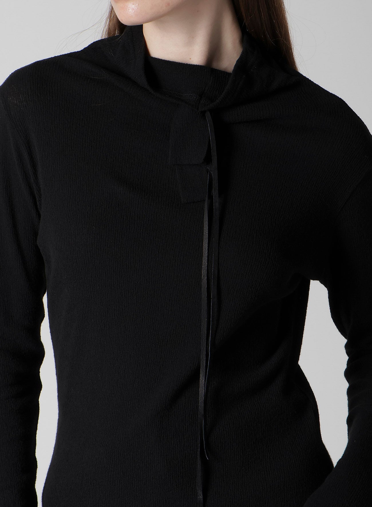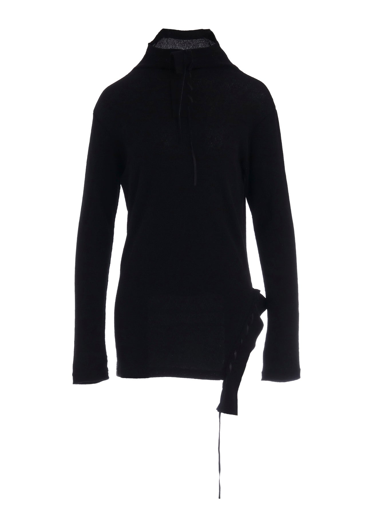 This pullover top features a striking drawcord design and a new interpretation of the high-neck cut. Crafted from material with a rich texture, it stands out with its decorative style. Please note that the model is wearing a sample item; actual products may vary. Consult SIZE INFO for detailed measurements.