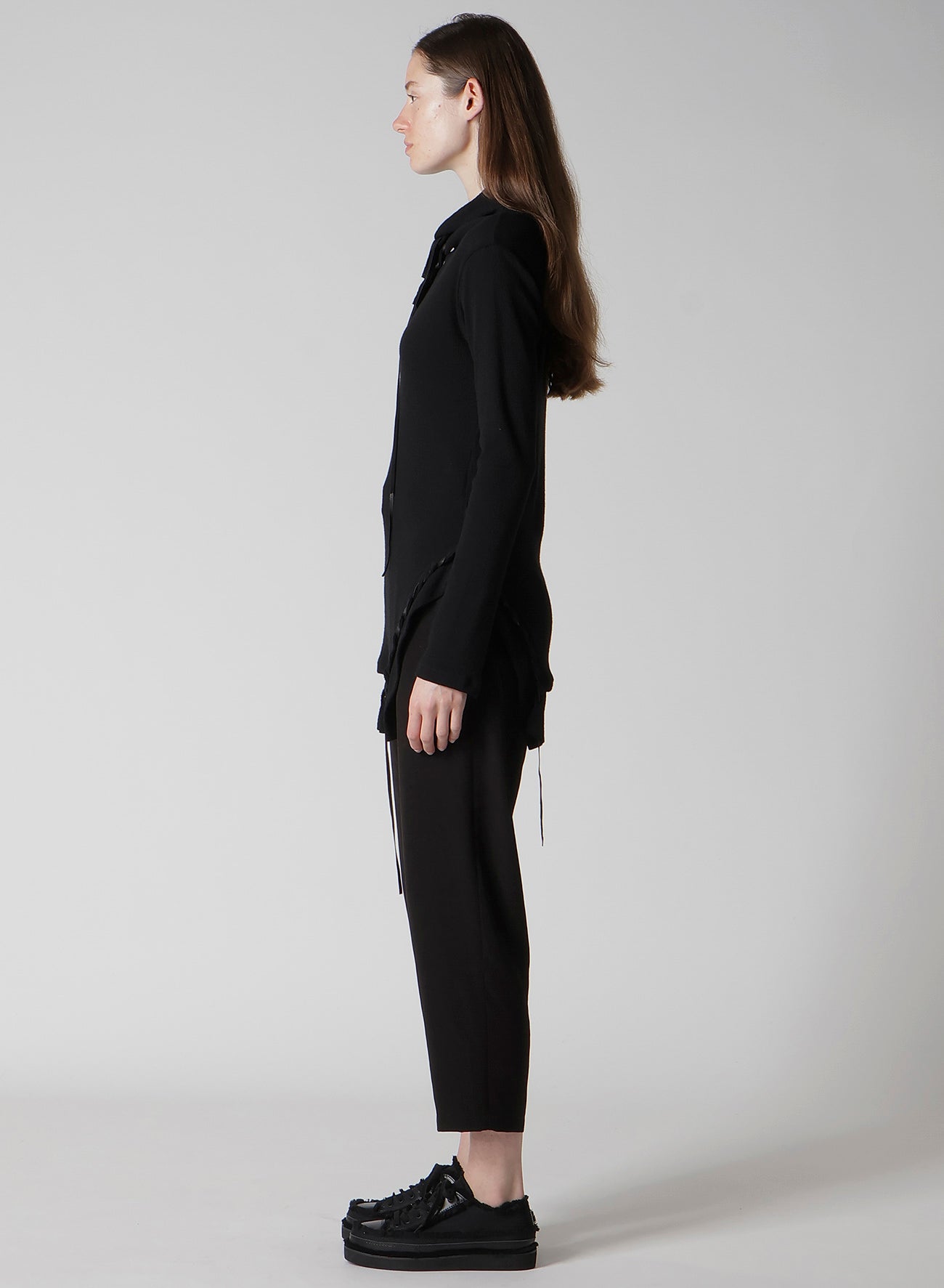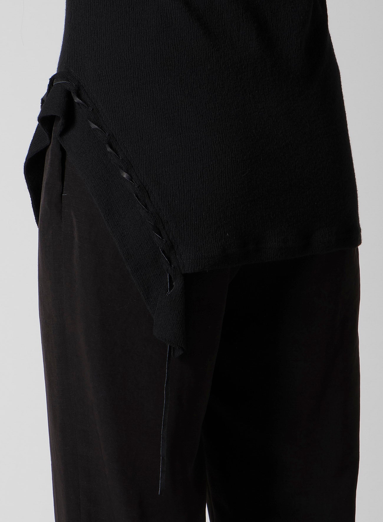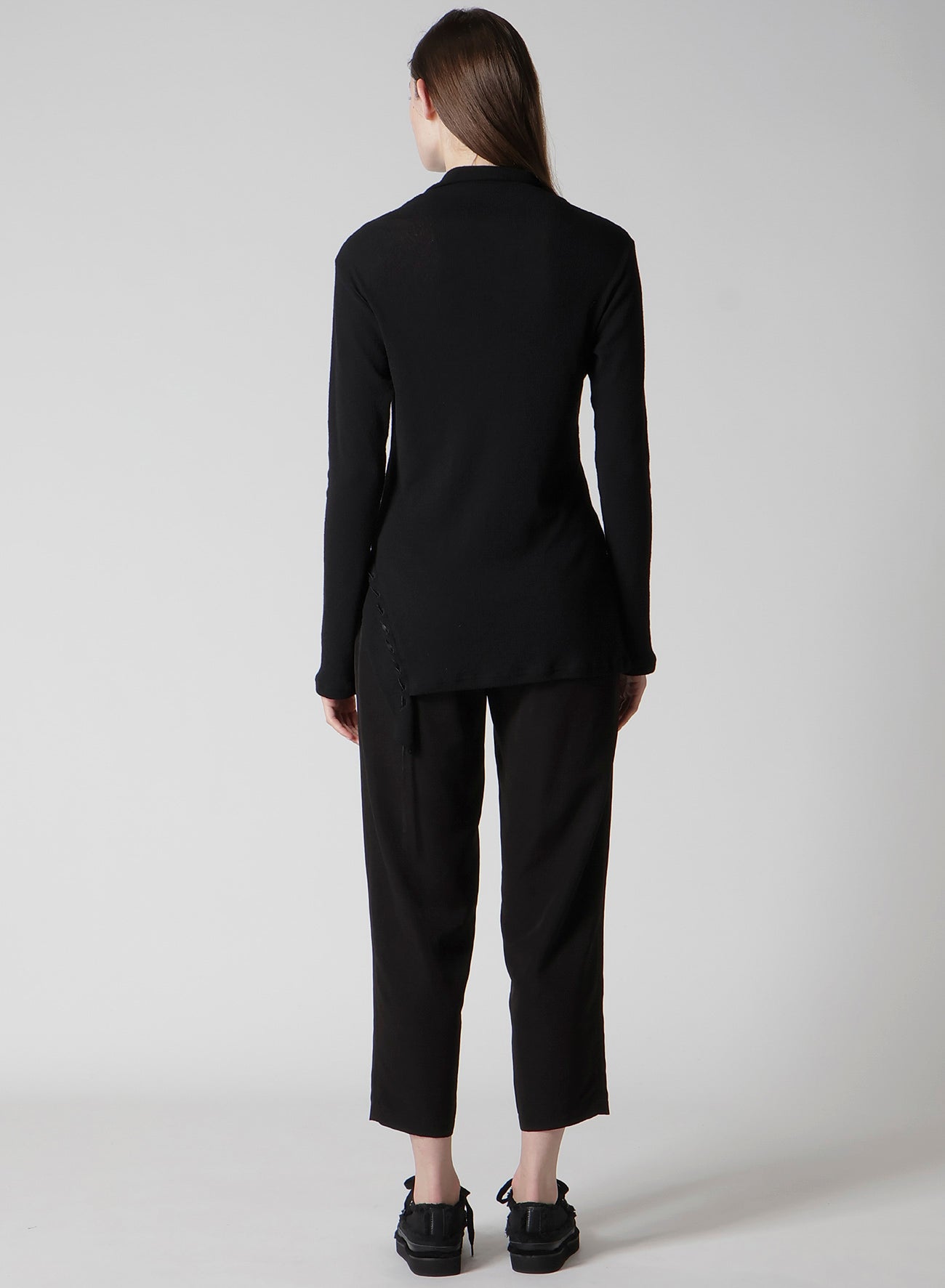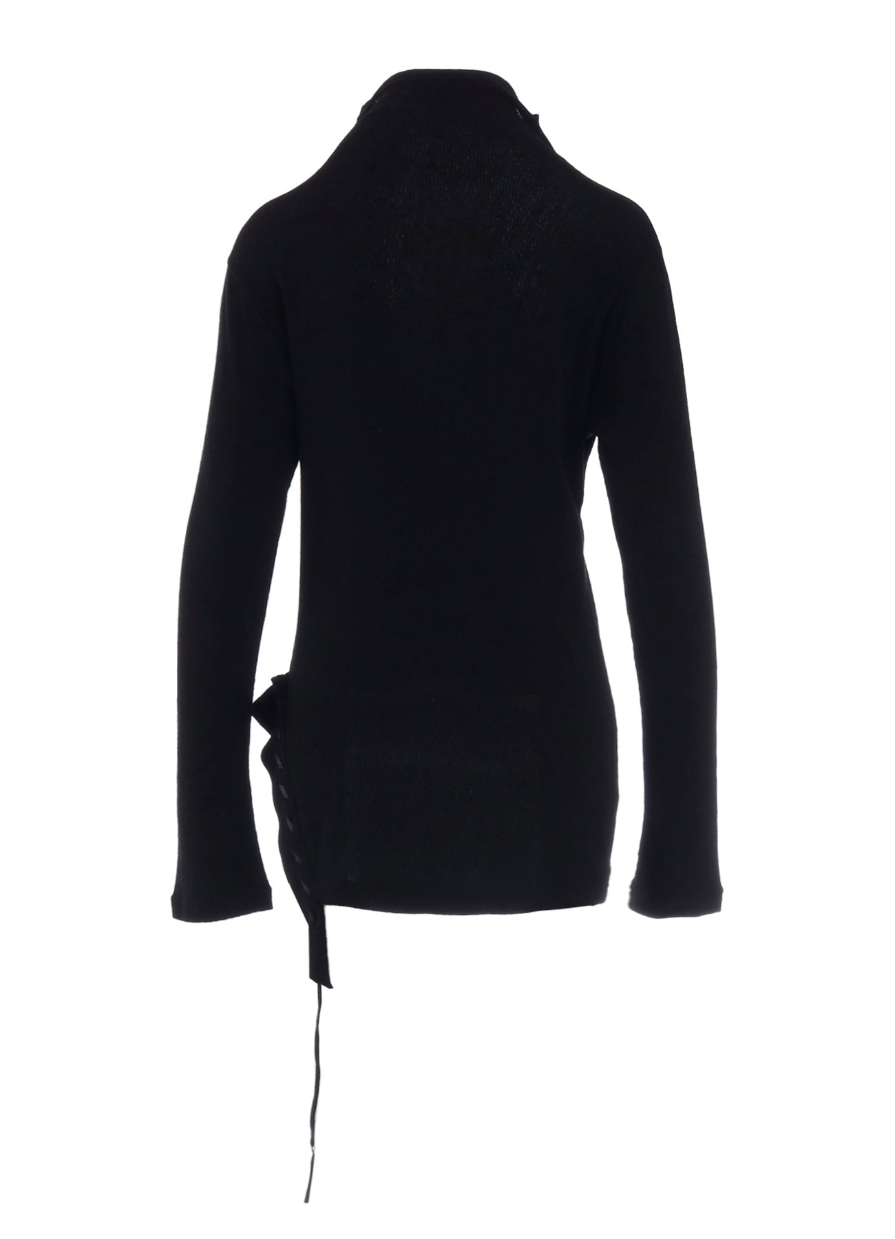 This pullover top features a striking drawcord design and a new interpretation of the high-neck cut. Crafted from material with a rich texture, it stands out with its decorative style. Please note that the model is wearing a sample item; actual products may vary. Consult SIZE INFO for detailed measurements.
