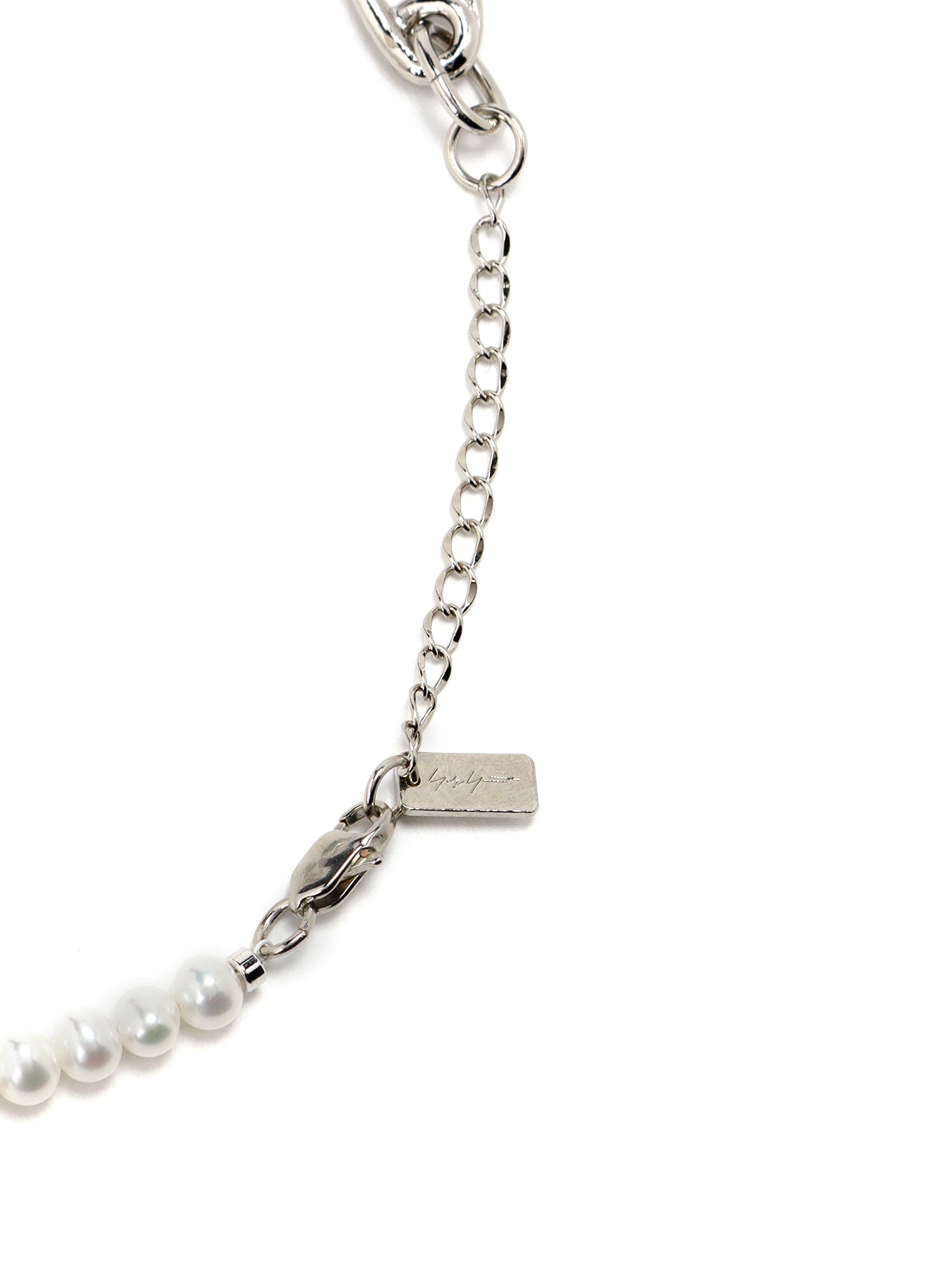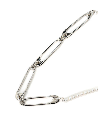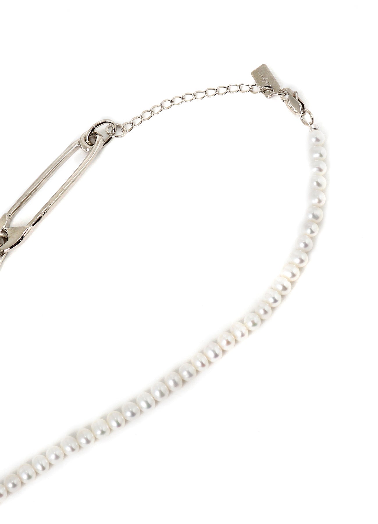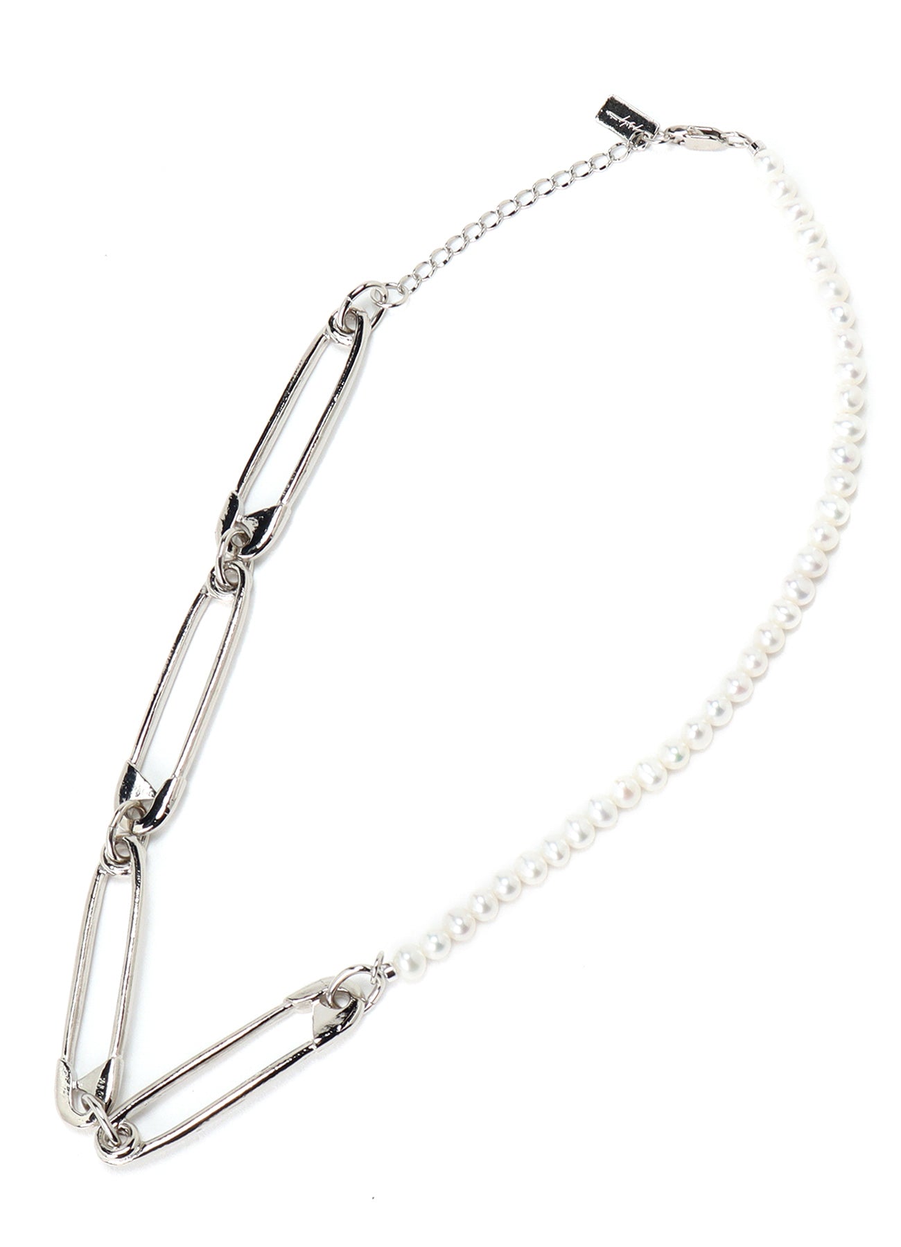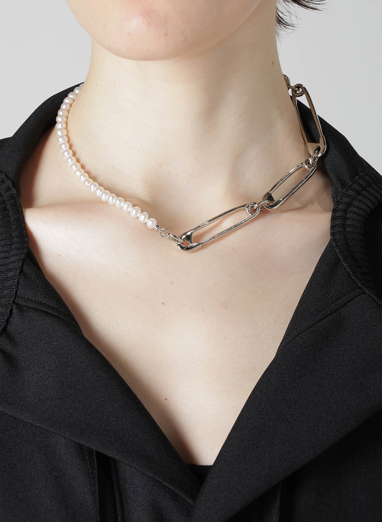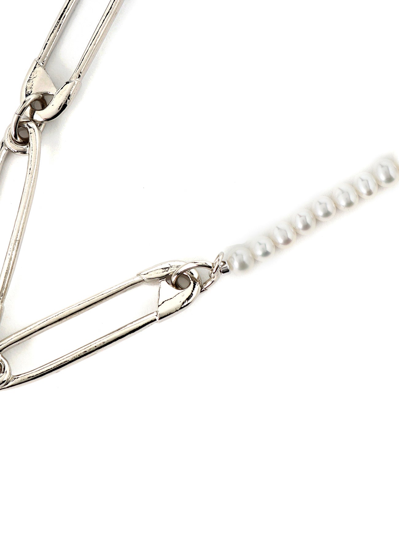 A choker featuring a pearl and pin motif blends these elements stylishly, resulting in a sophisticated look. The contrasting balance between pearls and pins adds elegance. The model wears a sample item; hence, actual sizes and textures might vary. Refer to size info for precise details.