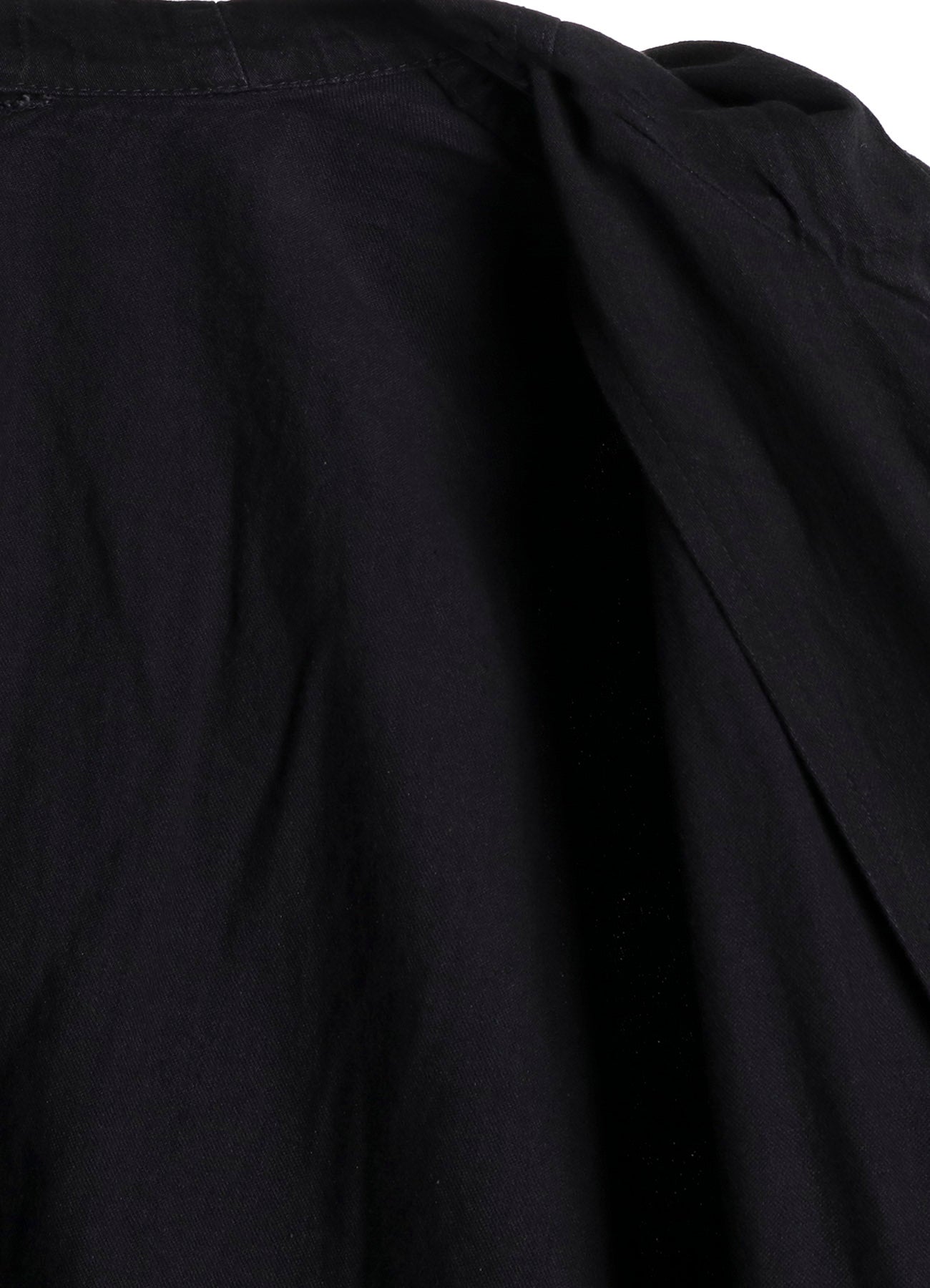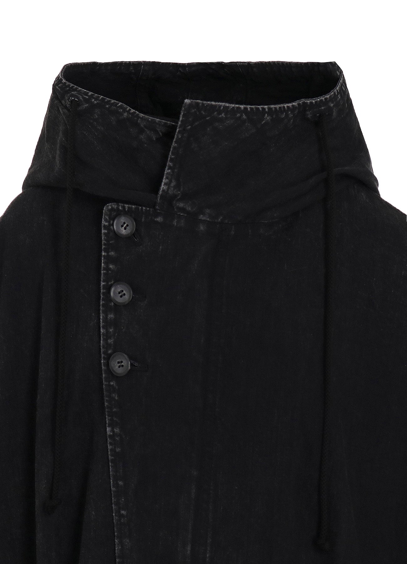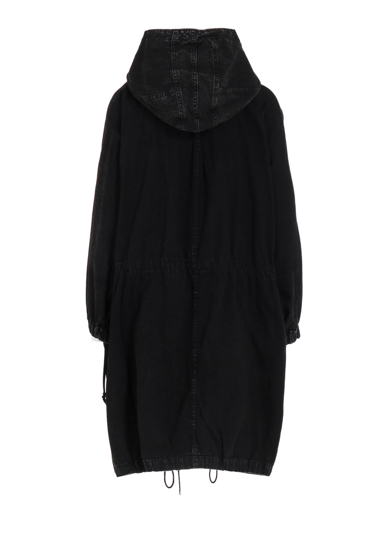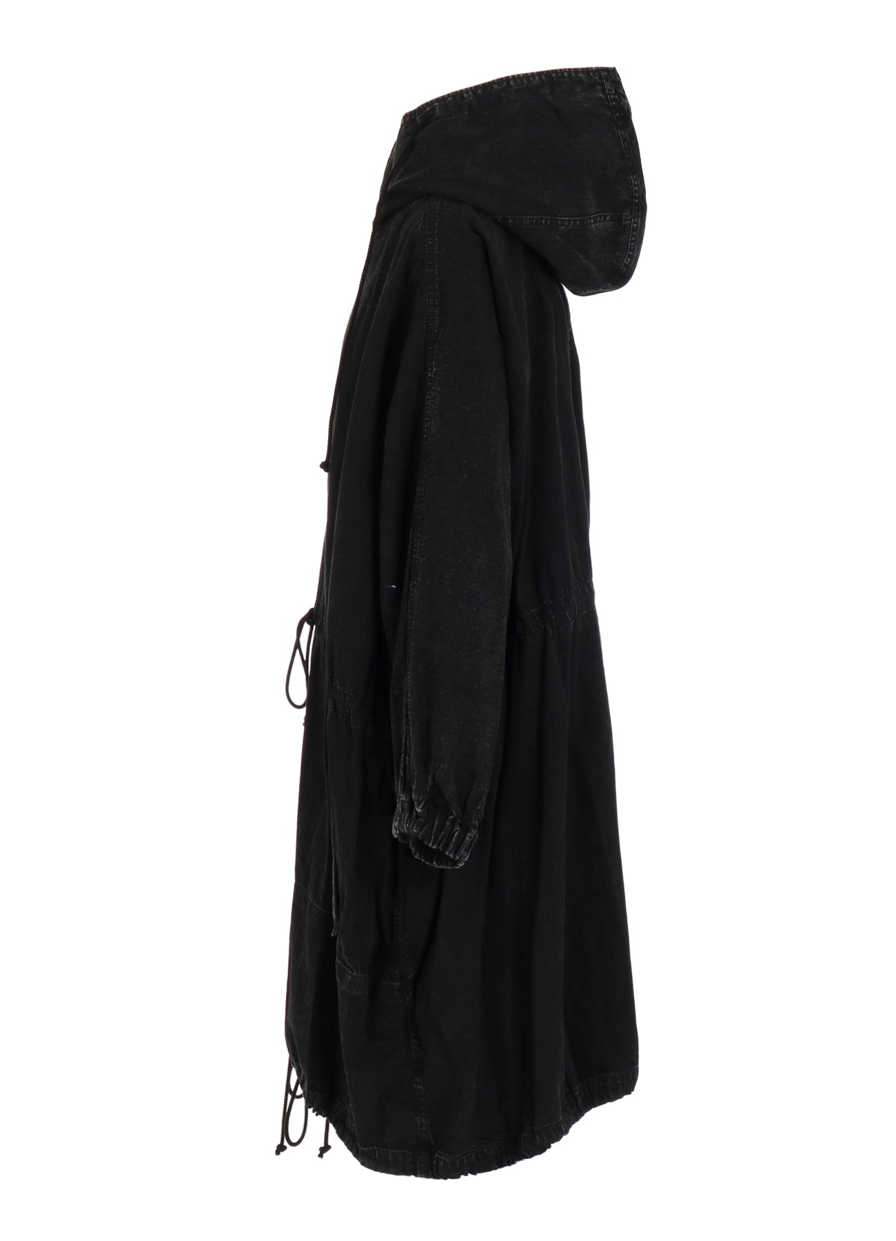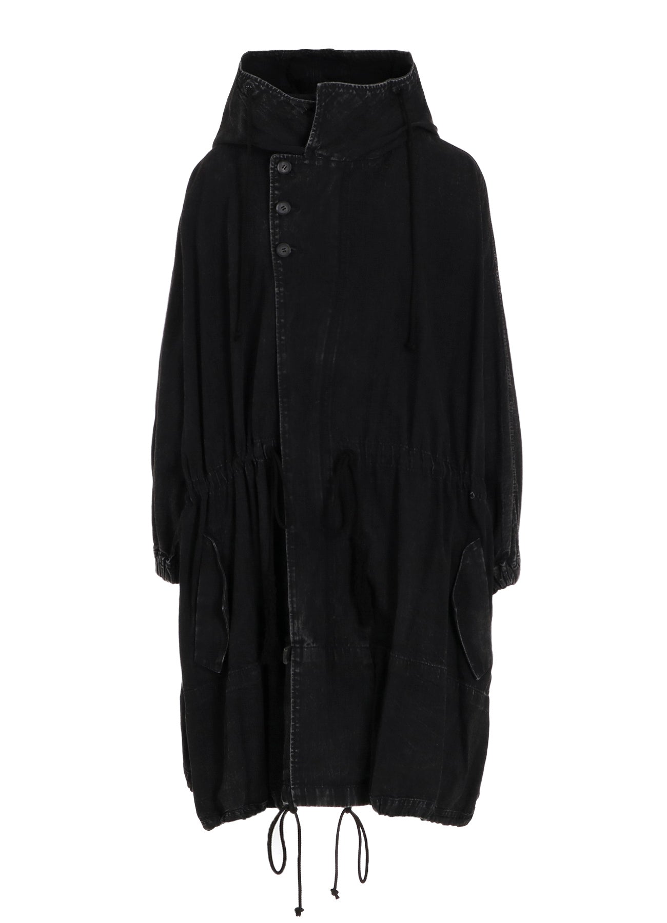 This hooded coat features a gentle drapery with dolman sleeves, providing an elegant silhouette. Designed with a relaxed fit, it pairs well with various inner wears. The waist gathers to showcase a beautiful flared hem. Made from denim fabric dyed with sulfur for a unique finish.
