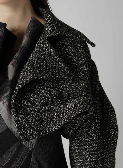 A short jacket with a box motif and expressive tweed material, featured in the Paris Collection. The box motif on the cuffs offers an elegant touch. The tweed combines the drapery of linen, the warmth of wool, and a random mottle feel.