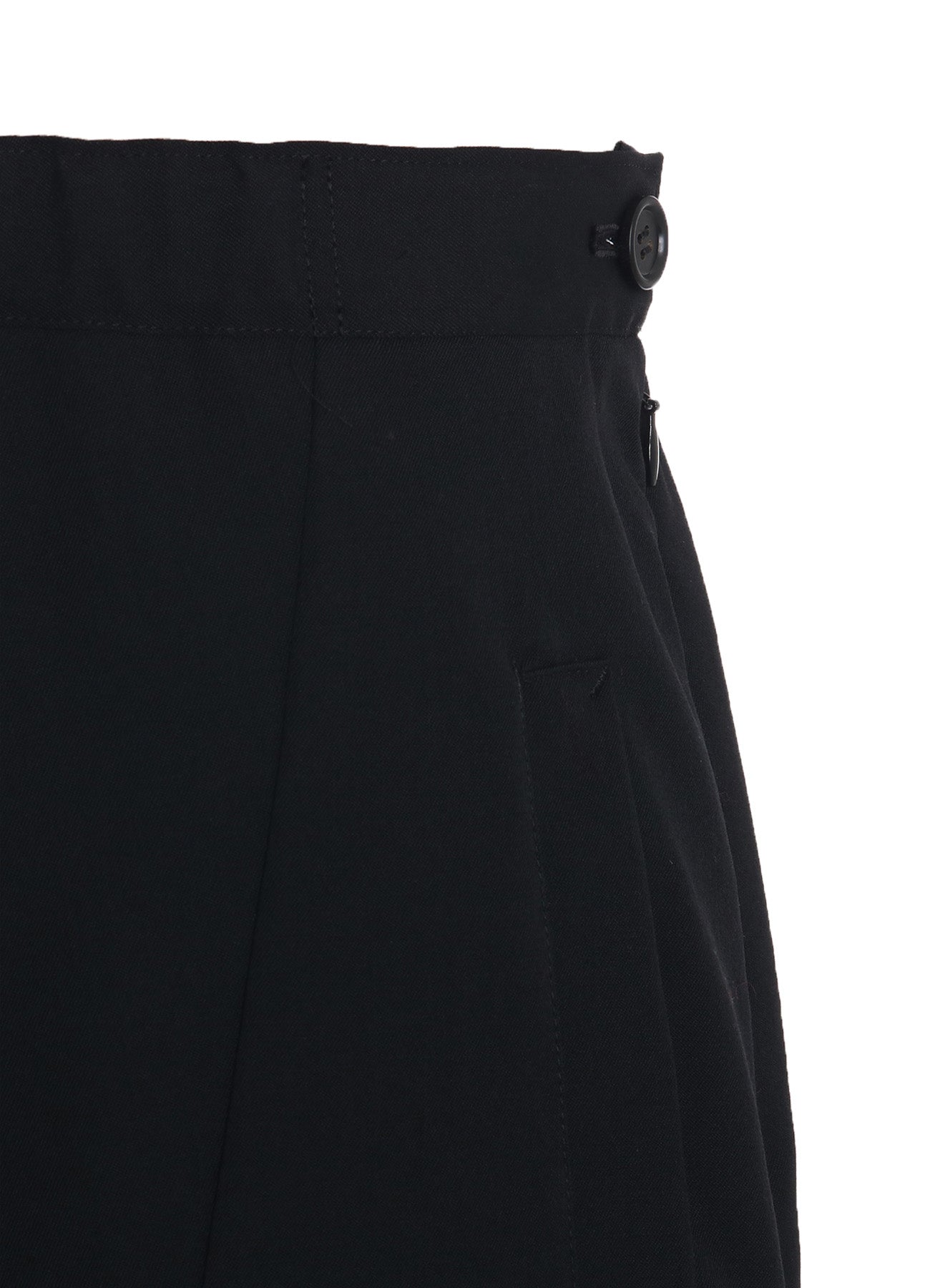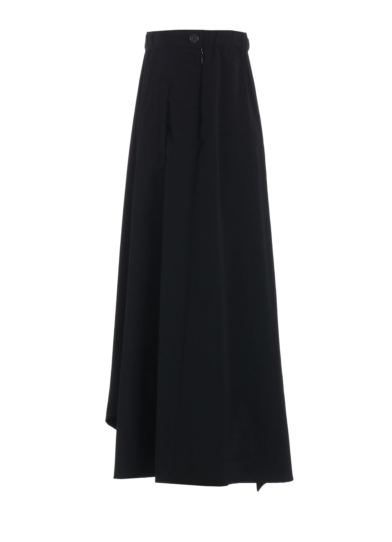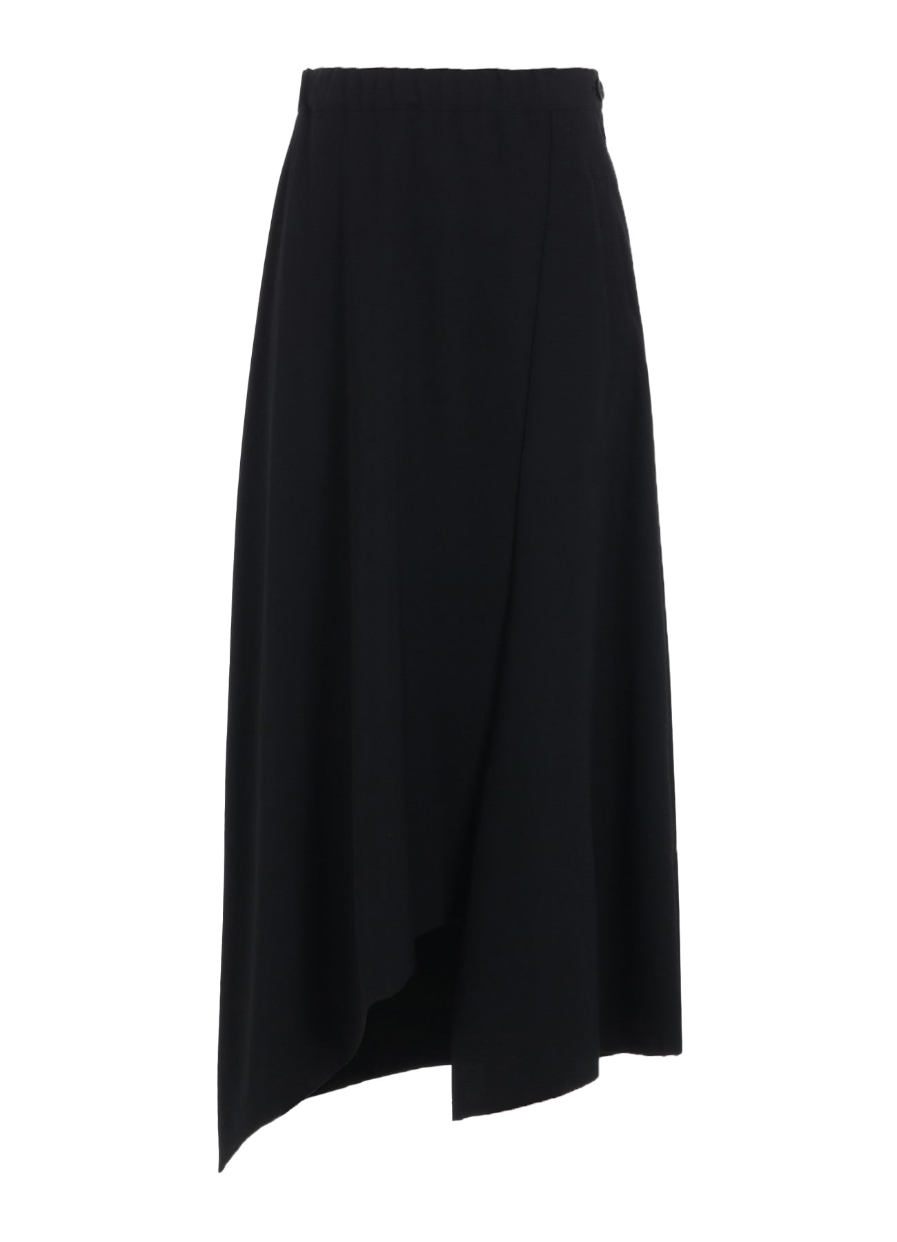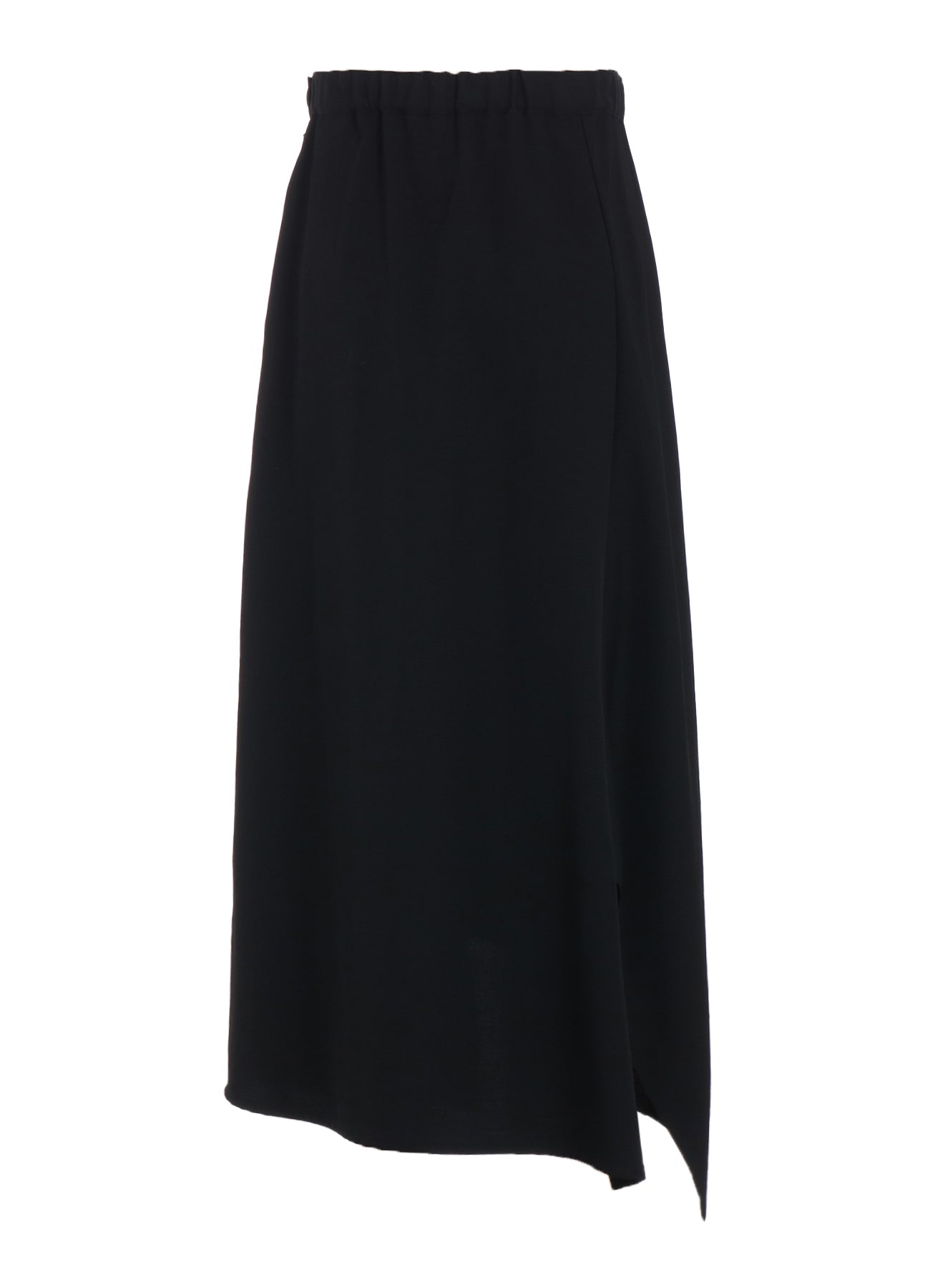 This asymmetric skirt uses Yohji Yamamoto's signature material, wrinkled gabardine, and features an elastic waist. Its soft texture makes it suitable for all seasons, and the silhouette complements any top. The skirt's design and material blend for a lightweight wearing experience.