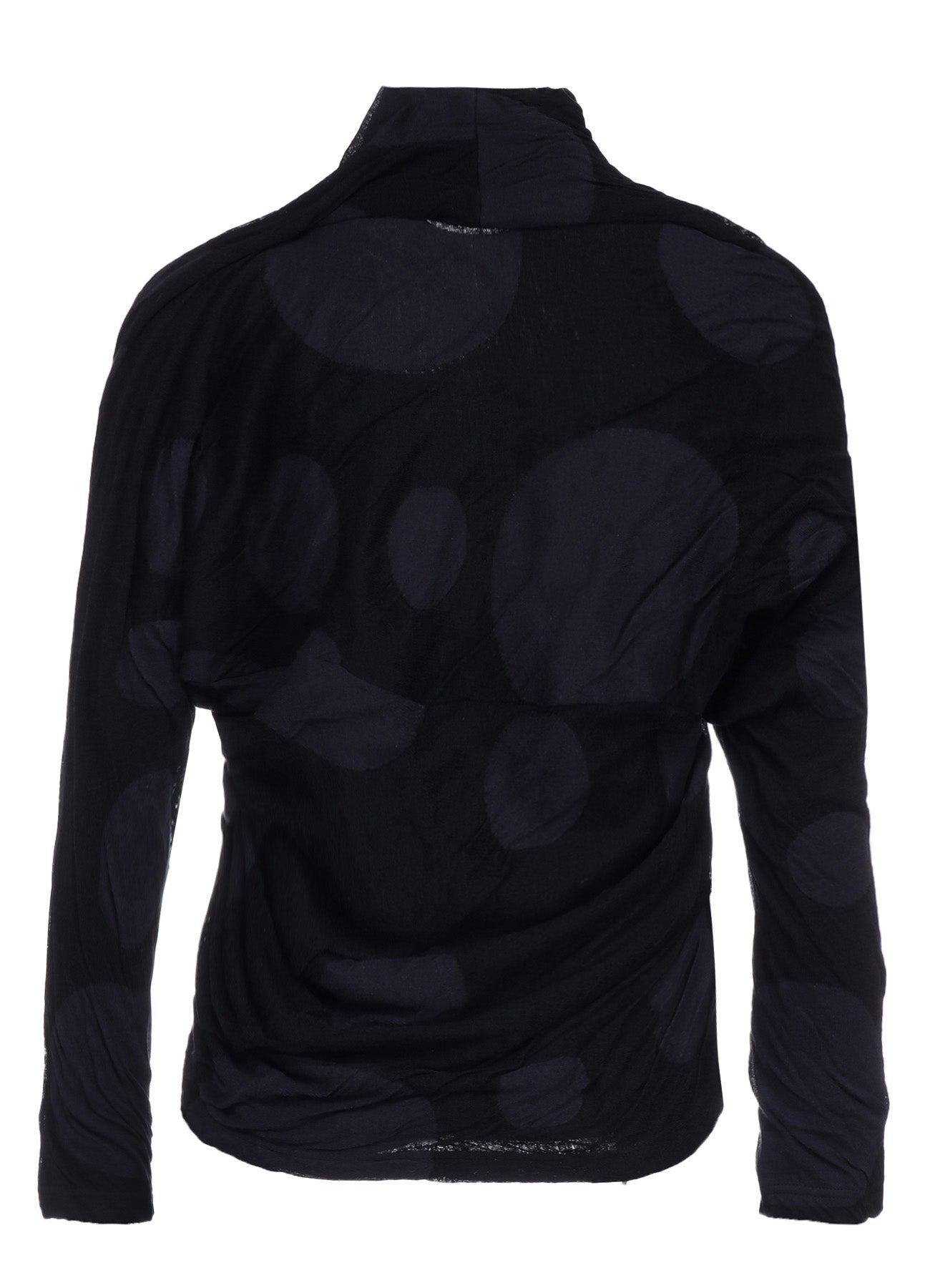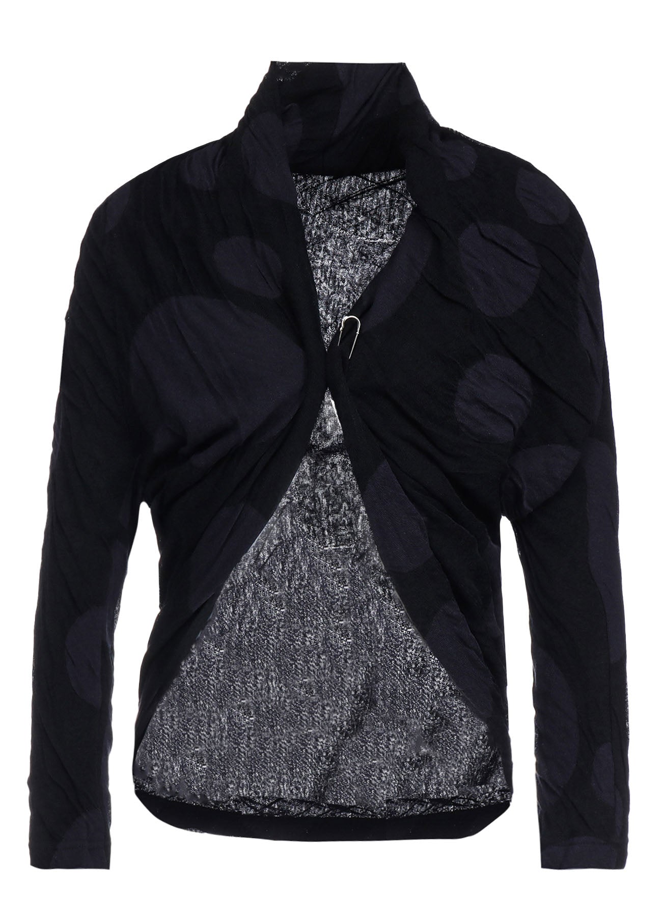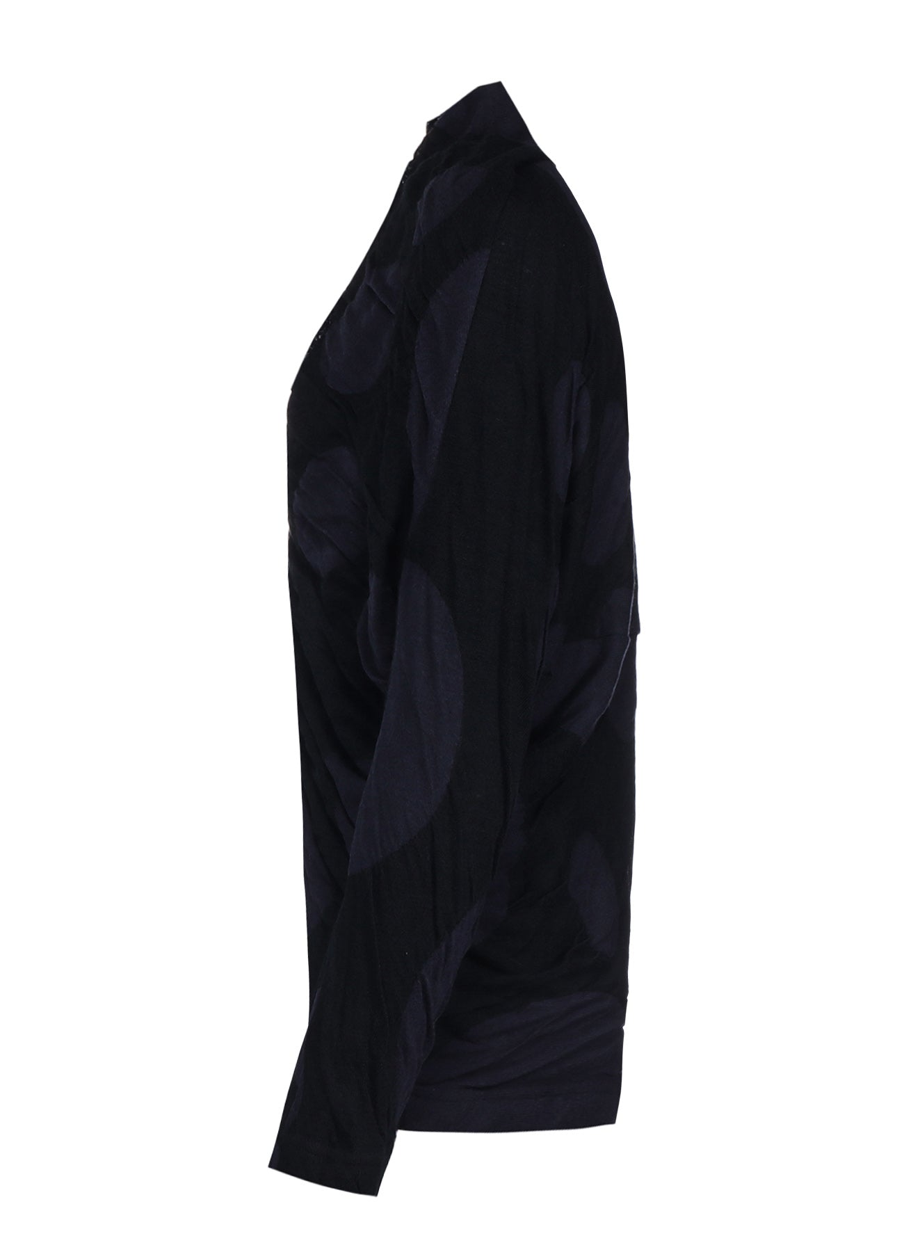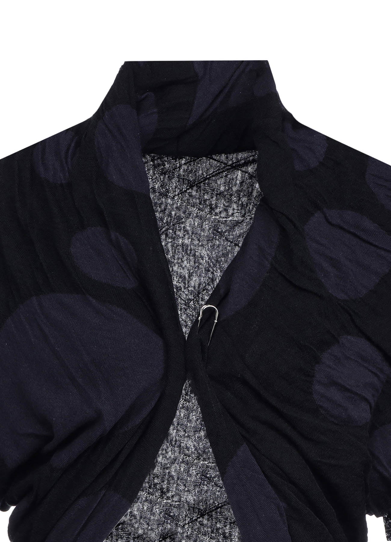 This cardigan features a refined polka dot pattern in a calm color palette. Its simple silhouette makes it suitable for everyday outfits. The fabric is warm and soft, offering stretchability that pairs well with various pants. Please refer to the SIZE INFO for details, as the model wears a sample item which might differ in size and texture.