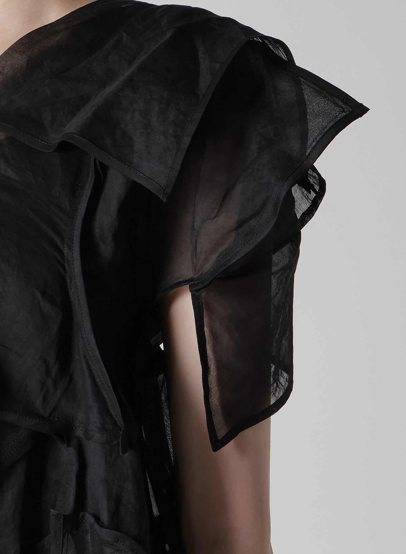 This is a striking, 3D blouse featuring overlapping panel motifs that graced the Paris Collection. Its asymmetric panel arrangement and natural slub yarns showcase the unique hemp texture, enhanced by sun-dying processing. The sample item used for the model may differ slightly in size and texture from the final goods.