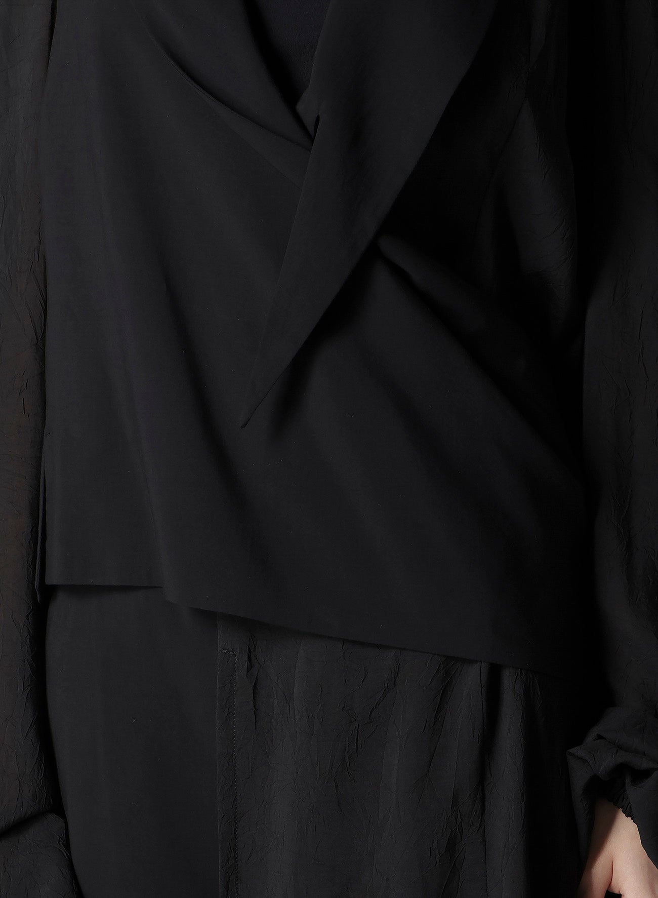 This wrap jacket with transforming sleeves is elegantly designed with a combination of thin rayon for a rich-textured fabric. Its subtle transparency provides a cooling effect and makes it a stylish all-in-one piece. Note that the model images use sample items, and actual products may differ in size and texture.