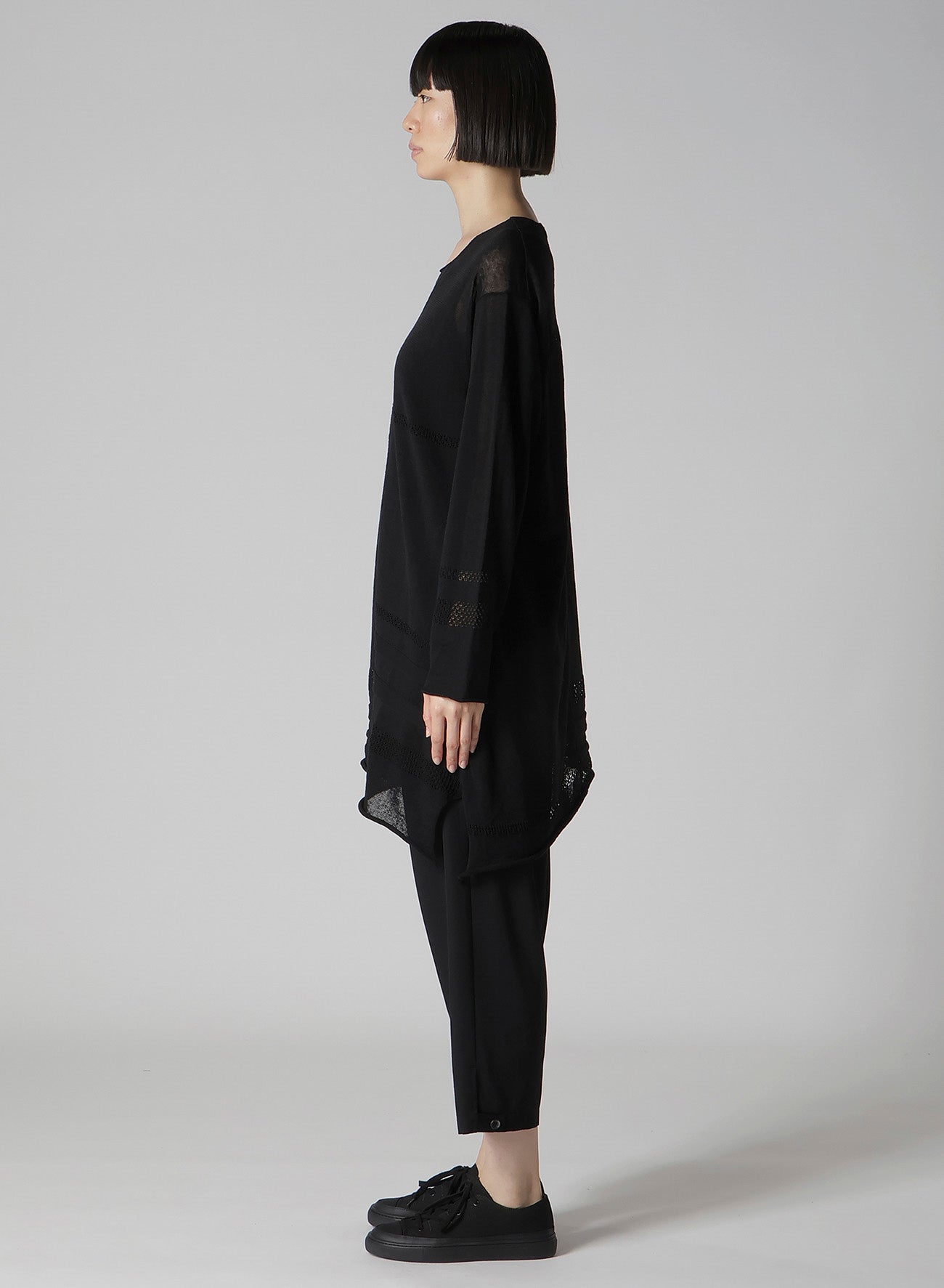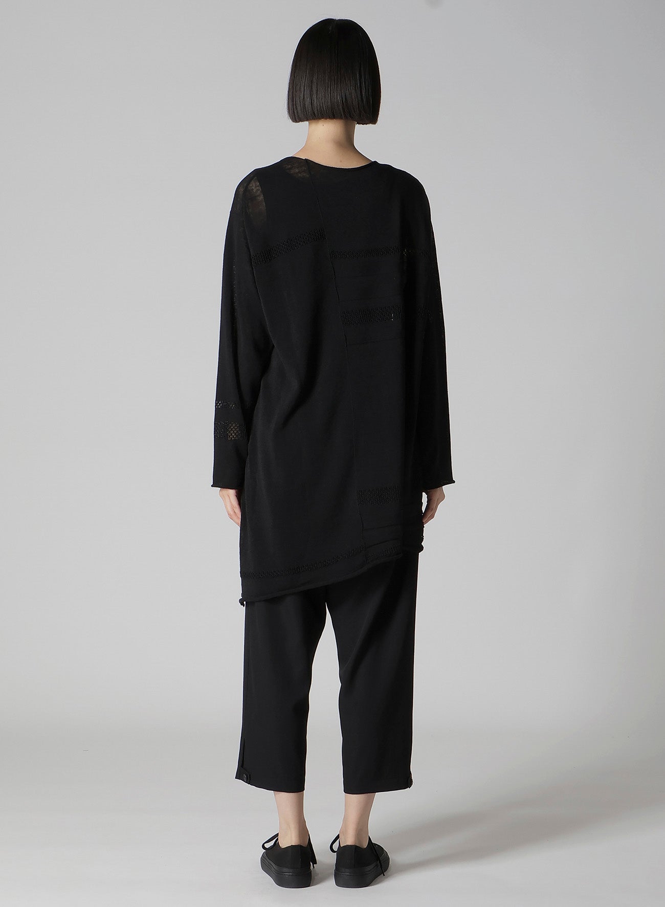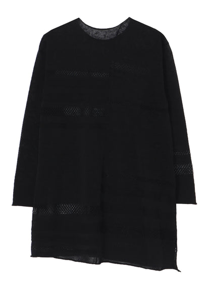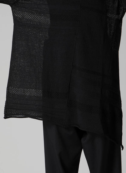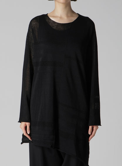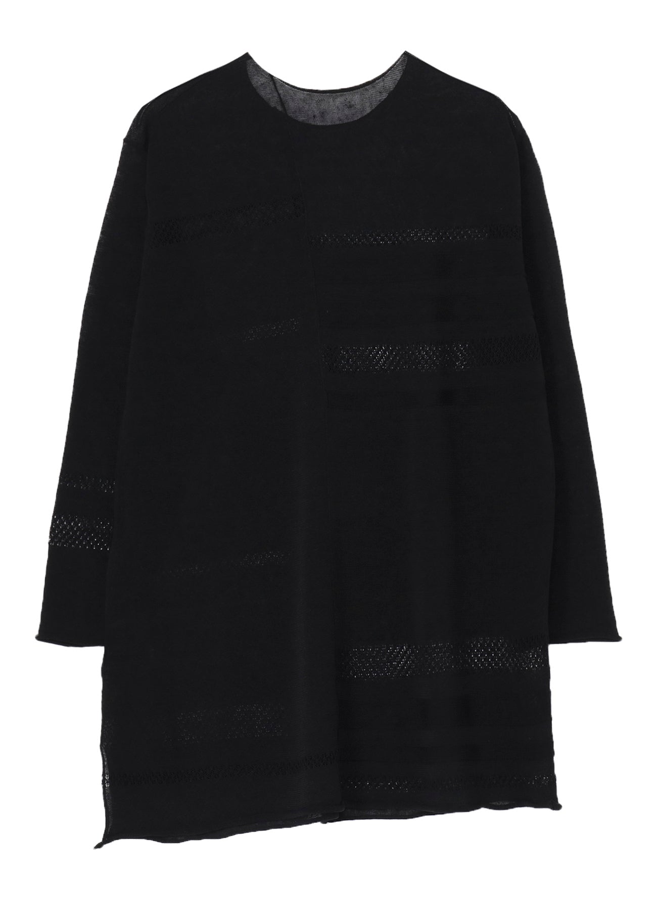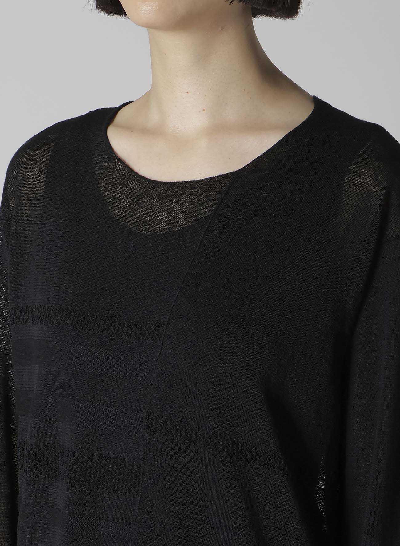 This round-neck pullover knit features a beautiful sheer appearance, made using the finest flax for a refreshing feel. It boasts a loose-fitting silhouette that ensures comfort. Please note that images feature a sample item, and the final goods may differ in size and texture. For accurate size details, check SIZE INFO.