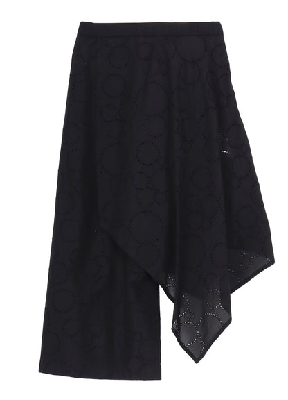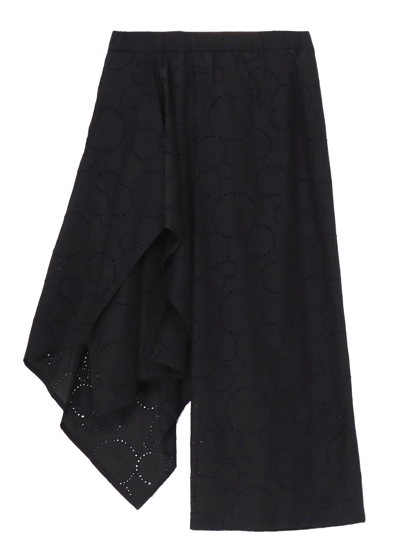 These asymmetric pants are crafted from "bora lace" with a refreshing silhouette featuring an expressive dot pattern. The playful design alternatively finishes areas with detailed stitching or leaves them unstitched for added texture. For a confident wear, pair with leggings due to the sheer fabric.