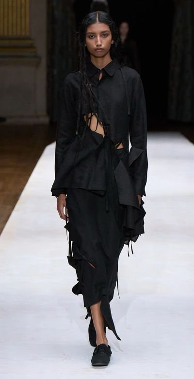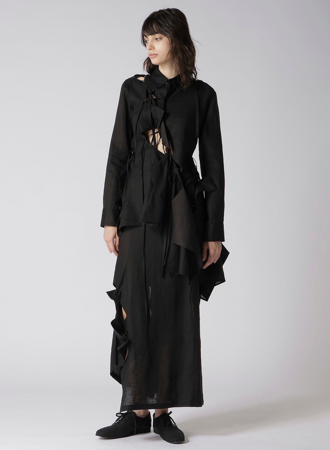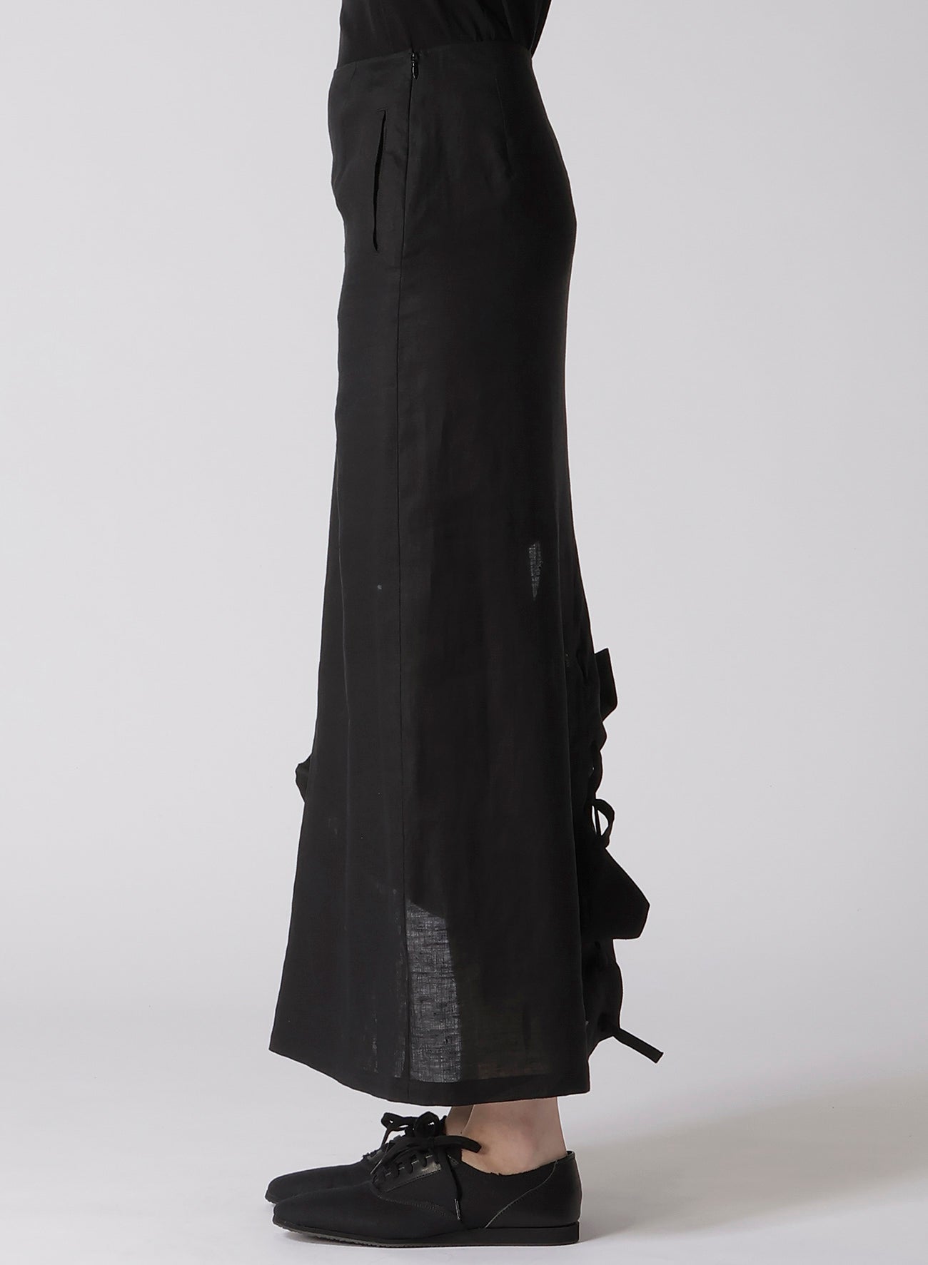 This asymmetric long skirt made from refreshing, flowing linen fabric stood out in the Paris Collection. Its unique silhouette is enhanced by multiple layered strings. The model image uses a sample item. Actual product size and texture may vary; please check SIZE INFO for details.