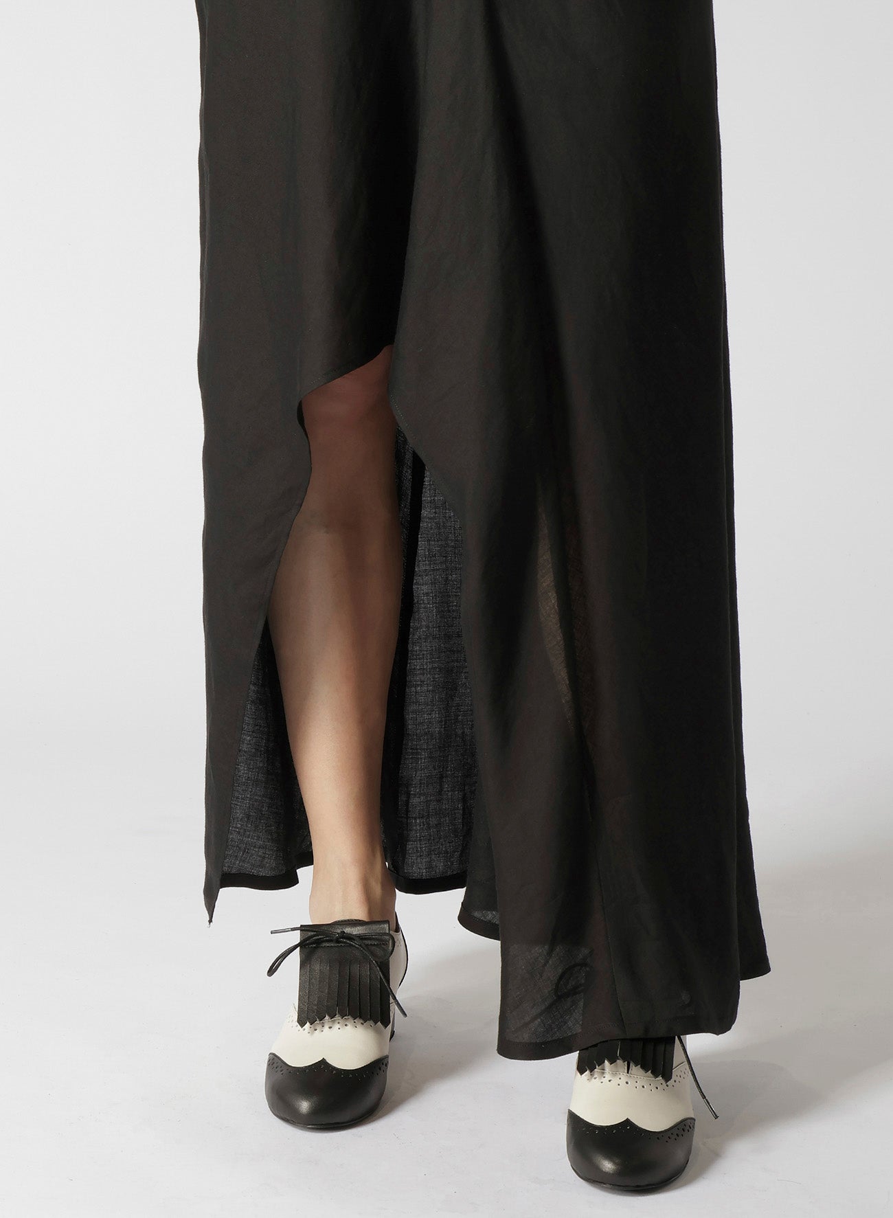A long skirt with a front-style cutout for a light and breezy impression. The material balances firmness and drapery, providing a soft, voluminous texture. Lightweight for comfortable wear. Model images use sample items, and actual product sizes or textures may vary. Please refer to SIZE INFO for details.