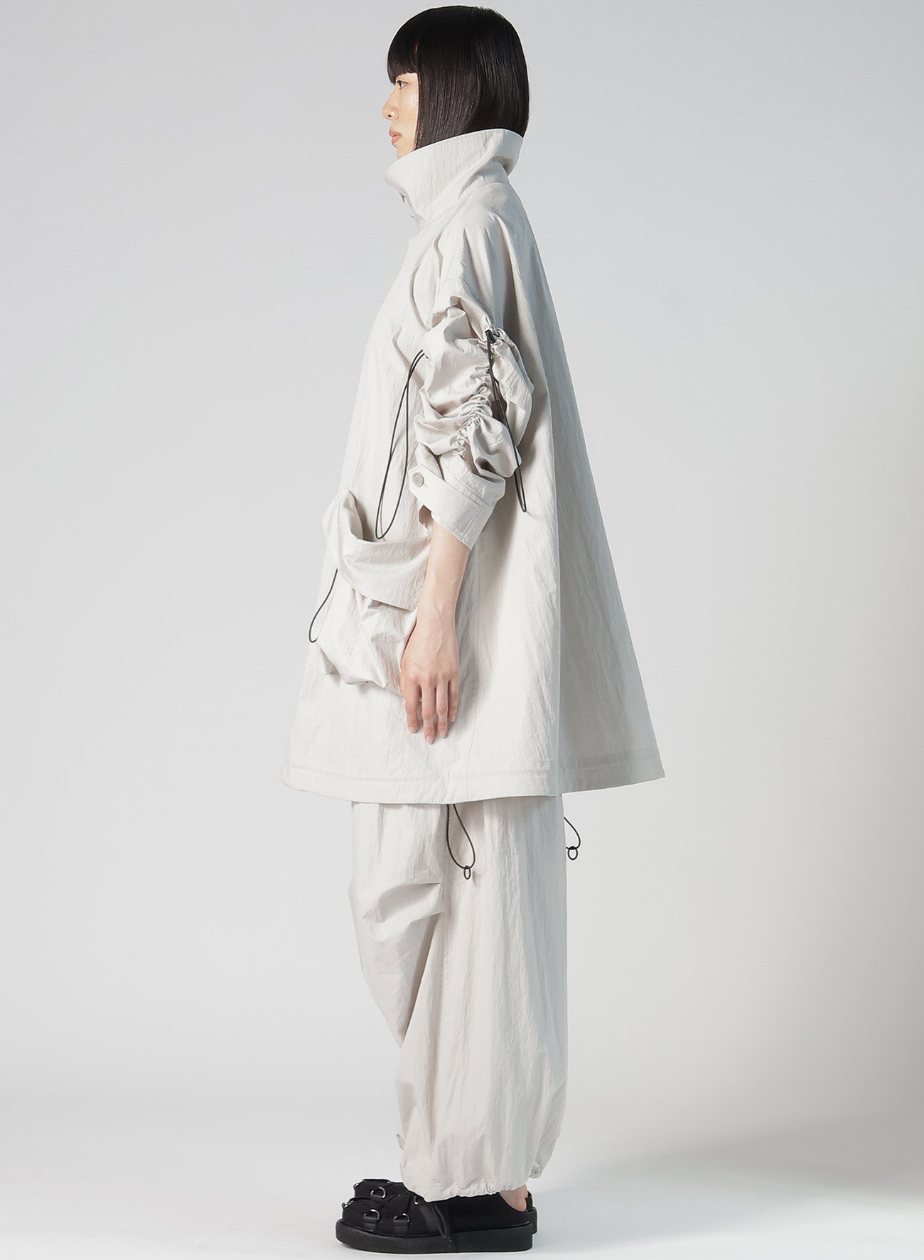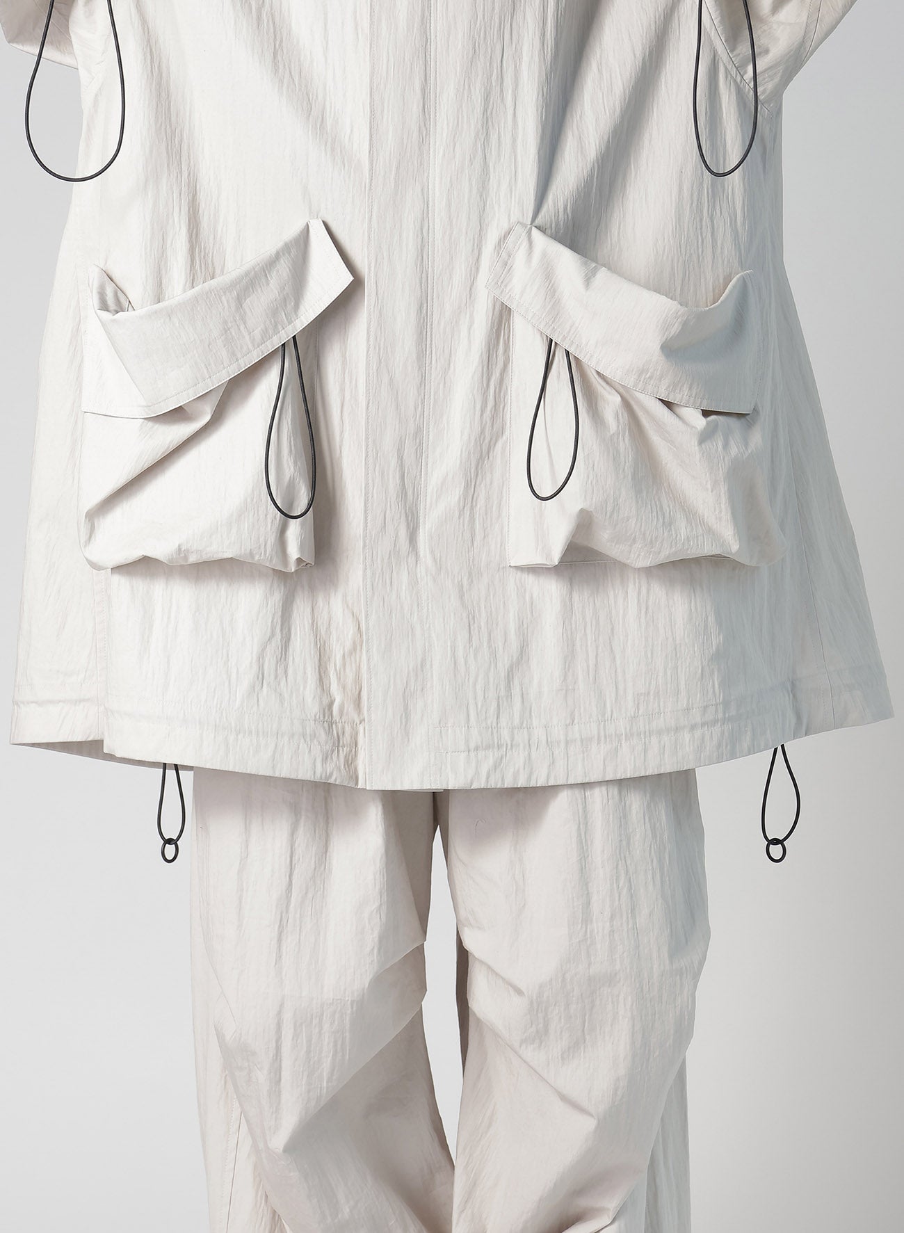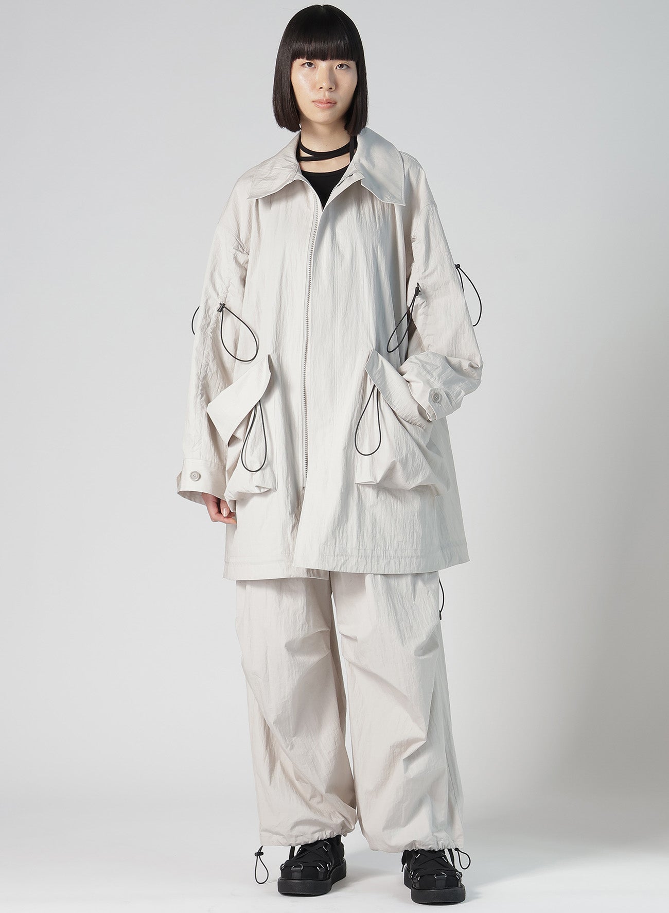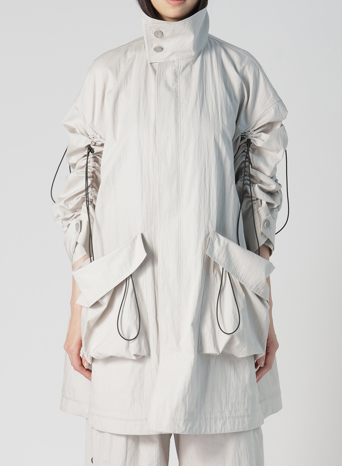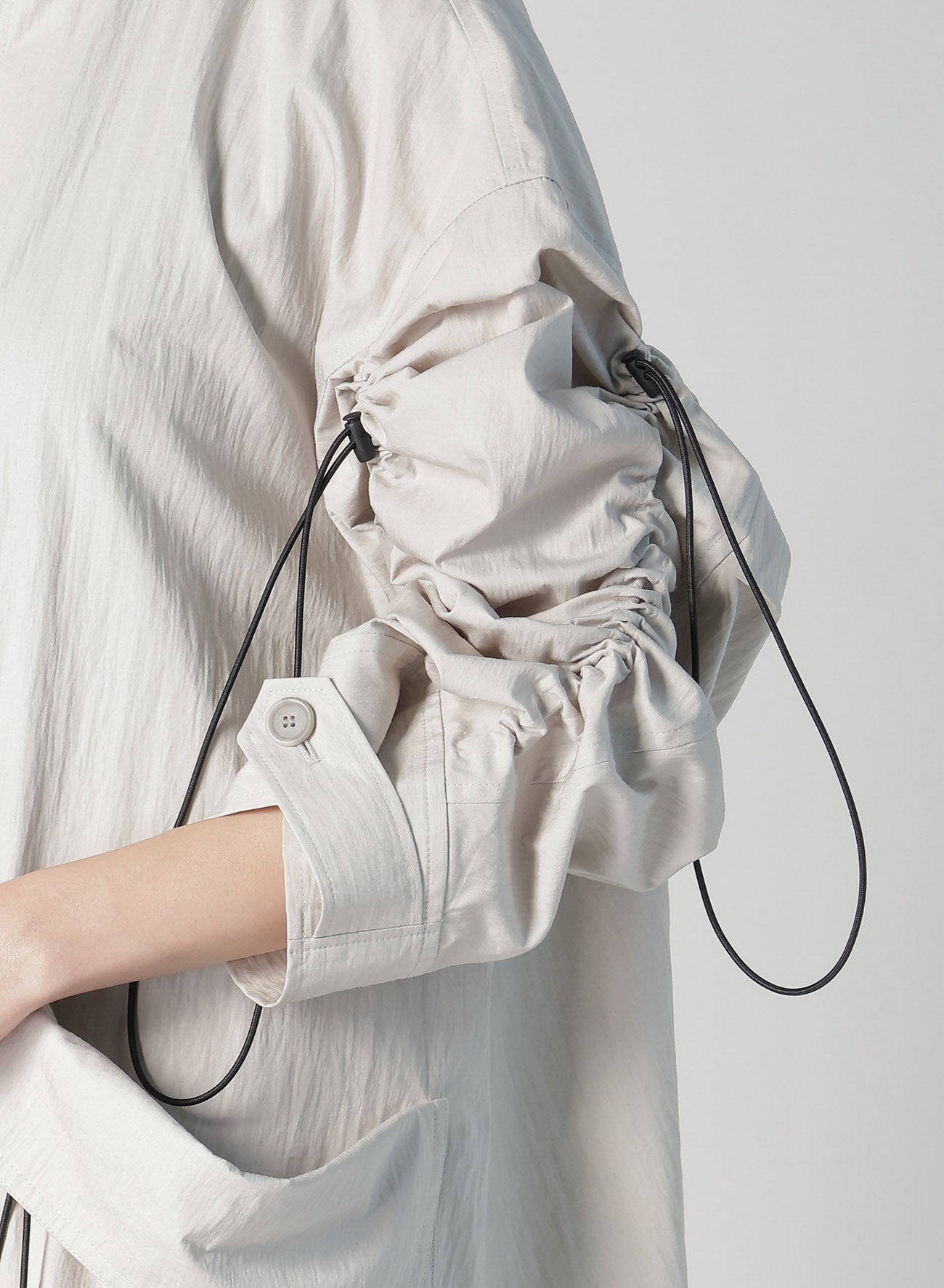 This relaxed-fitting Adjust coat features a drawstring to create gathered tiers for a customizable silhouette. Despite its voluminous shape, the lightweight fabric ensures a breezy wear. The unique texture is reminiscent of softened weathered materials, finished naturally by air drying. Please check SIZE INFO as sample images may differ from final goods.