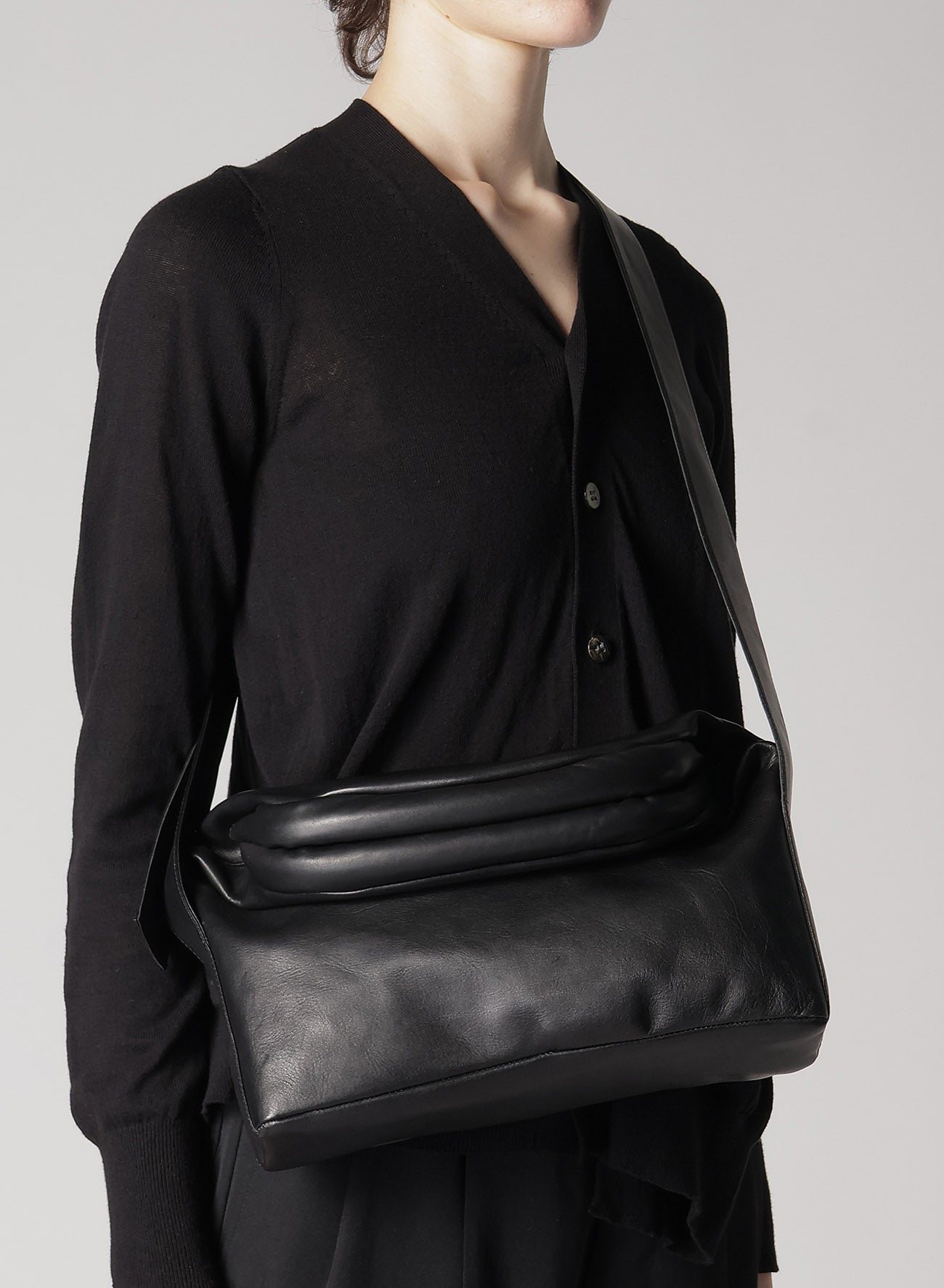 This shoulder bag features a striking clasp design and a silhouette that is both bold and practical. Made with skin-friendly oil leather, it offers easy access and ample storage capacity, blending material and design for a lightweight carry.