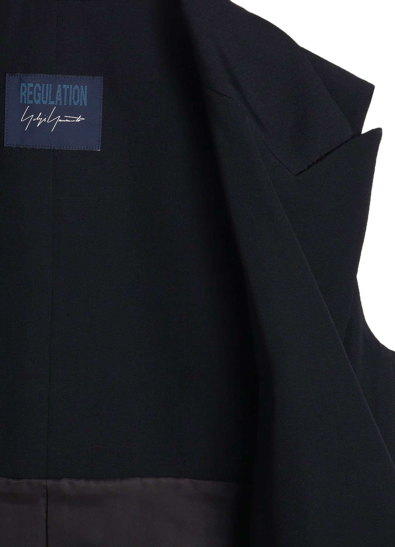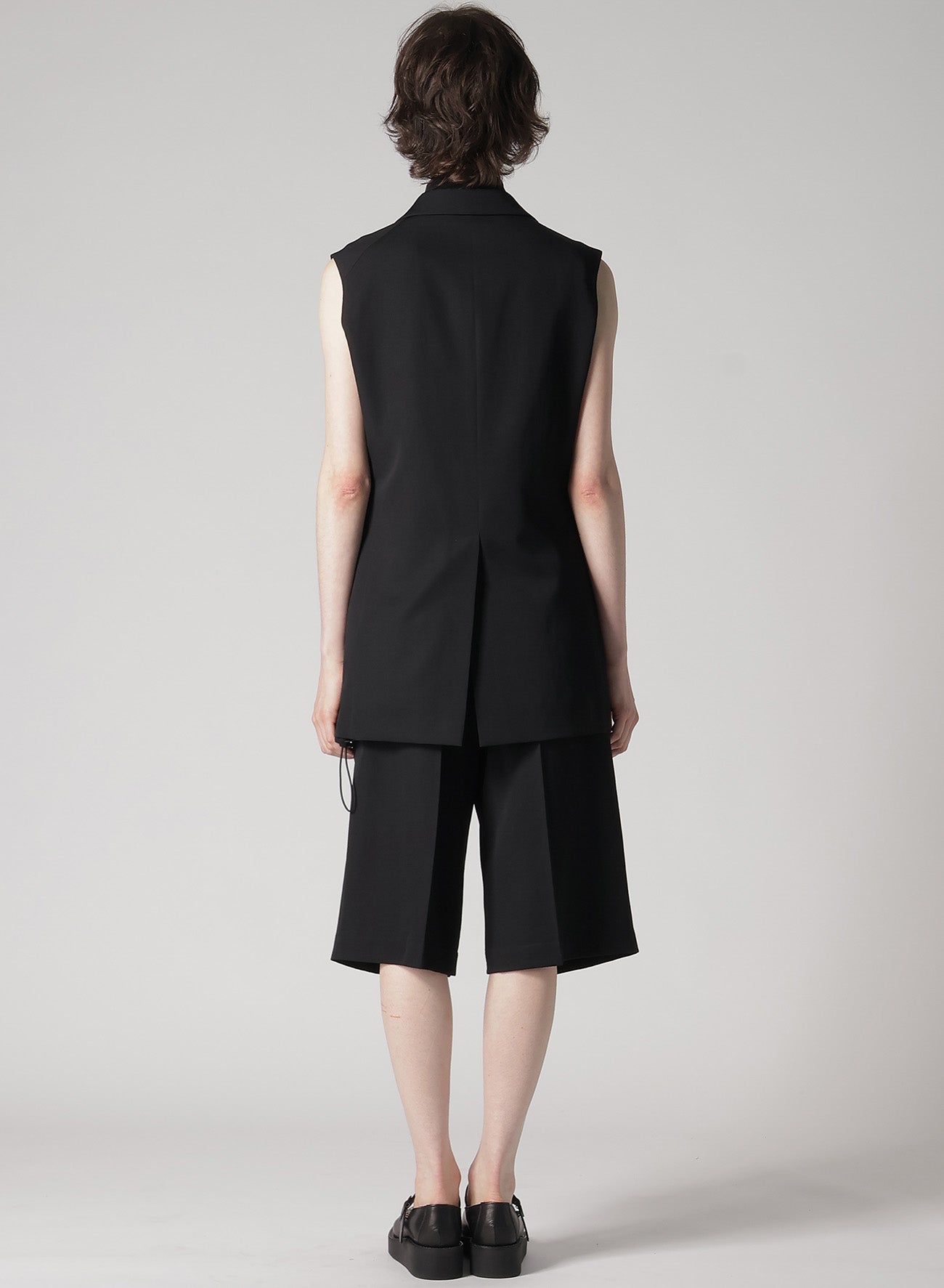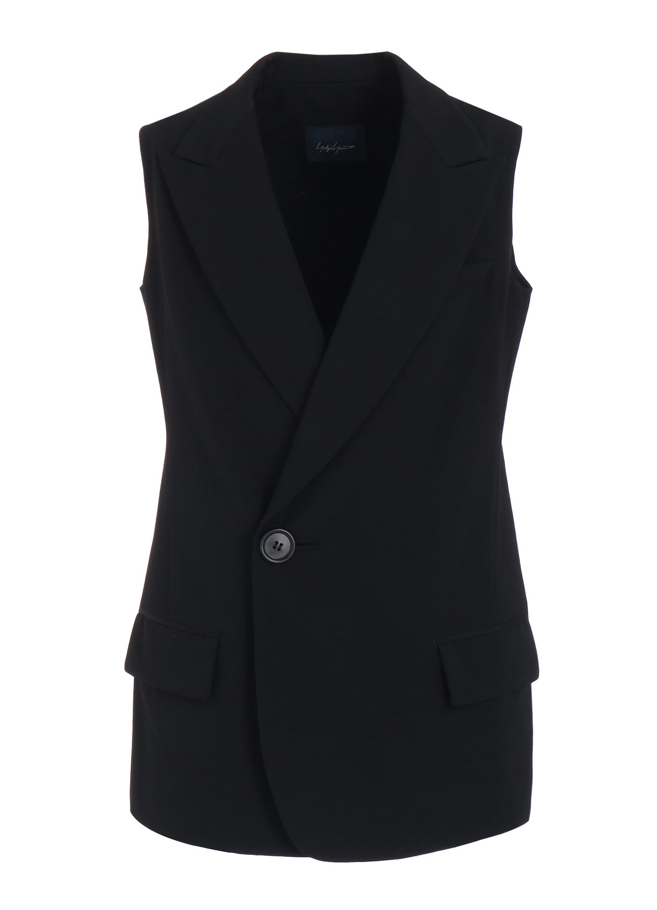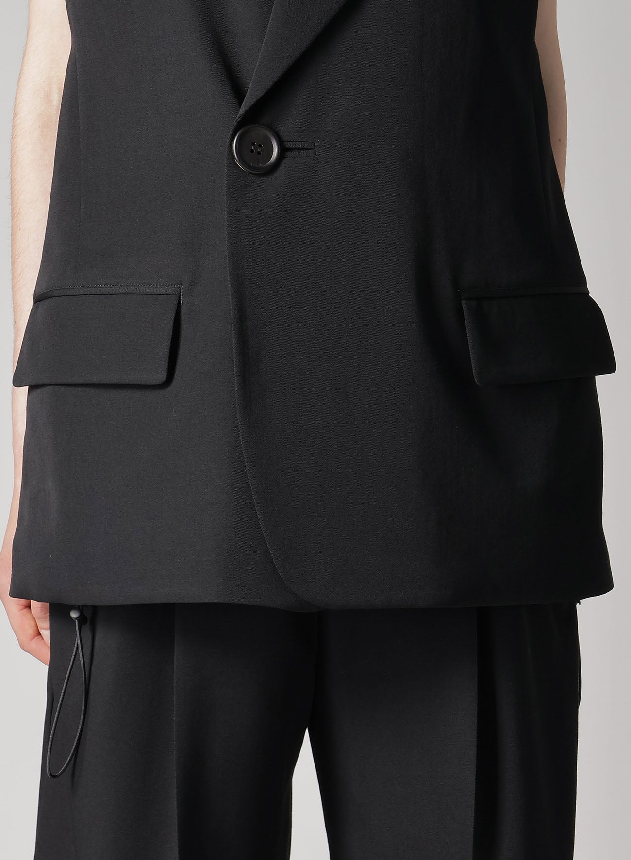A sleeveless jacket by Yohji Yamamoto made from signature wrinkled gabardine fabric, showcasing a beautifully tailored silhouette. This jacket is versatile, making it ideal for formal events and business settings. Note: The model images use sample items; size or texture may vary. Please refer to size info for details.