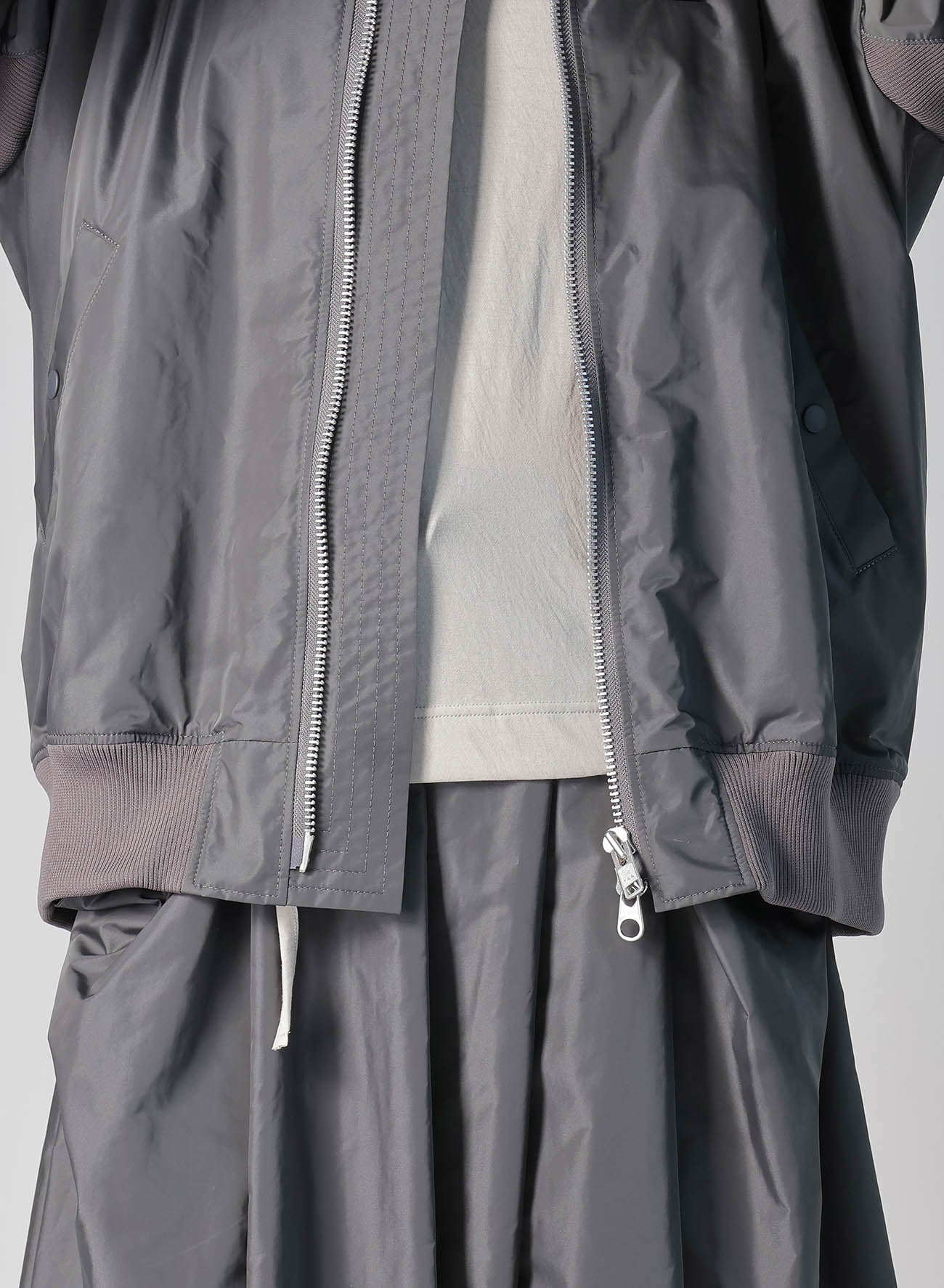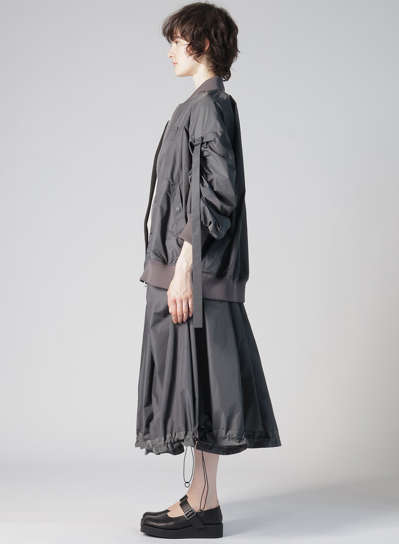 This bomber jacket from REGULATION Yohji Yamamoto features a light polyester fabric with a belt on the sleeves, enhancing the silhouette. With its loose fit and user-friendly material, it is perfect for everyday wear. Note that the model images are sample items and may differ from the actual product in size and texture.