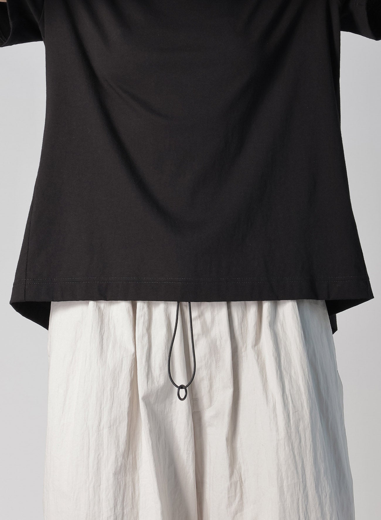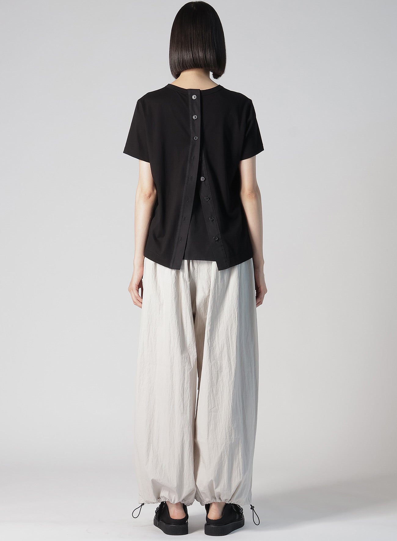 The short-sleeved top showcases a striking use of buttons in the back, offering a comfortable silhouette with a soft touch. You can enjoy silhouette adjustments by changing the way you fasten the back buttons. Made with a unique plain stitch material featuring a distinct gloss and drapery, it pairs well with any pants.