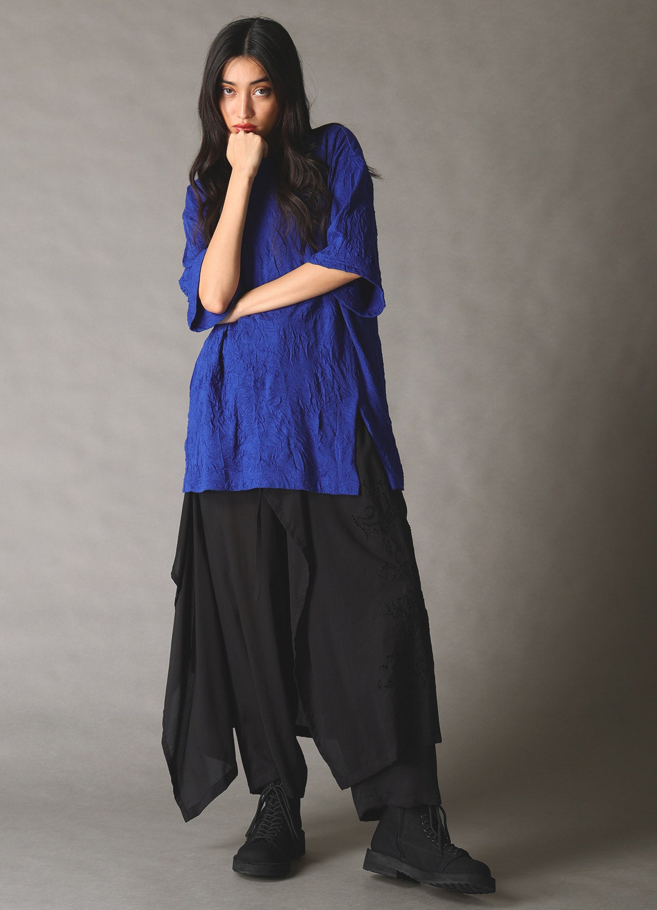 This top from Ground Y’s 2026 Spring/Summer Collection features intricate details like vertical combinations, slits, and a unique neckline. Made from a cotton and polyester blend with a plain stitch and washer processing, it exudes a natural texture with a comfortable, lightweight finish.