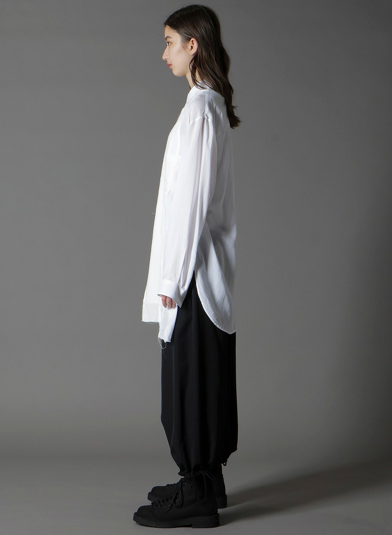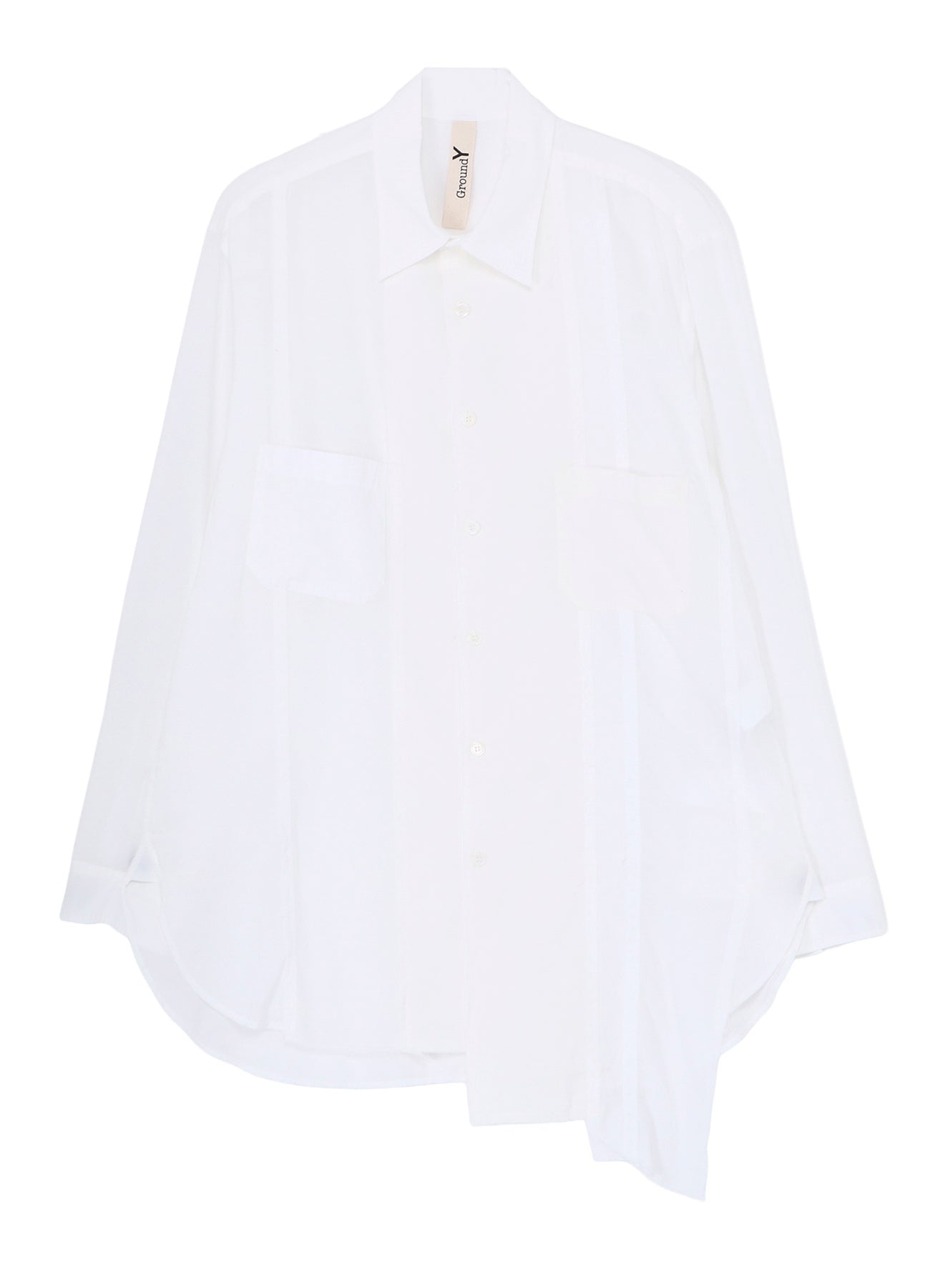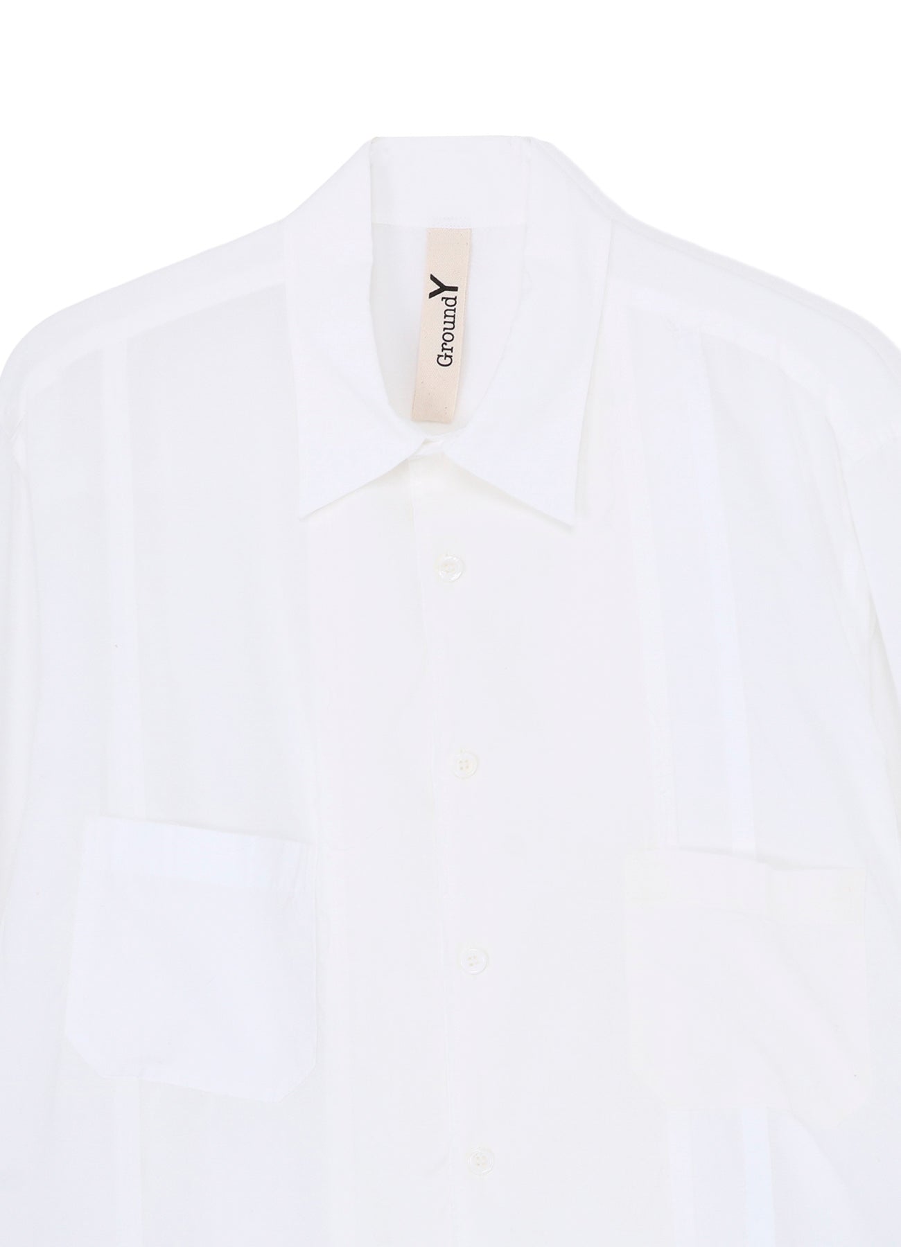 The Ground Y 2025-26 Autumn/Winter Collection presents a design shirt crafted with different materials. It features outer pockets on both chests. The shirt undergoes soft-washing for a pleasant texture. The material combination includes a soft Tencel lawn base, with the use of "basic cotton broad" and "cotton-linen poplin."