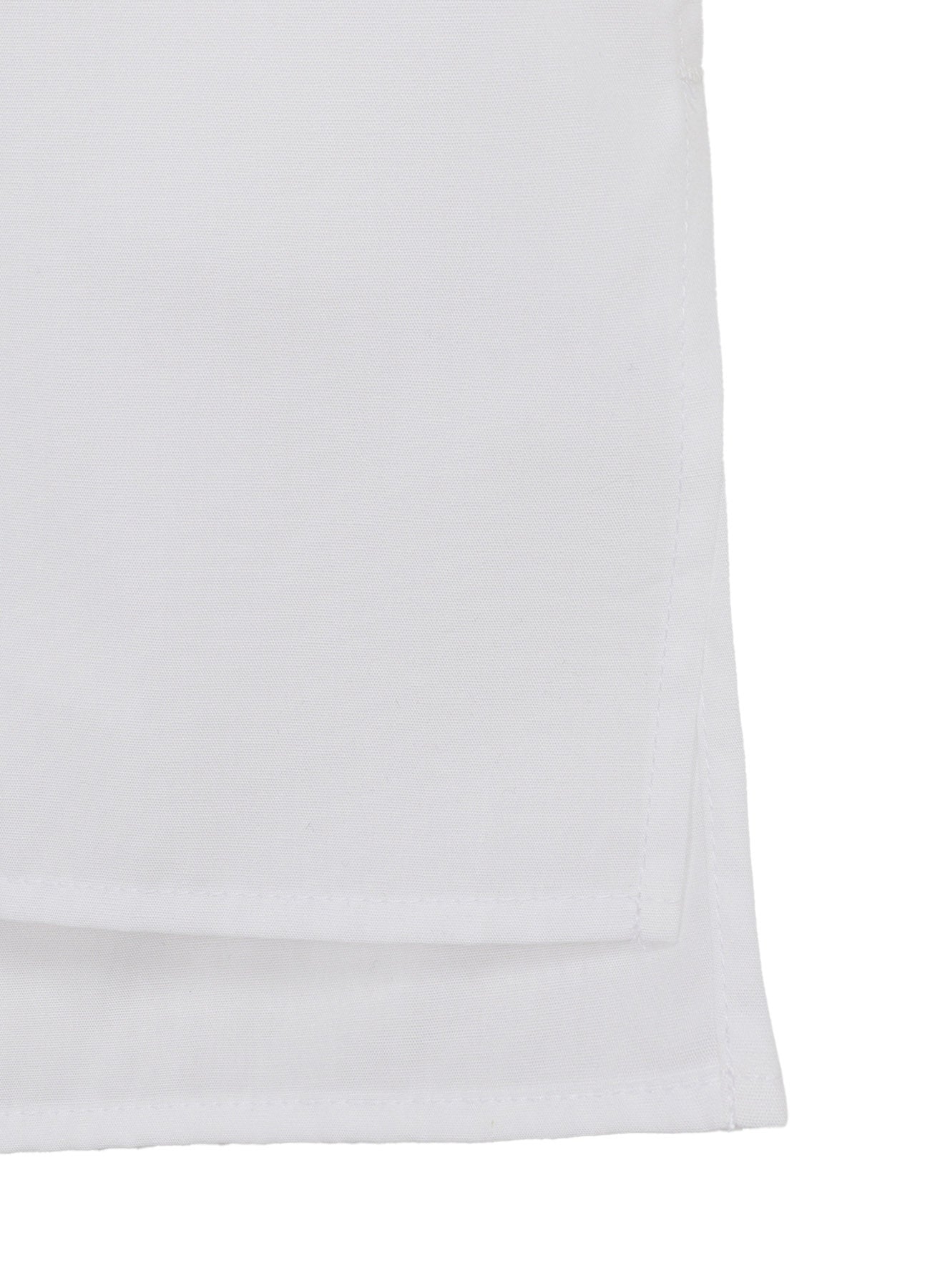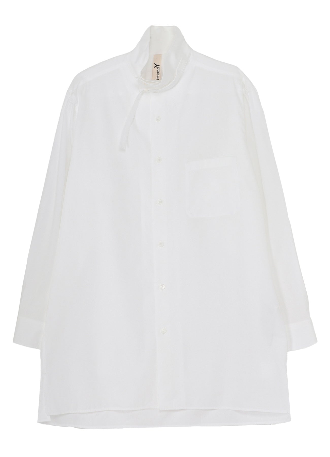 A tailored long shirt with a high standing collar secured by three buttons and an included belt for versatile styling. It features gathers on the back and side slits. Made from 100% cotton broadcloth, it offers a delicate and comfortable feel, suitable for all seasons.