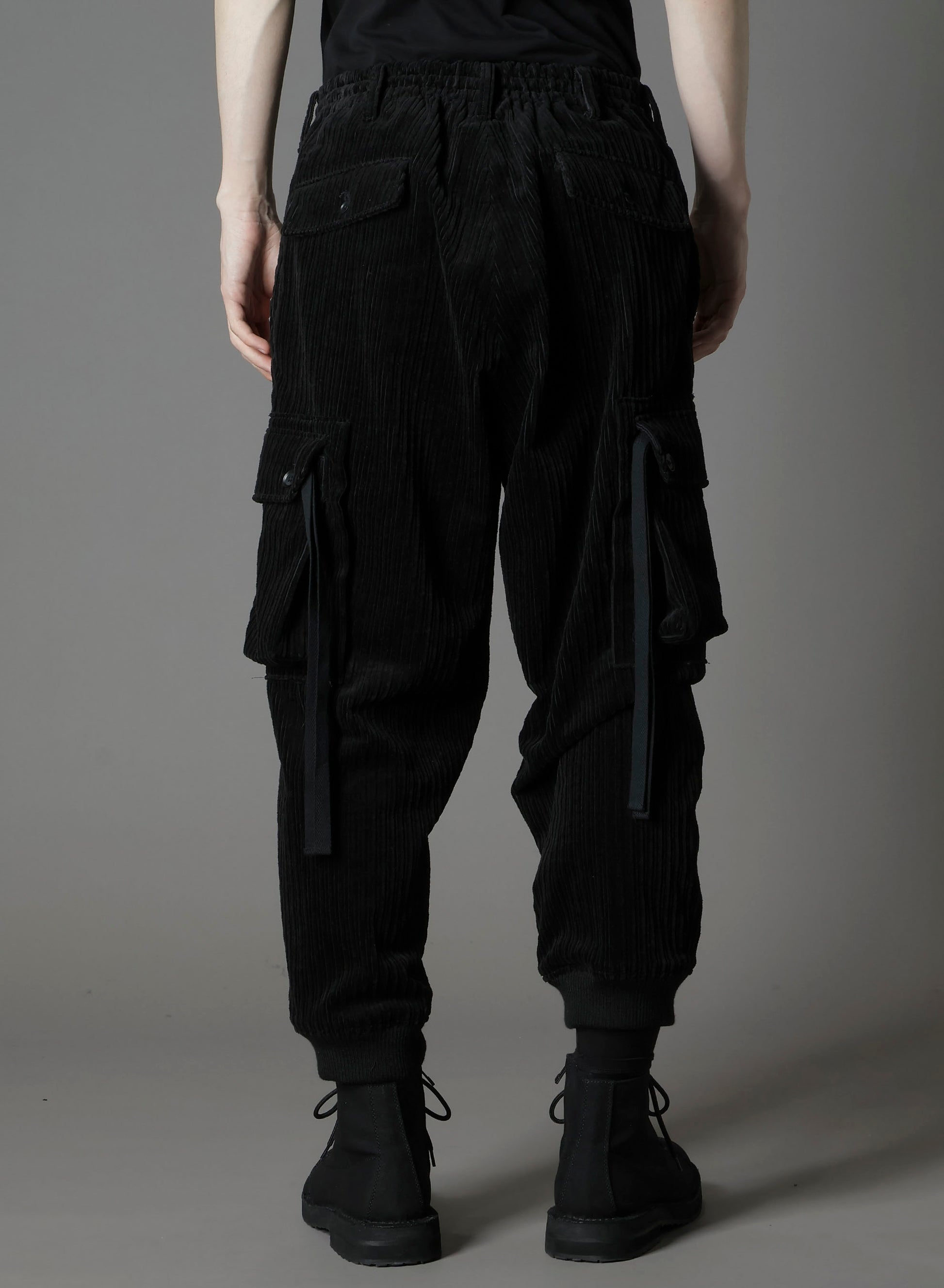 This description is for Ground Y's 2025-26 Autumn/Winter collection featuring cargo pants with cuffed hems. The pants are made from high-quality Japanese corduroy, which features a unique weave pattern obtained through Air Tumbler processing. These pants offer a visually rich texture, accented by large pockets with dangling cords.