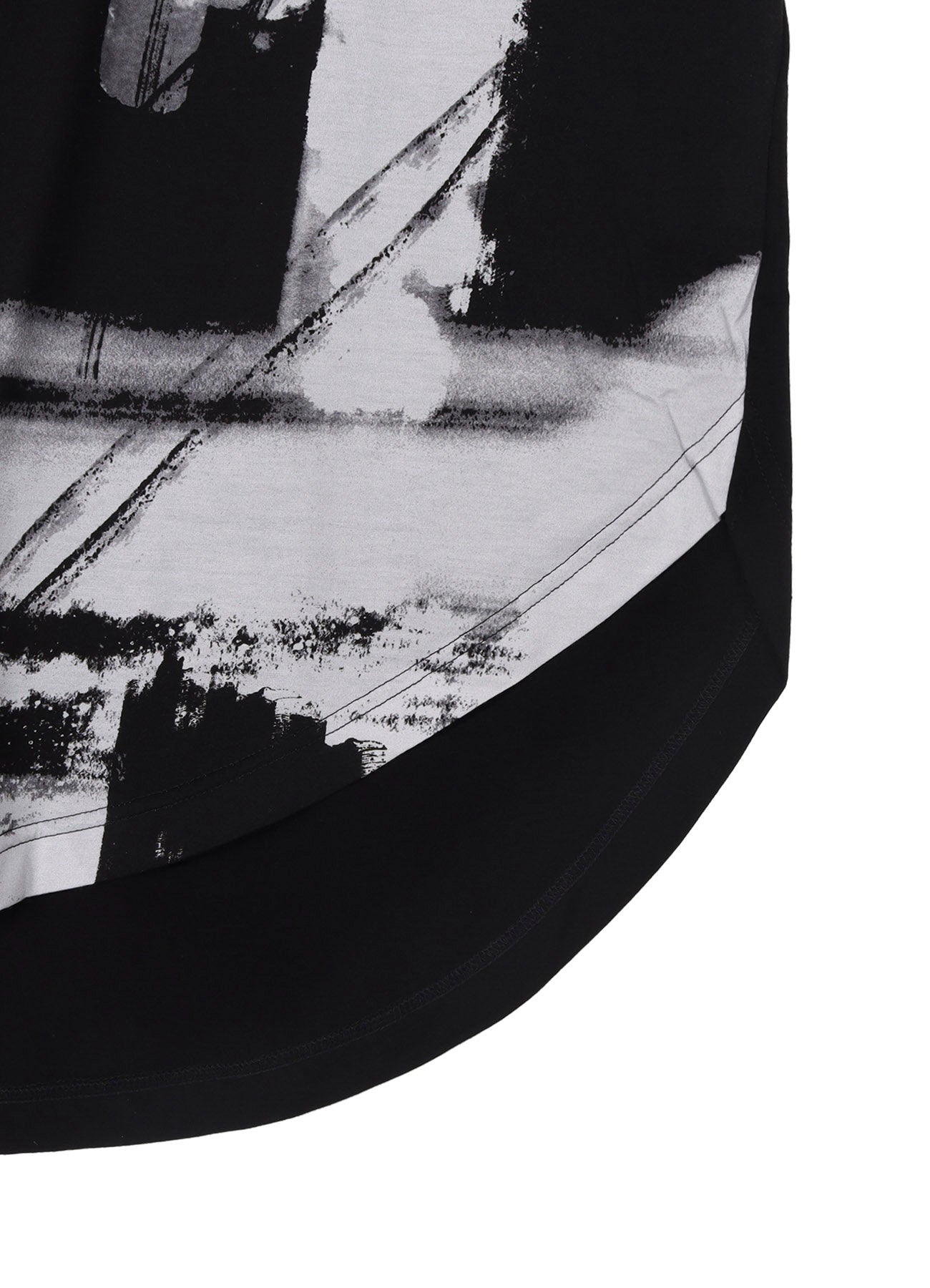 Ground Y's 2025-26 Autumn/Winter Collection features a memorable oversized top characterized by its rounded hem. The striking design combines various brushstroke patterns printed on a smooth touch thin fabric, creating distinct textures through variations in brush width and strength for a uniquely artistic feel.