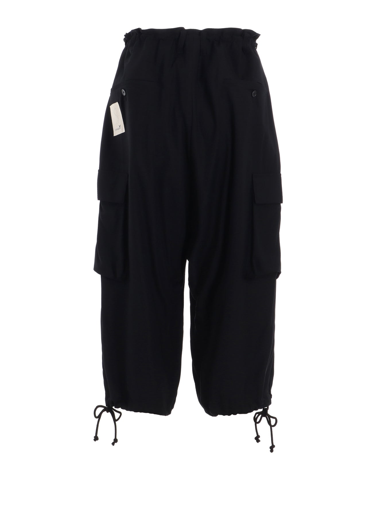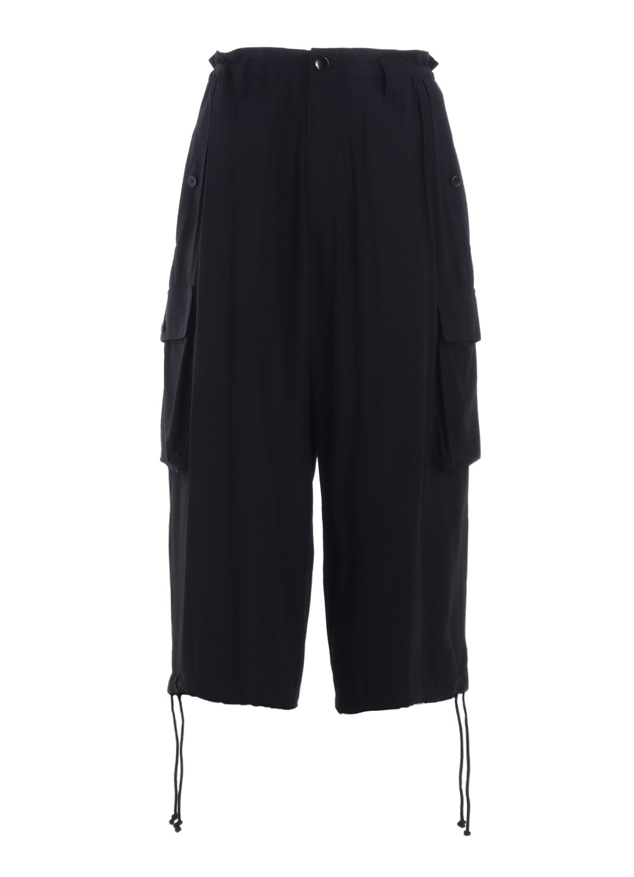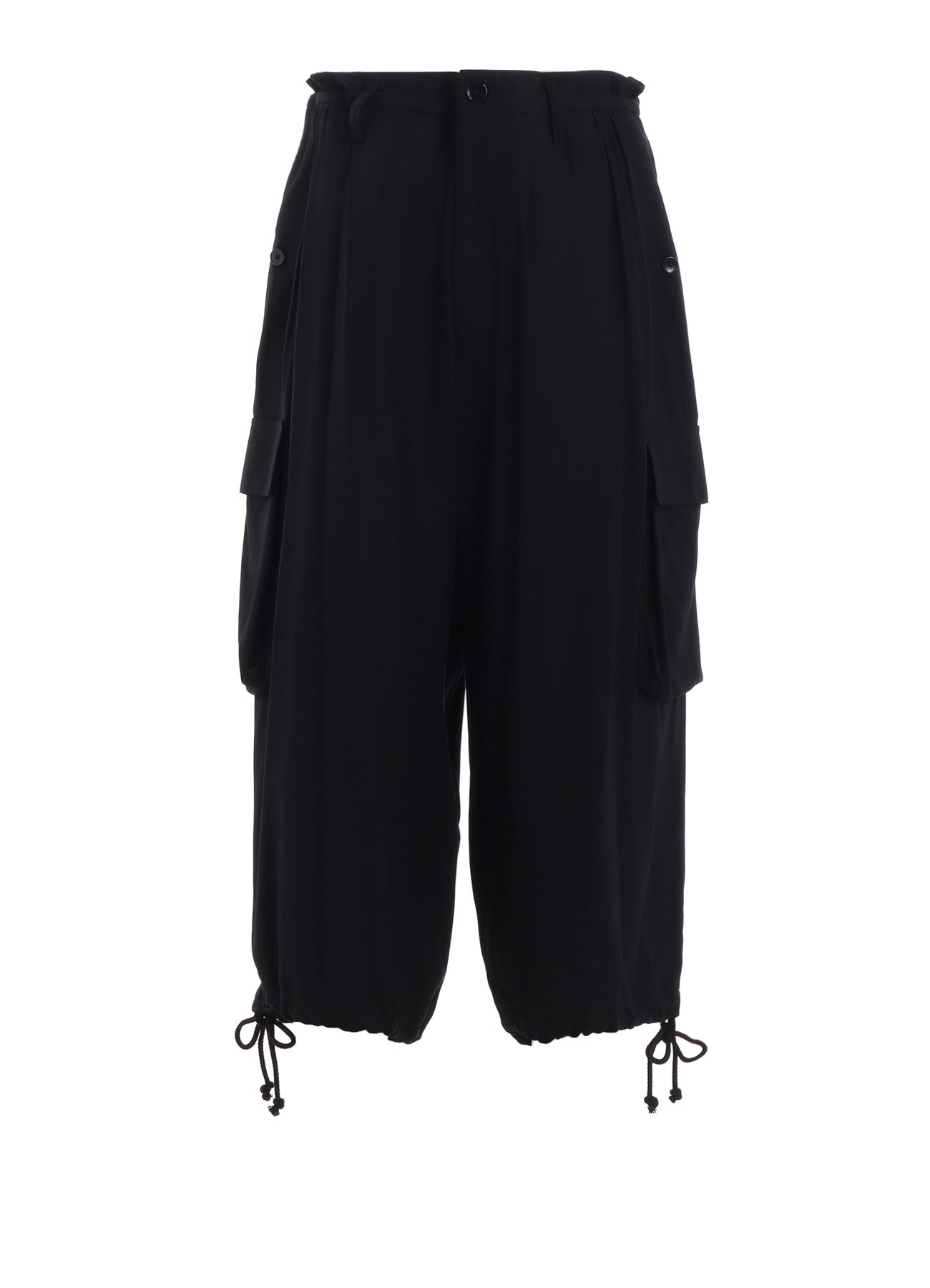Ground Y's 2025 Spring/Summer collection features cropped cargo pants. These pants use a gathered waist instead of pleats for volume and a design accent, while adjustable drawstrings run through the hems. Crafted from lightweight rayon fabric, they provide a breezy impression for the spring and summer seasons.