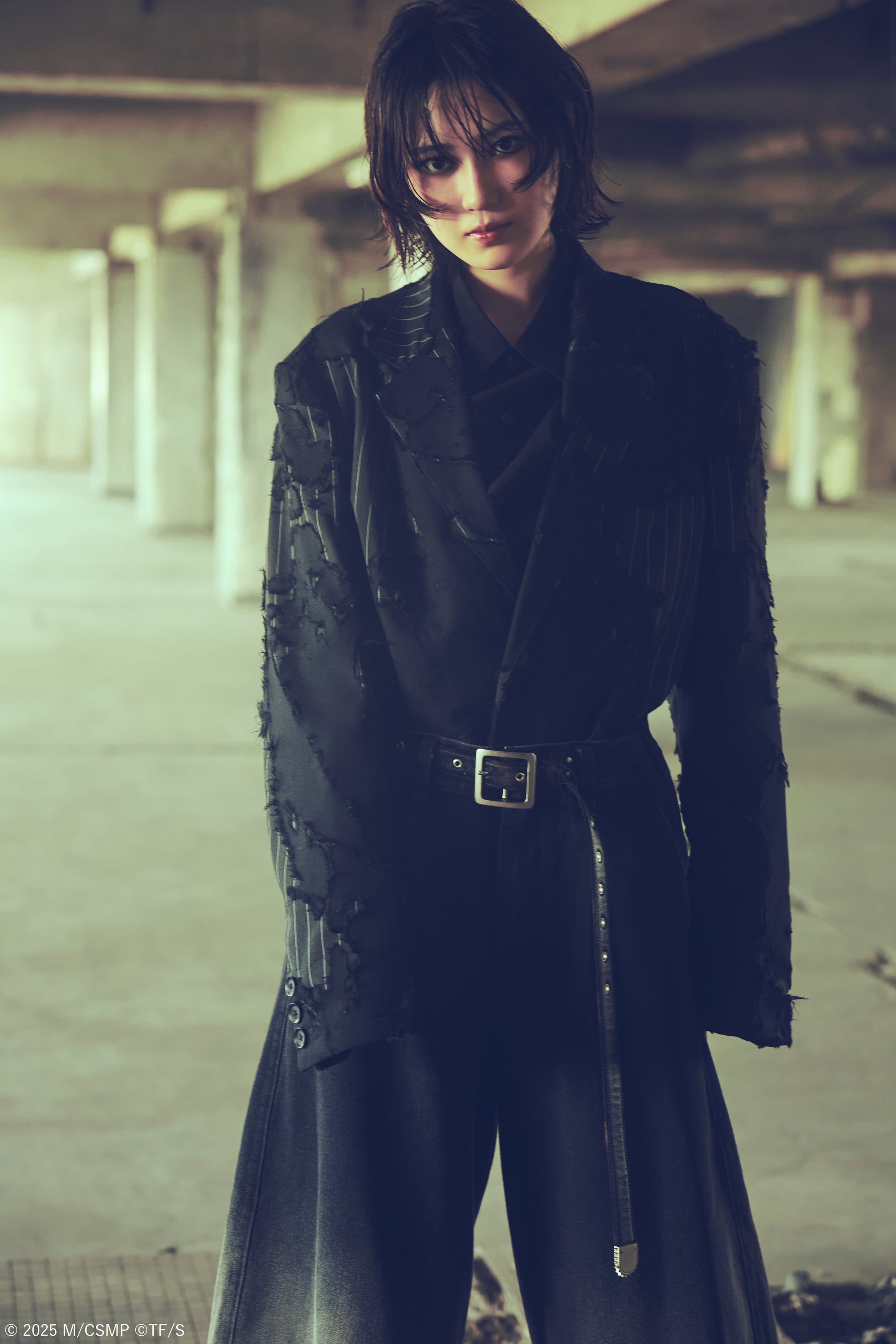 Ground Y collaborates with the movie "Chainsaw Man: Reze Arc" to create a collection expressing the film's world. Using black denim, the wide pants feature a refined silhouette and detailed design, enhanced by bleaching for a unique texture.