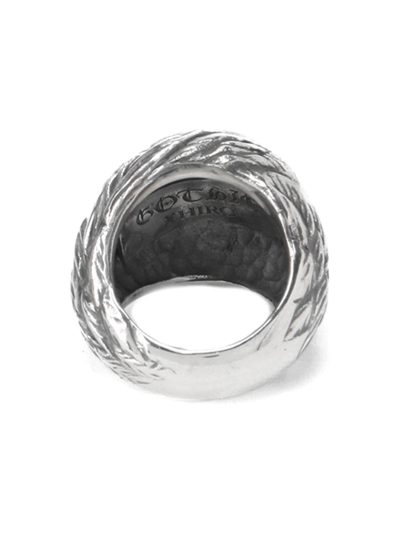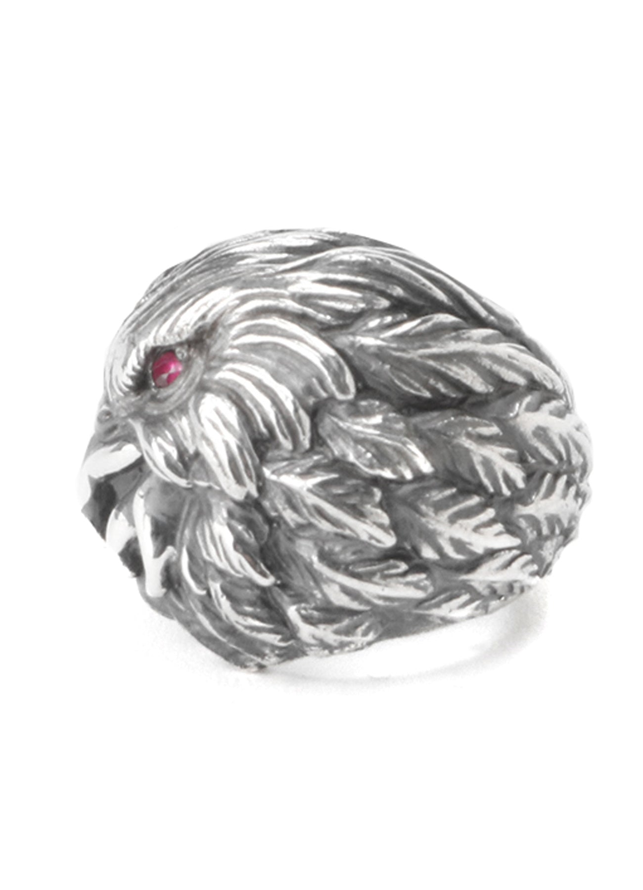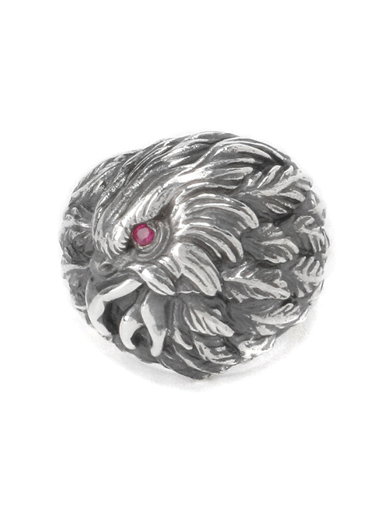 This is a ring inspired by an eagle, featuring synthetic ruby eyes.