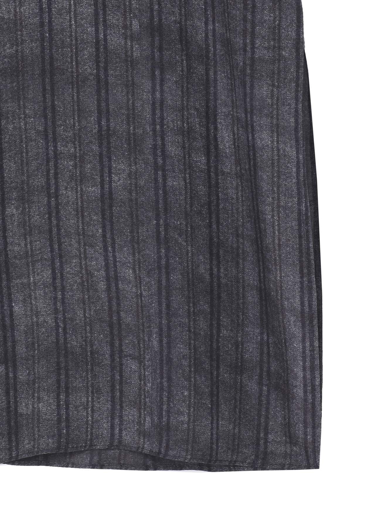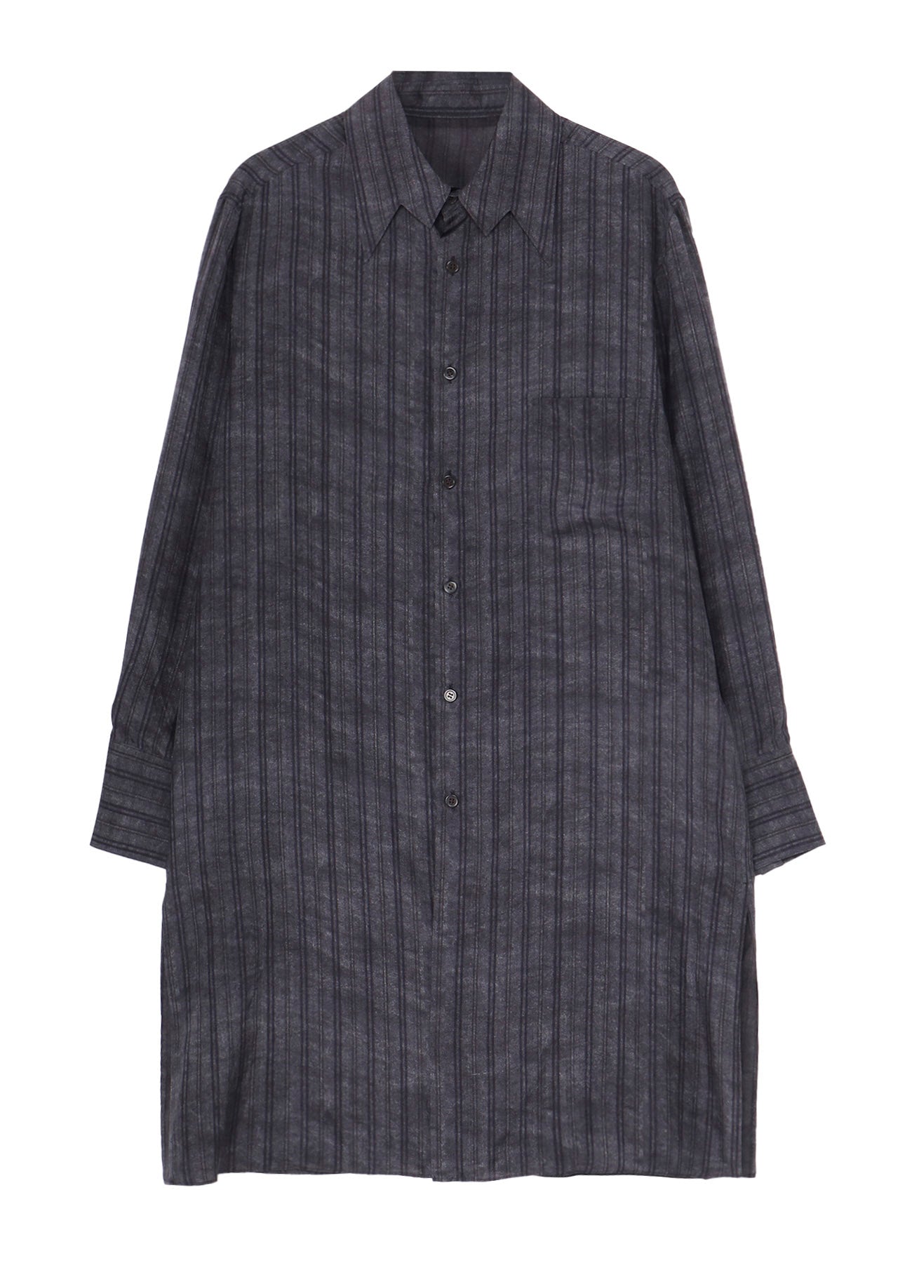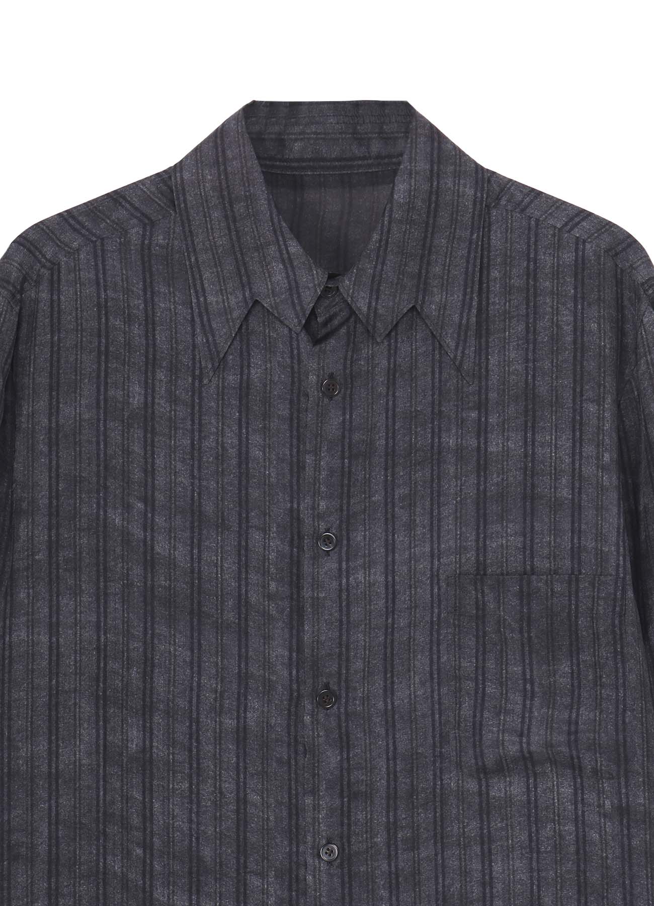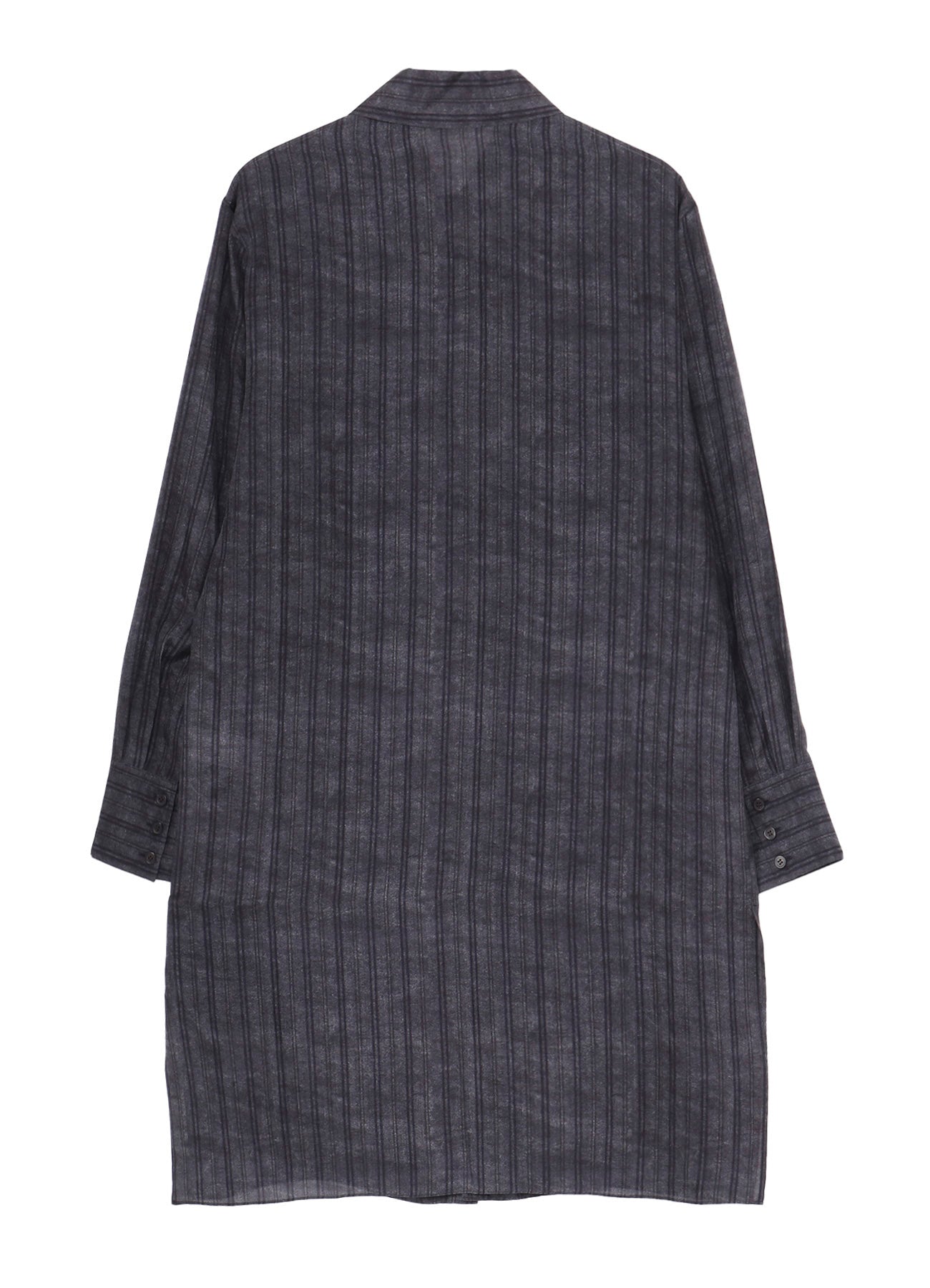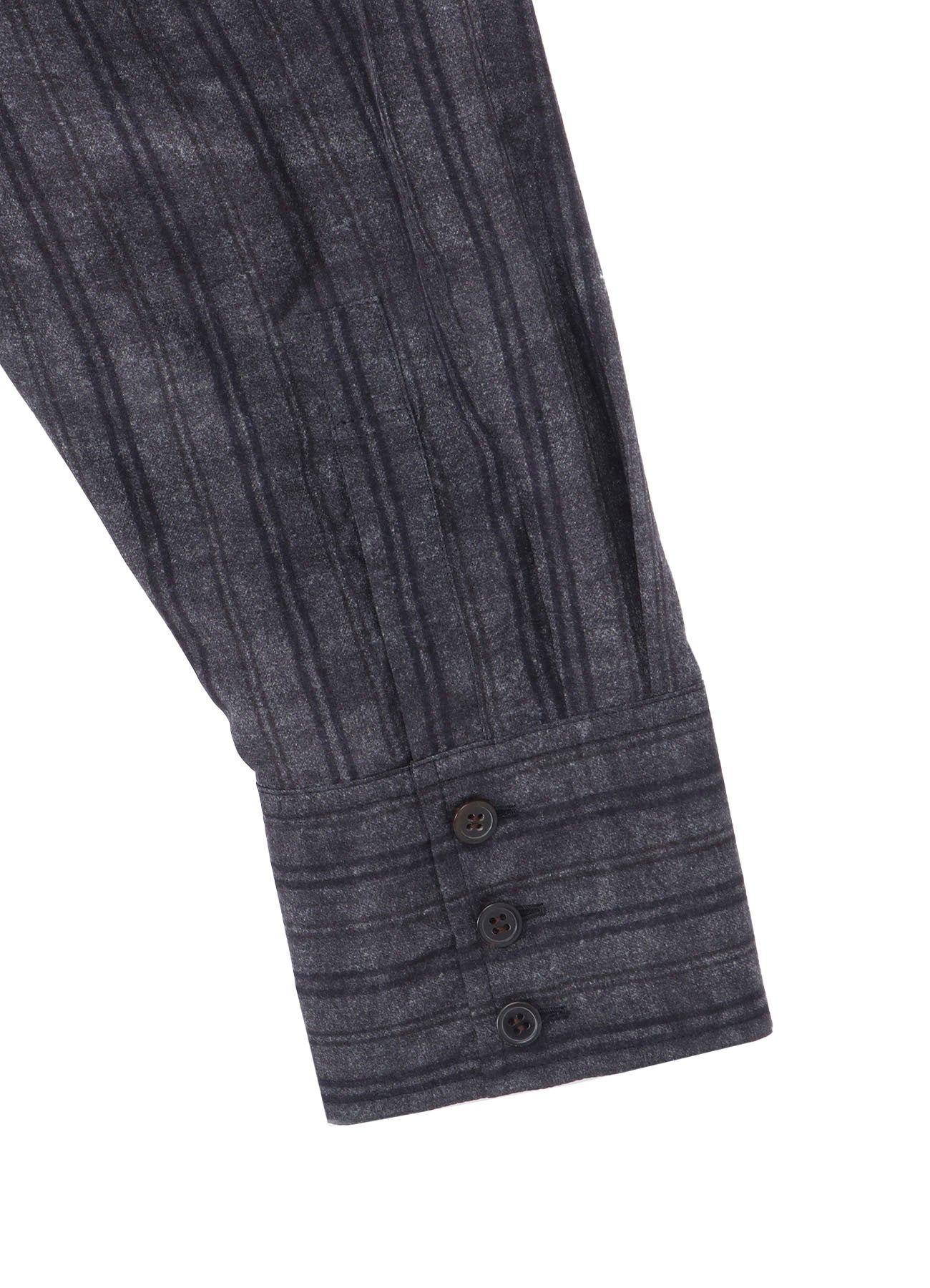 This black blouse, crafted from Habutae fabric, is known for its silky texture and elegant sheen. Featuring a stripe pattern printed via inkjet at a Kyoto facility, it undergoes a unique black dyeing process, resulting in a one-of-a-kind piece.