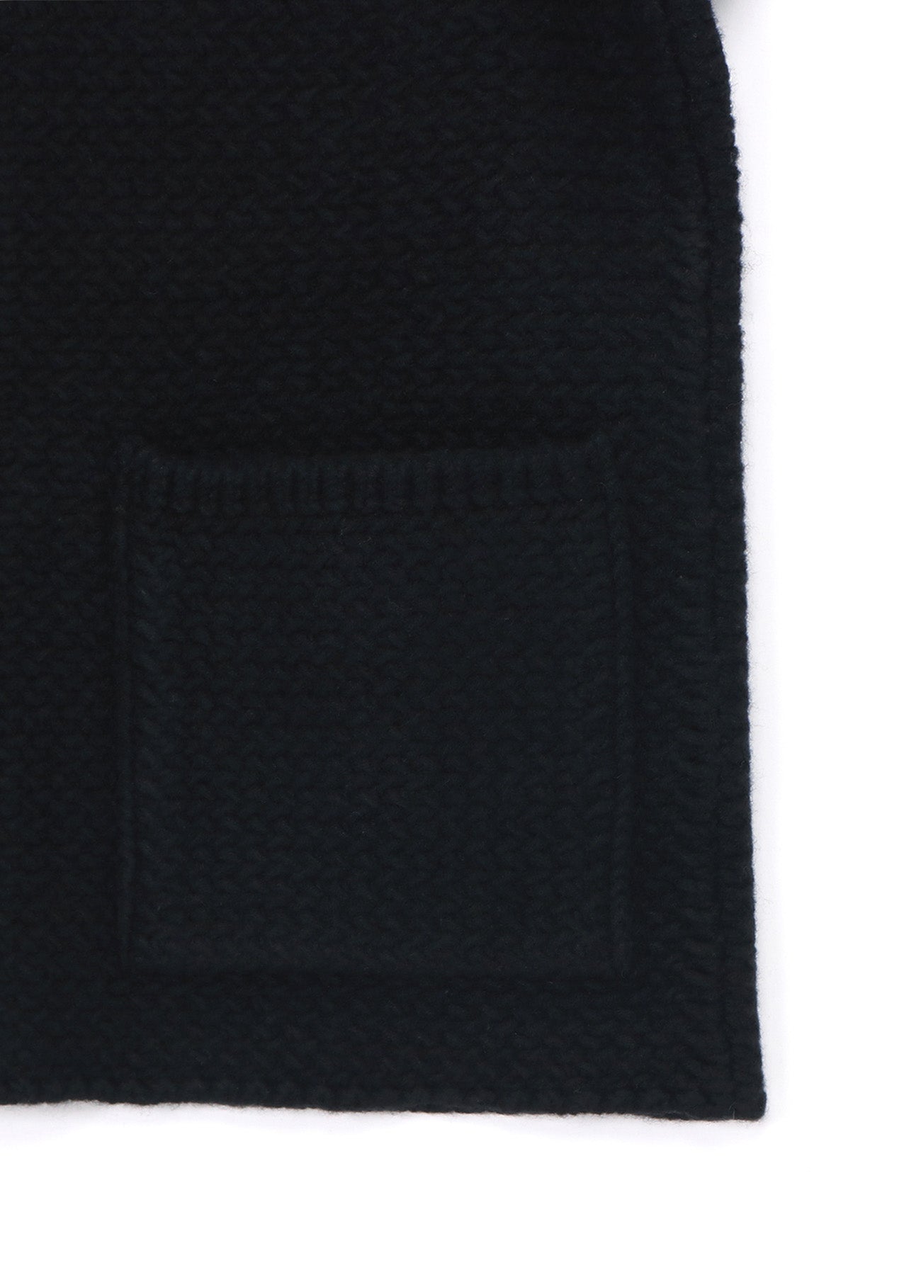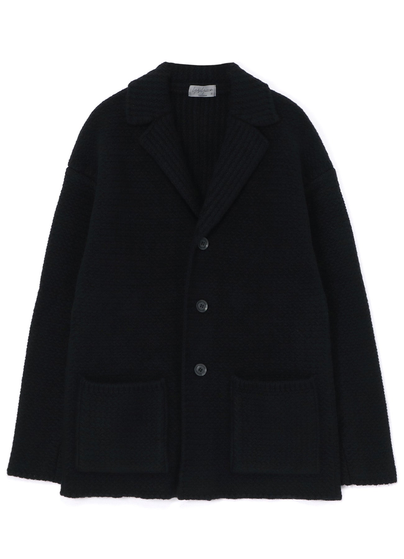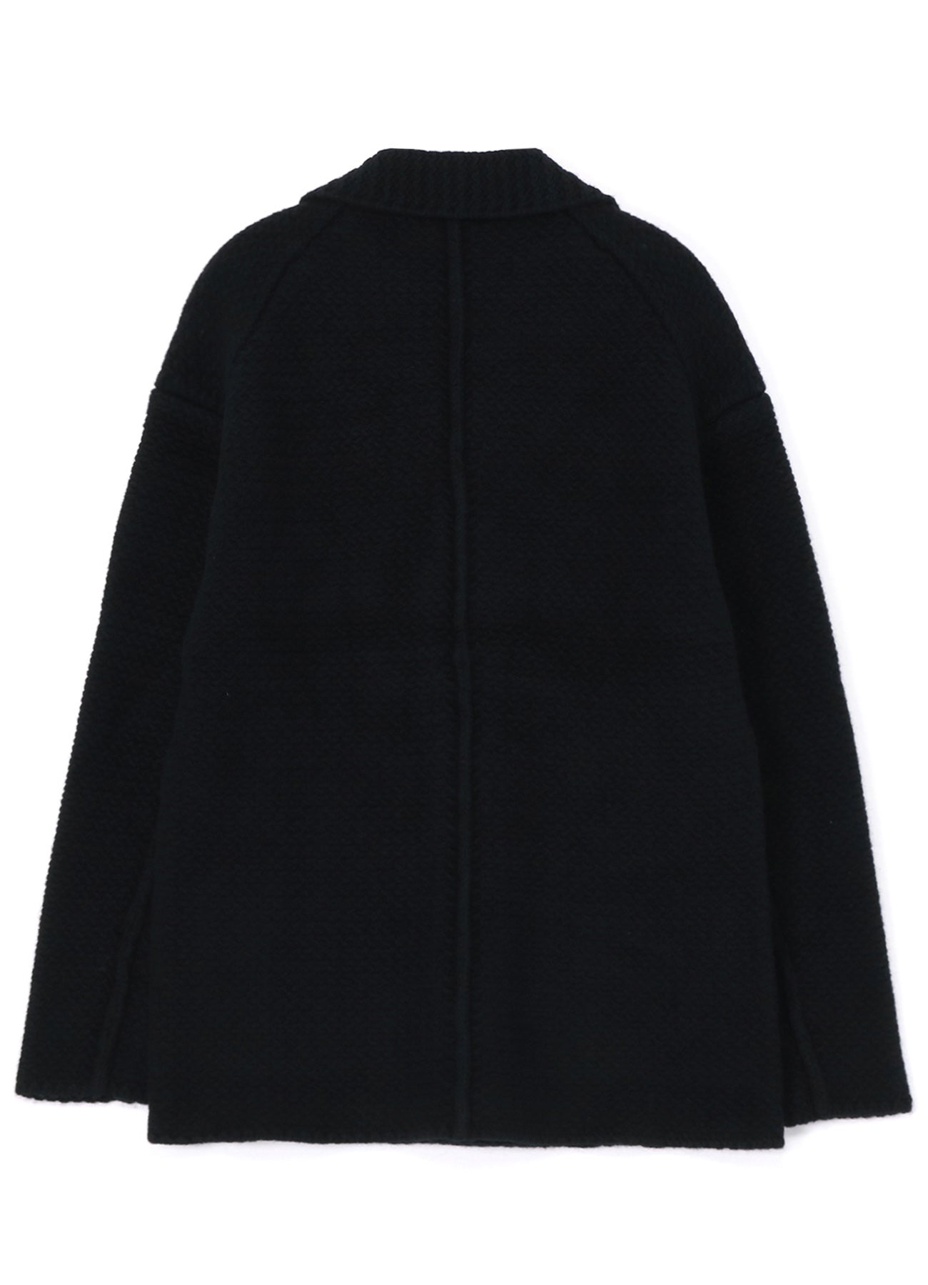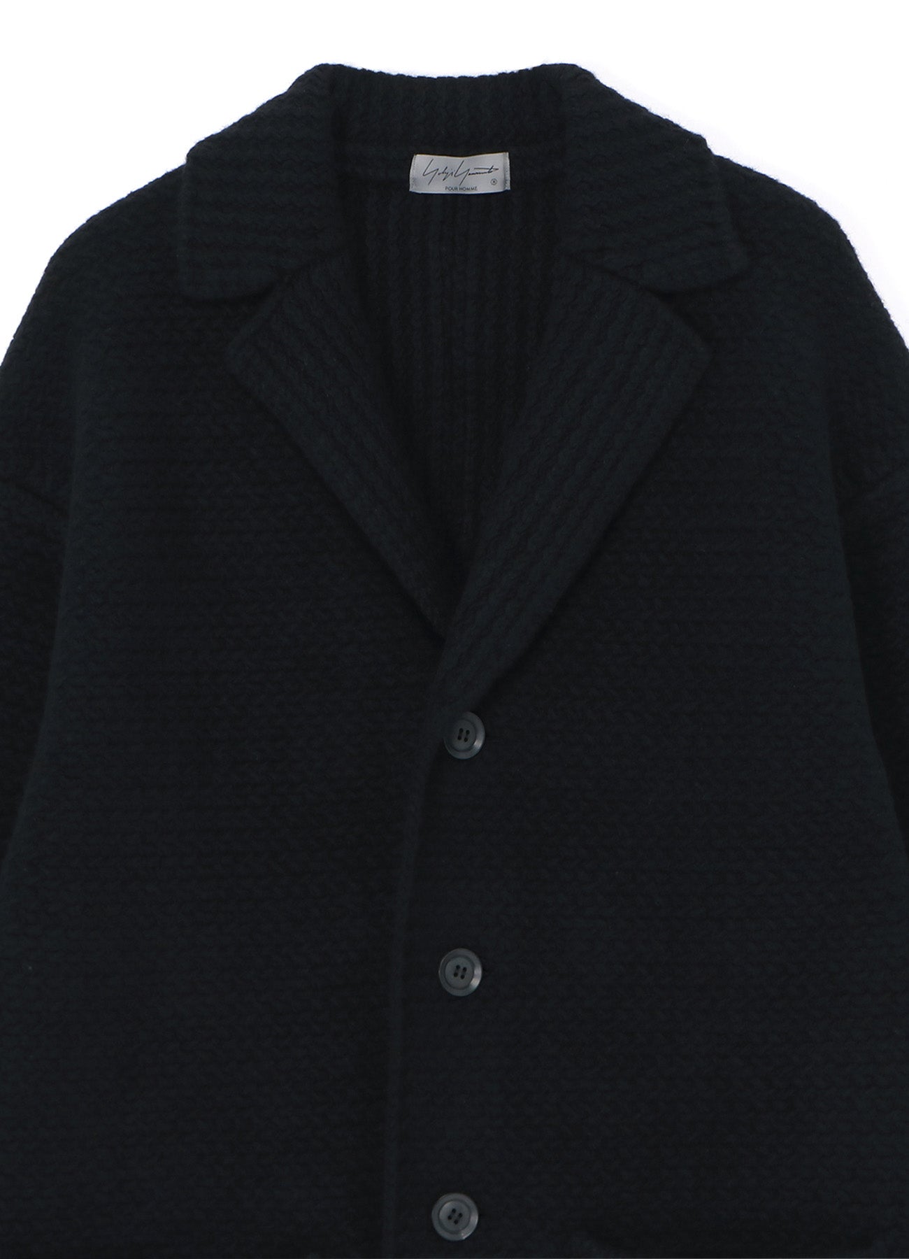 A knitted jacket with a unique pattern creation resulting in different designs on the outer and inner surfaces. The collar's flip reveals the inner pattern, incorporating both designs into the overall aesthetic.