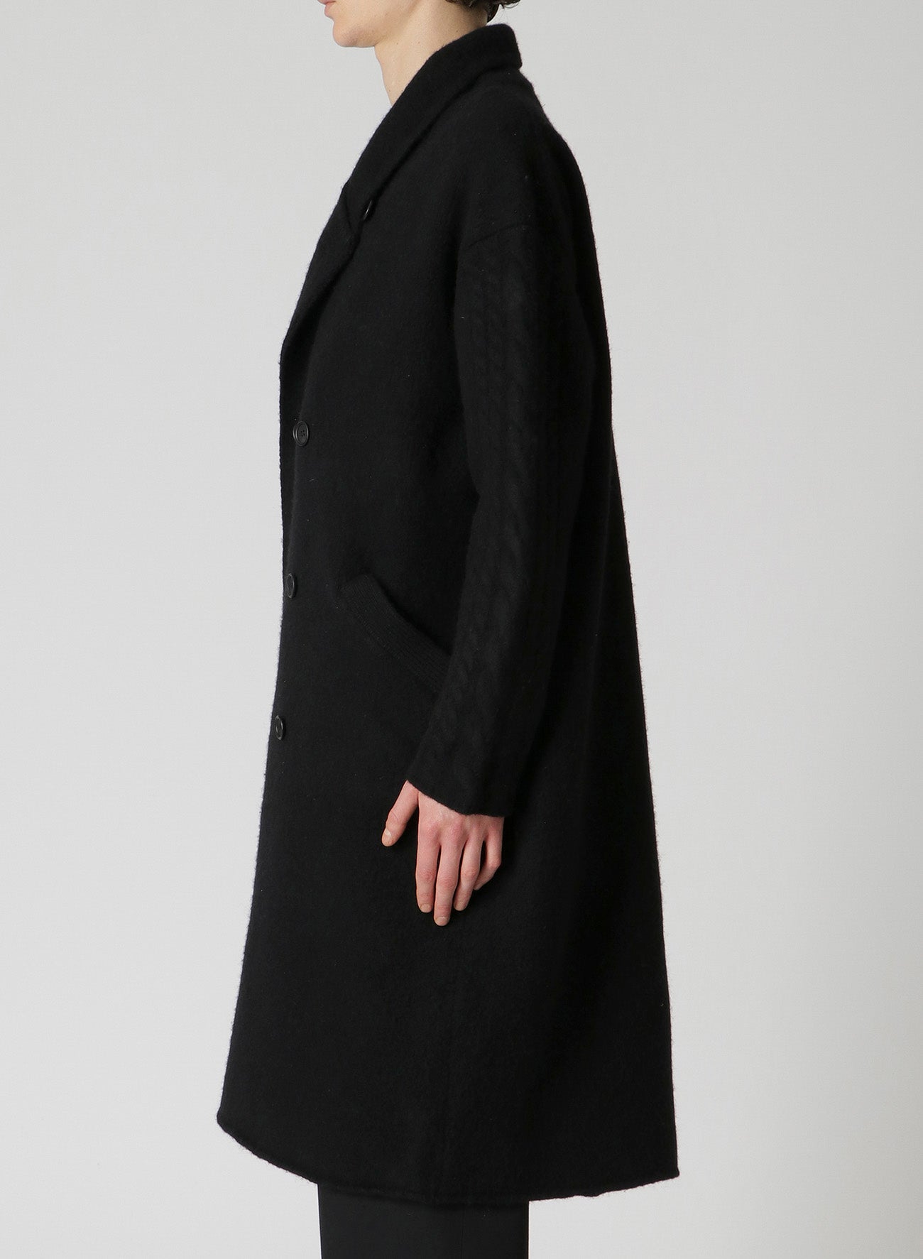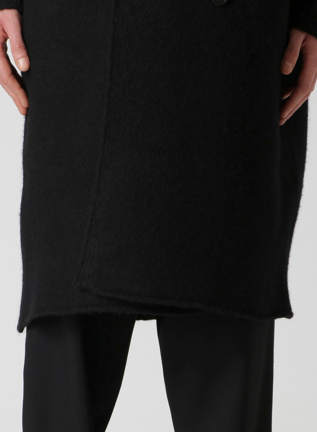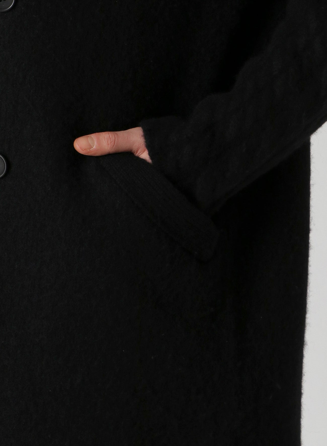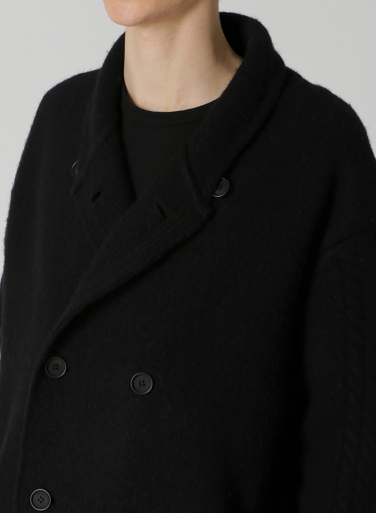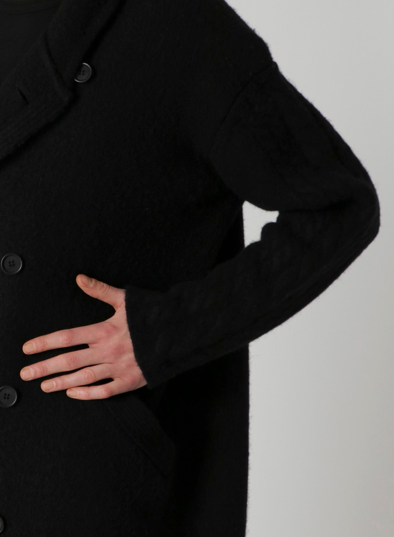 This coat features a shawl collar and has undergone fulling to give it a felt-like texture. Made with a soft, voluminous yarn, the tightly packed fibers result in a unique touch. Perfect for a sophisticated and tactile wardrobe essential.