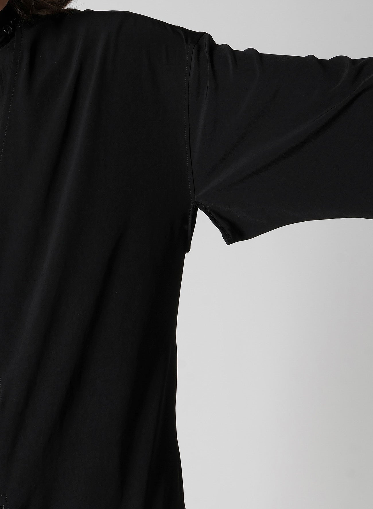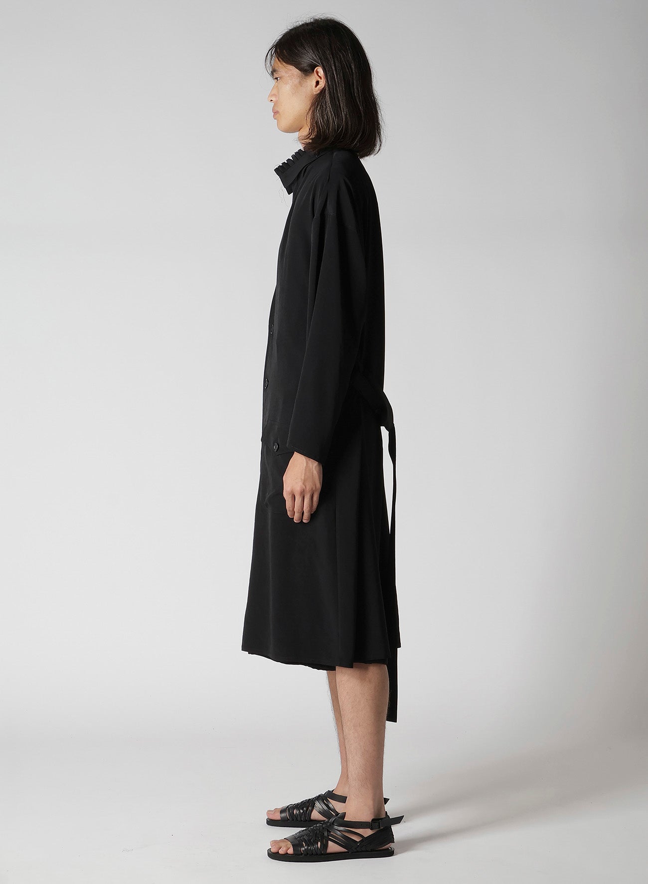 This collarless gown is crafted from triacetate/polyester crepe de Chine, offering a classic Yohji Yamamoto signature material. It features a mild sheen and luxurious feel, characterized by a rich drapery created through a plain weave using Strong-Twist yarns.