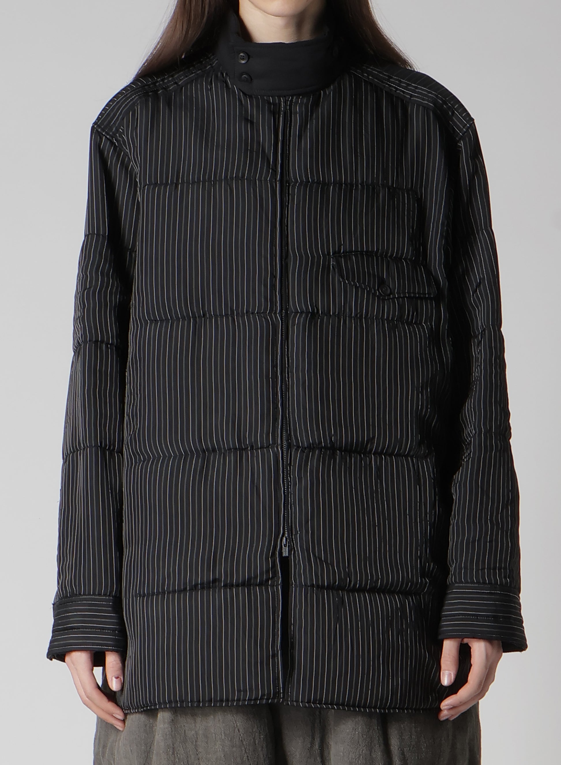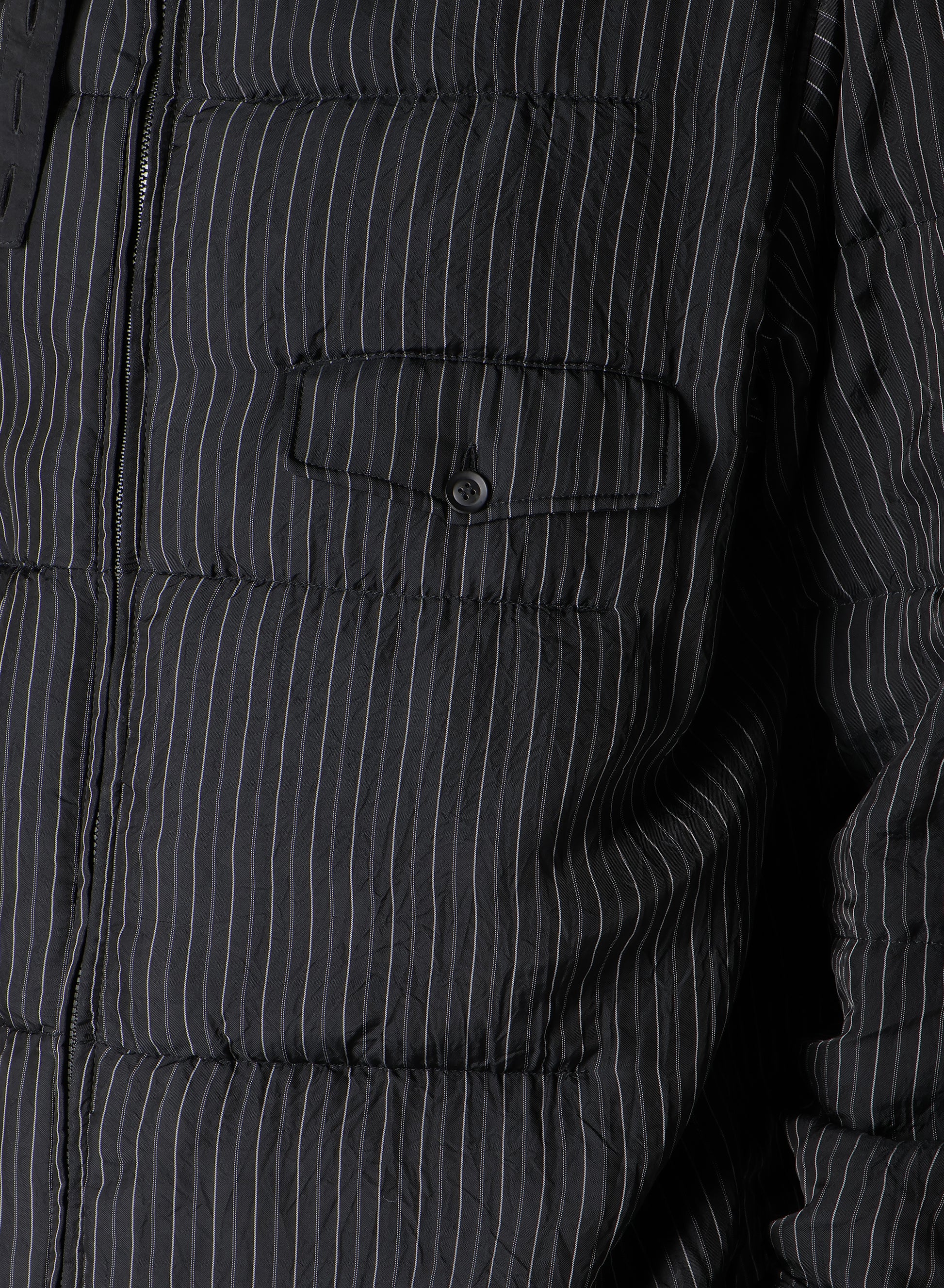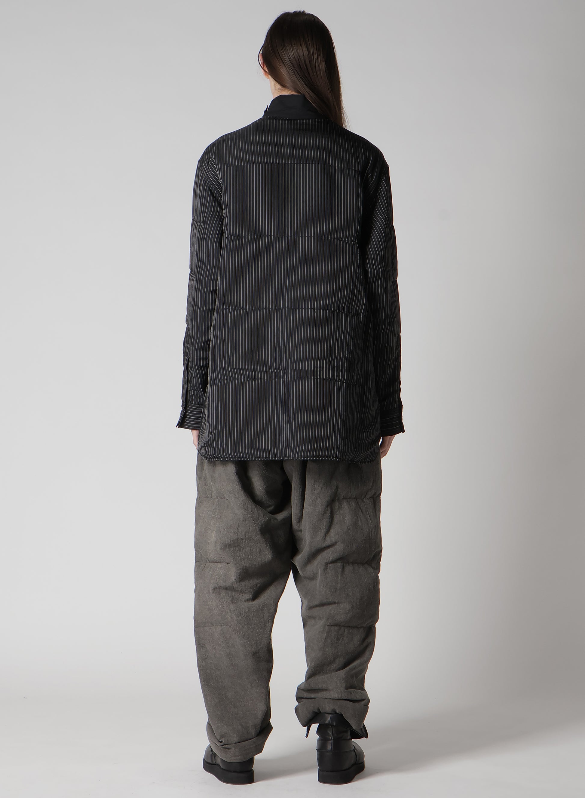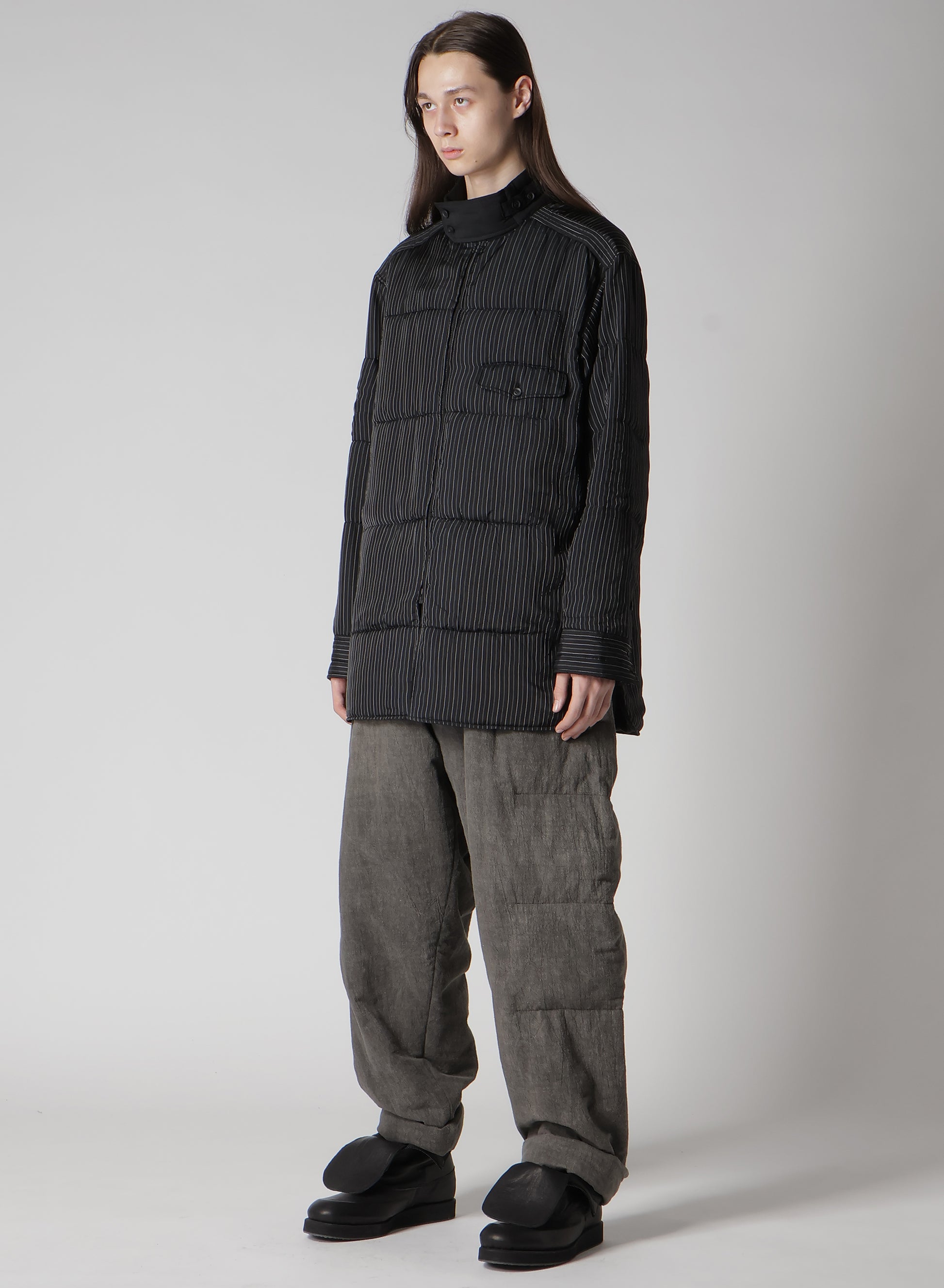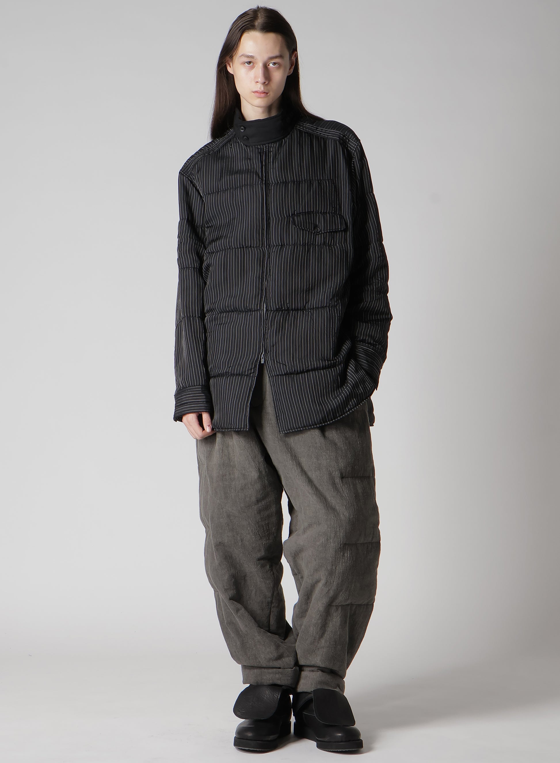 Look 31 of the Yohji Yamamoto POUR HOMME A/W 2025-26 collection features a striking padded blouse with a striped pattern. Made from Yarn-Dyed cupro with dobby stripes, it offers excellent moisture absorption and a sleek touch, enhanced by a Soft-washed finish providing a unique wrinkled texture.