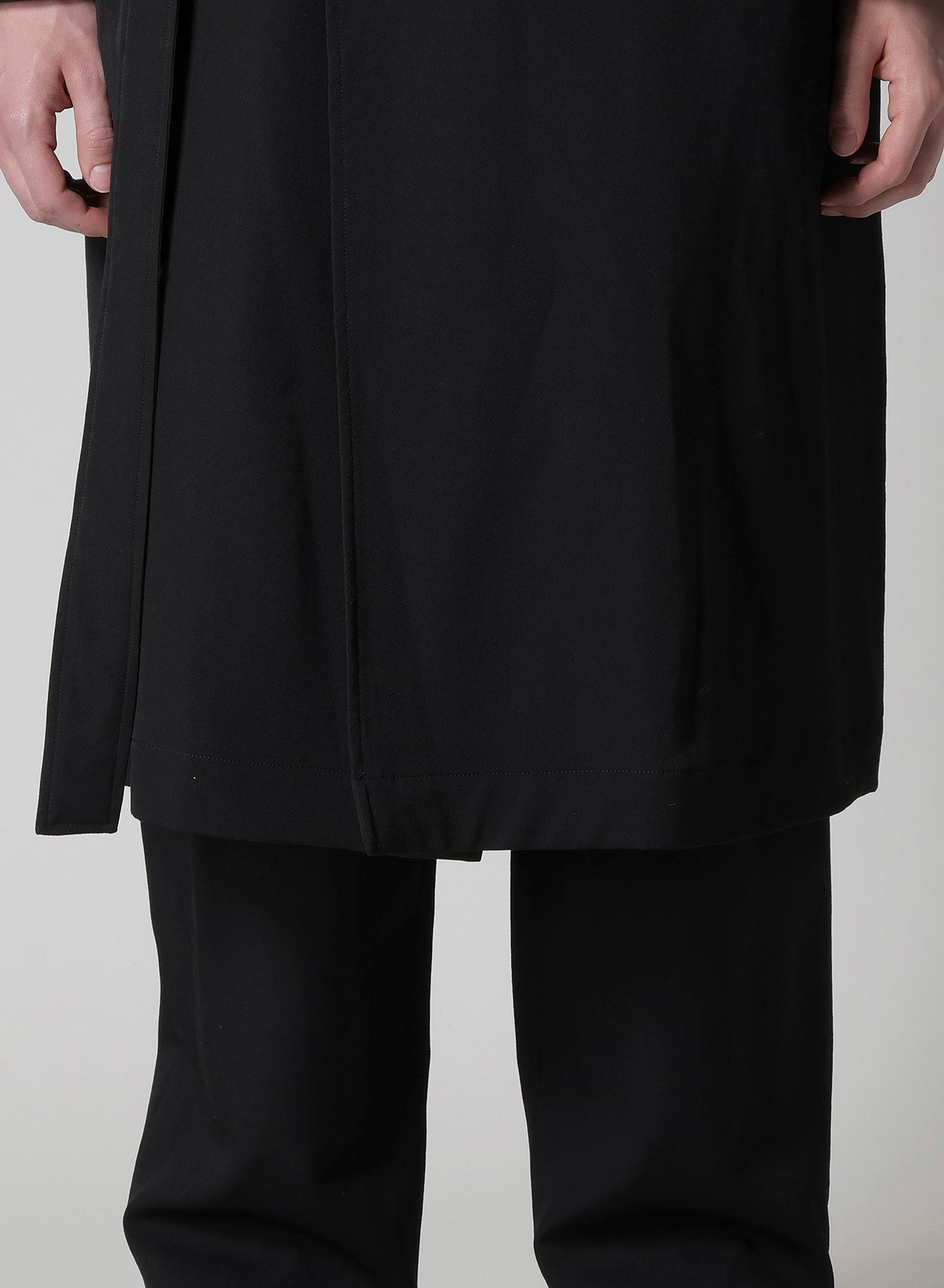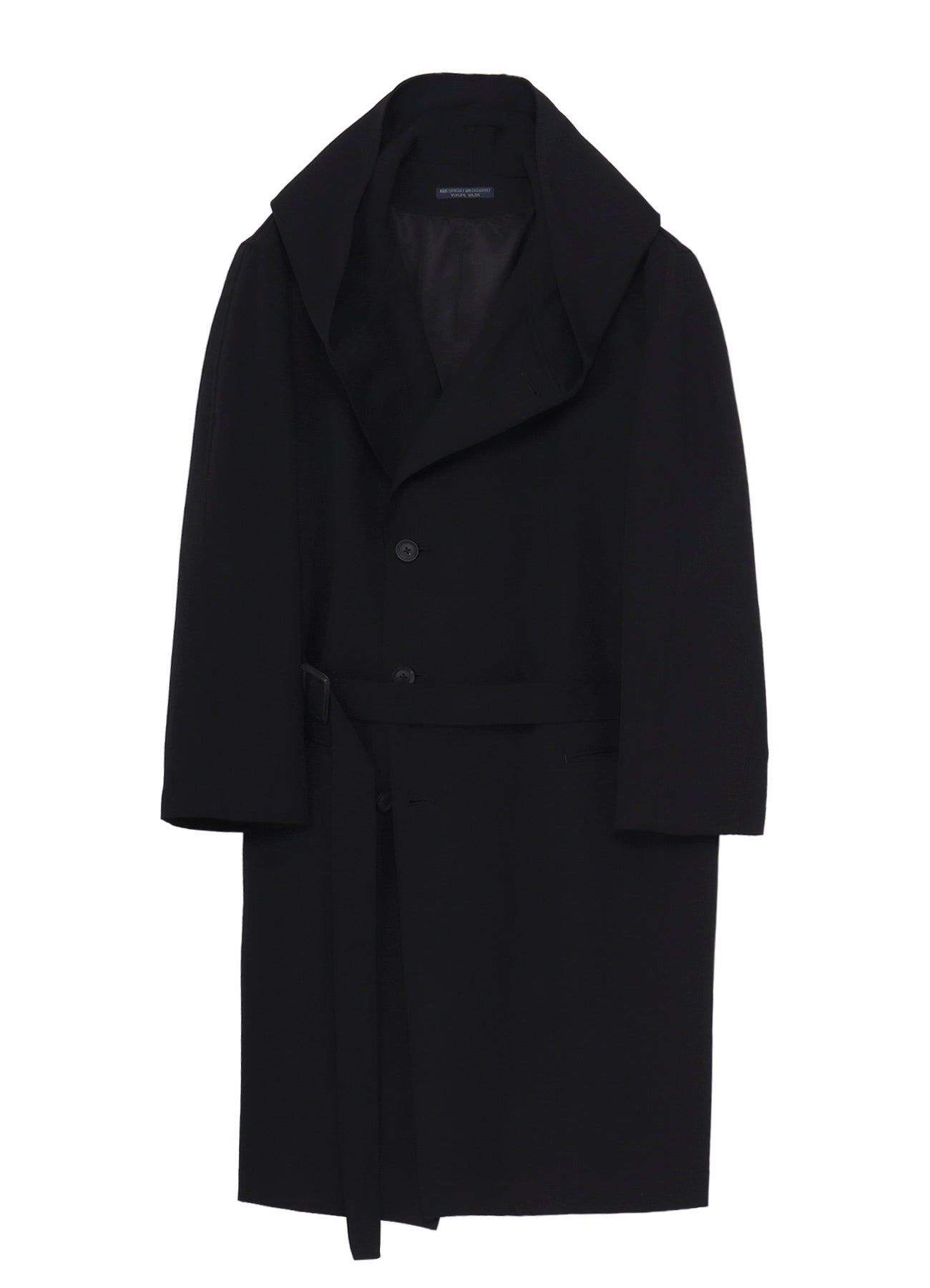 A double-hooded coat designed by Yohji Yamamoto, made from luxurious wool gabardine. Emphasizing minimalistic design, this coat beautifully showcases the silhouette and functionality. The supple and shiny wool gabardine creates a distinct drapery.