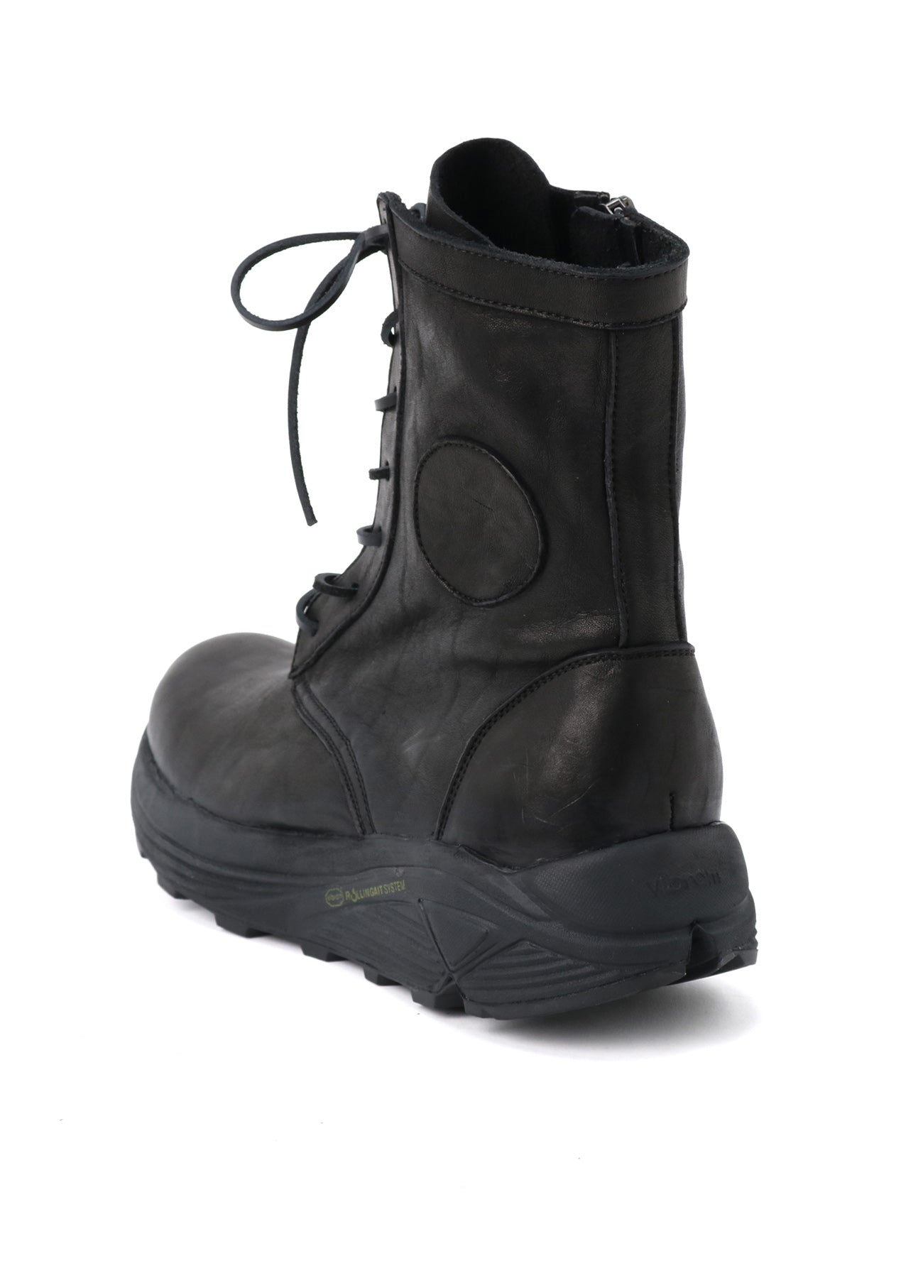 These combat sneakers feature premium Japanese shoulder leather and a post-attached sole with a unique design. The upper has been garment dyed, and the lightweight Vibram sole provides an unexpected light feel, contrasting the heavy-duty look of the shoe.